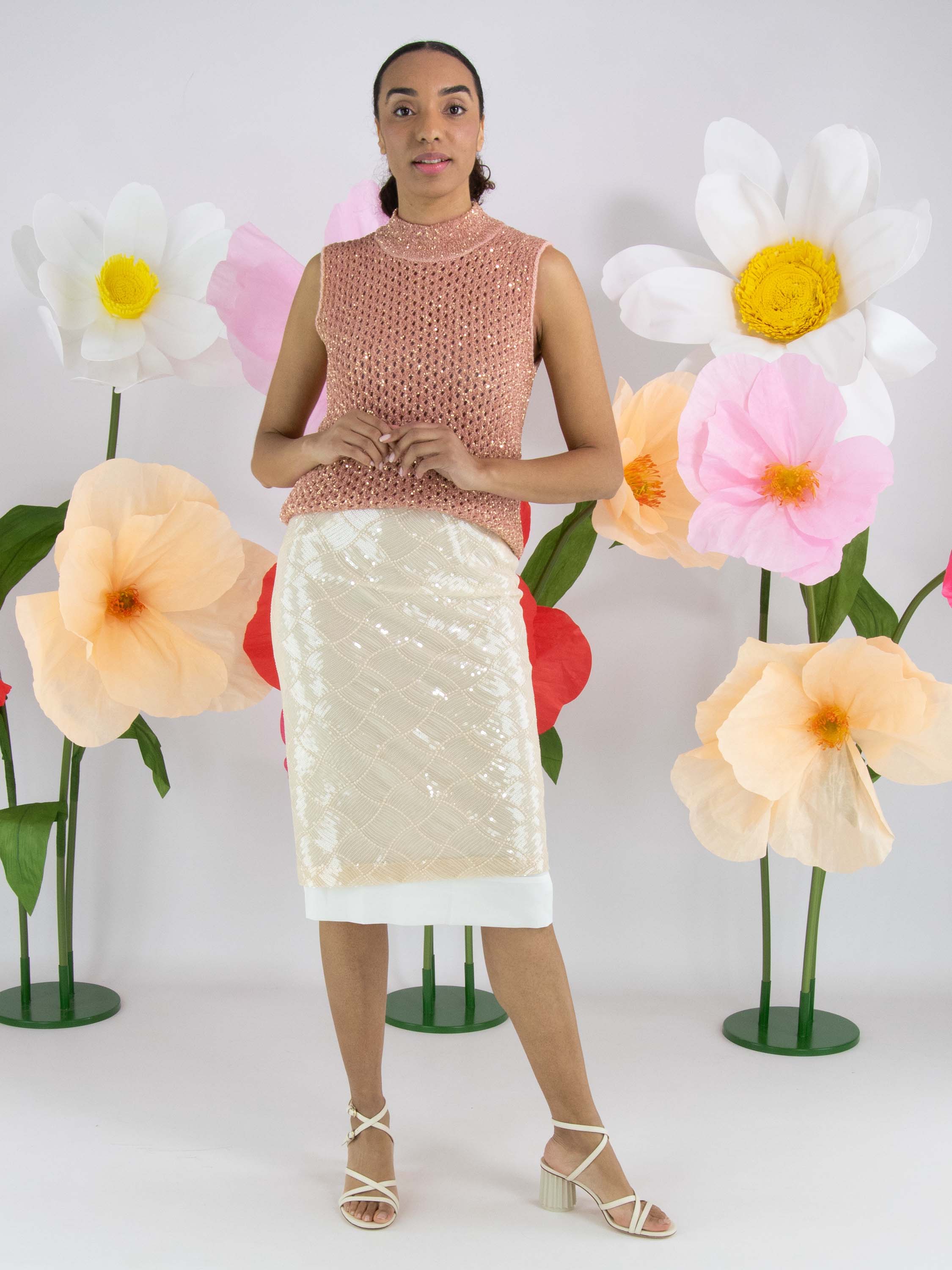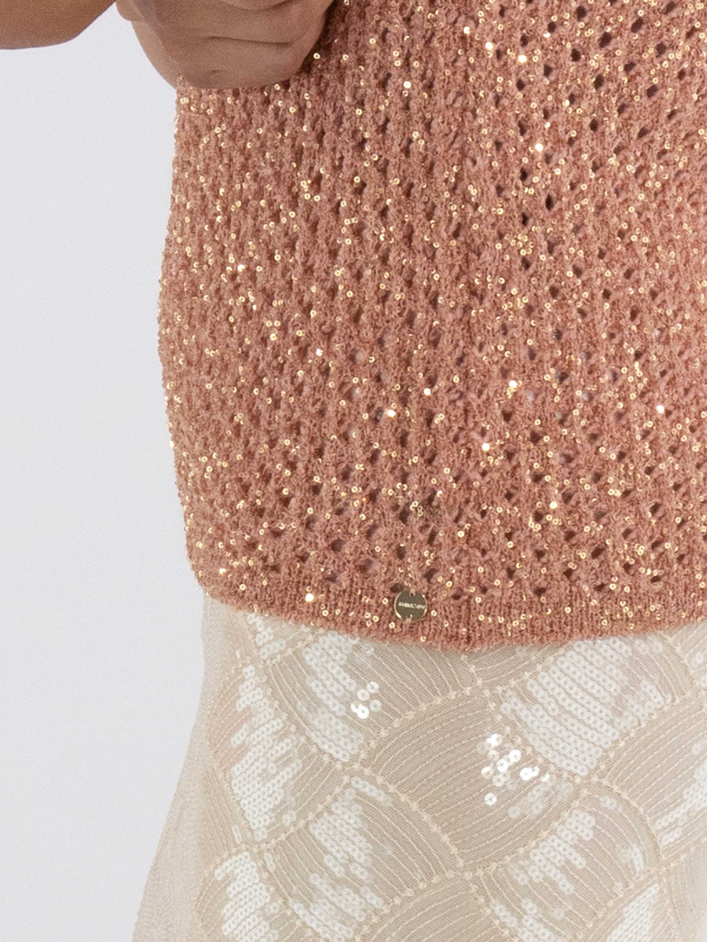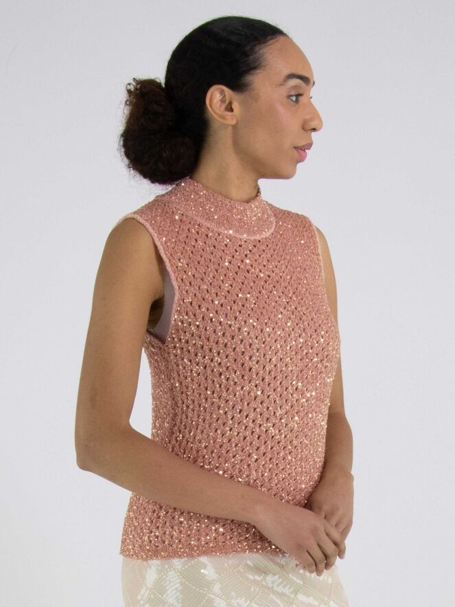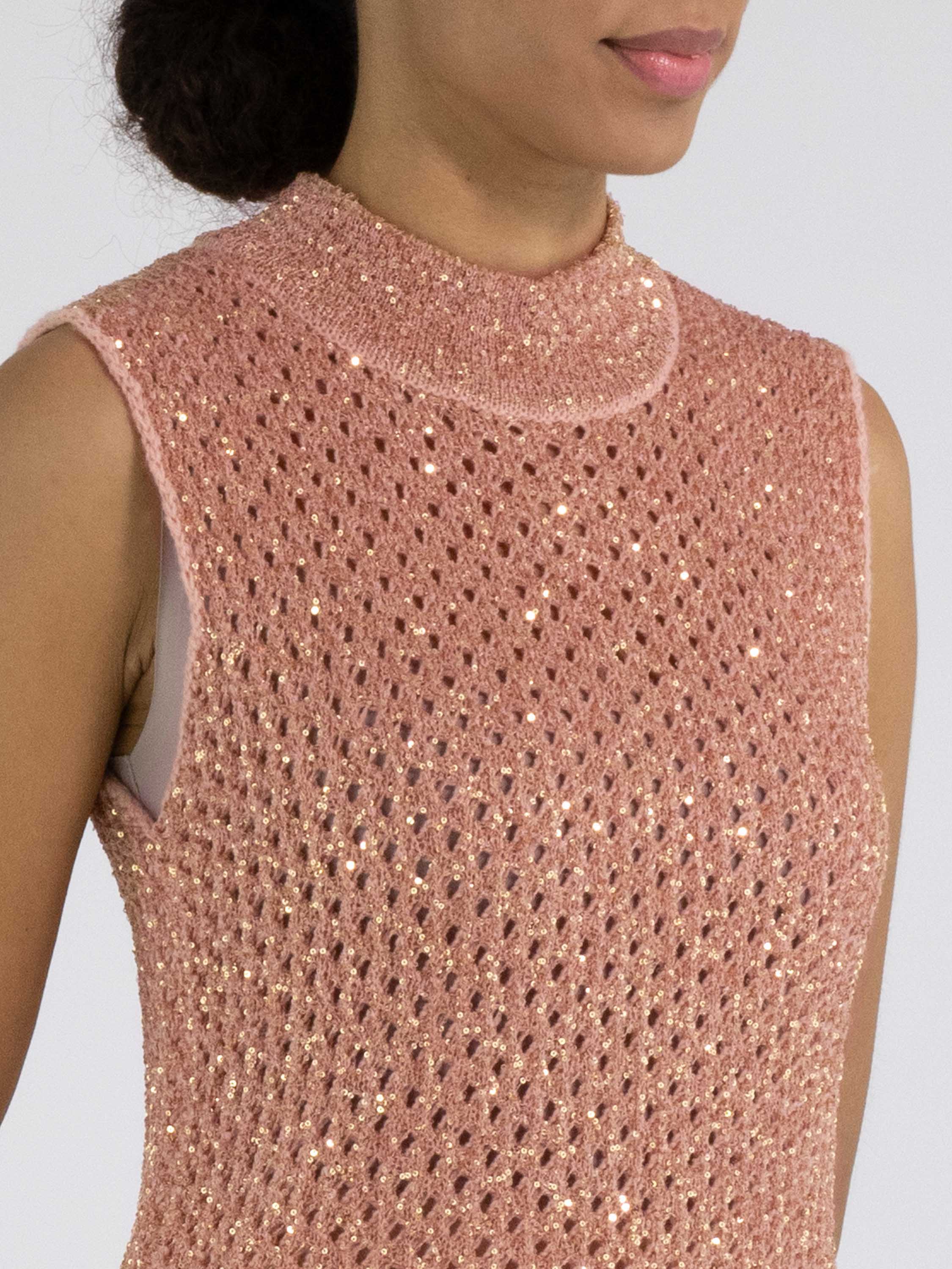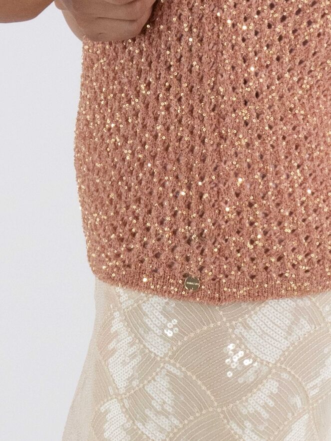 An open-knit sleeveless sweater from Marc Cain in salmon pink. Gold-colored sequins are woven into the fabric. The sweater has a turtle neckline and can be hand-washed.