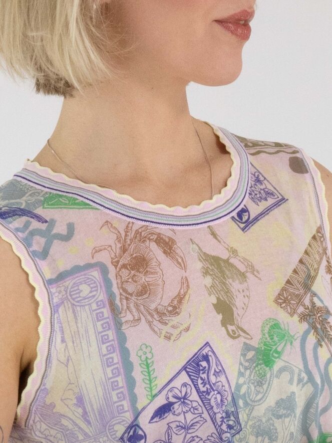 A lightly transparent top by Marc Cain featuring a stamp print in various pastel shades such as yellow, green and blue on a pink background. Along the edge of the round neckline and the armholes, a wavy finely ribbed knit trim is applied in a striped pattern in yellow and pink. This top can be washed at 30 degrees.