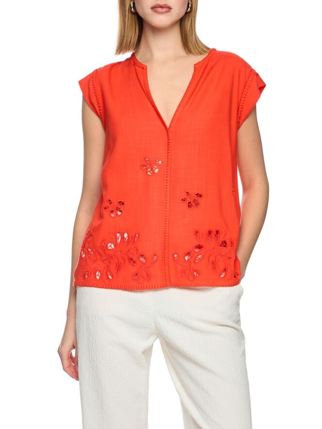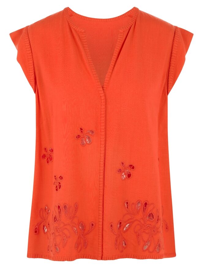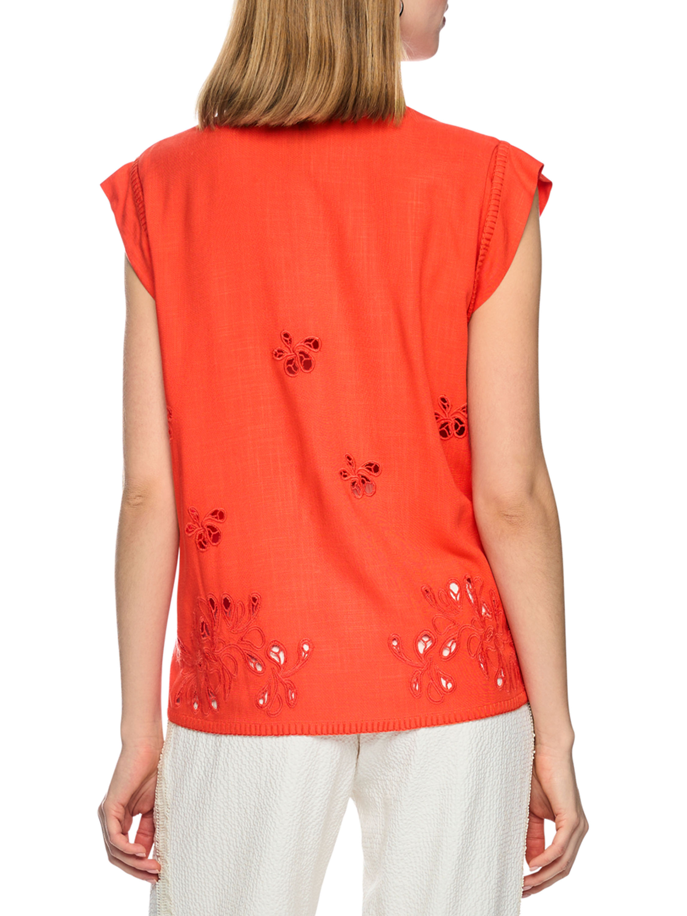 Top by Marc Cain in a coral red shade. From the point of the V-neckline, a decorative inverted seam runs along the hem, adding a subtle graphic detail. Floral cut-out patterns appear on both the front and back, giving the piece a light and summery feel. This top should be hand-washed.