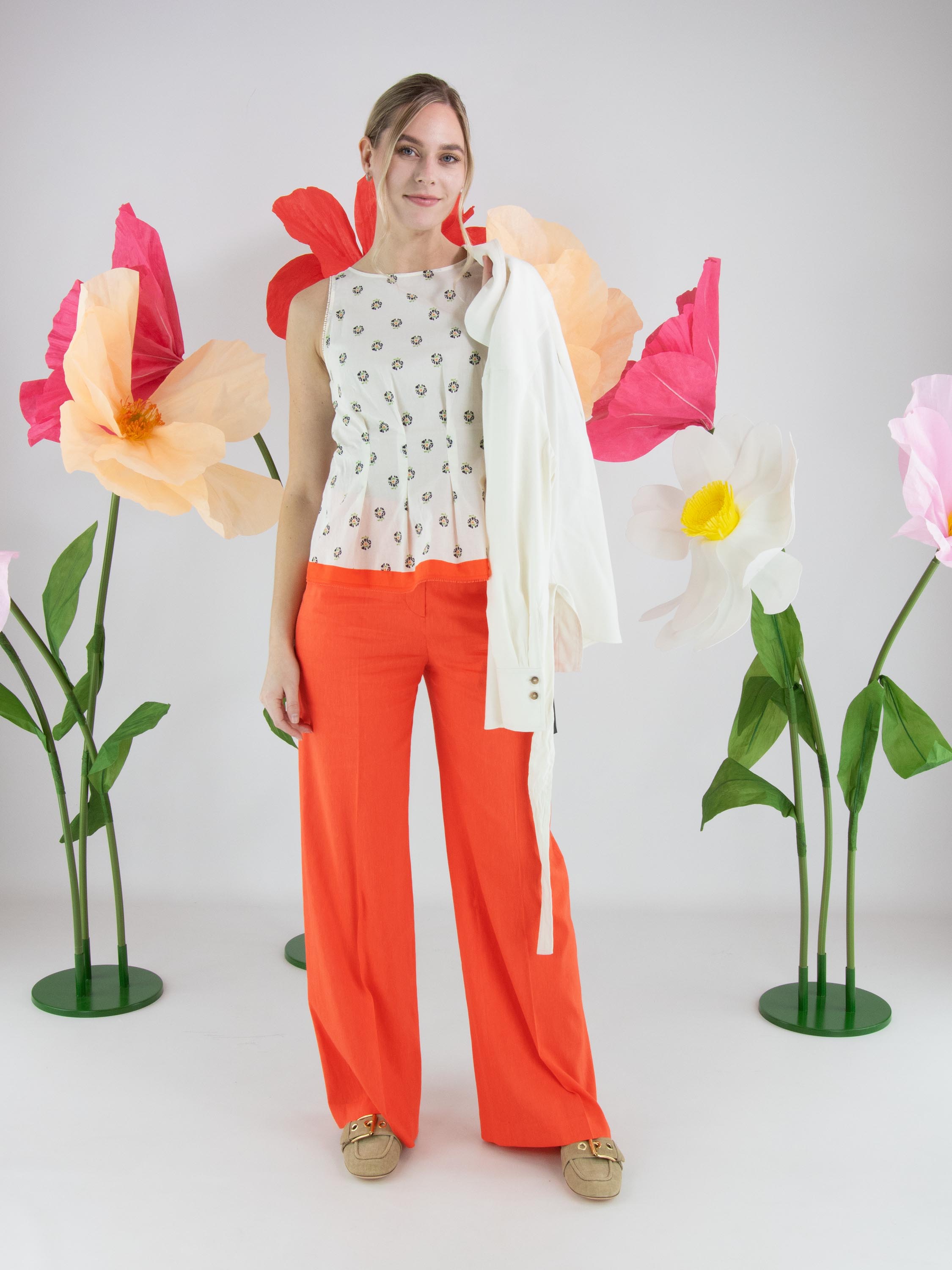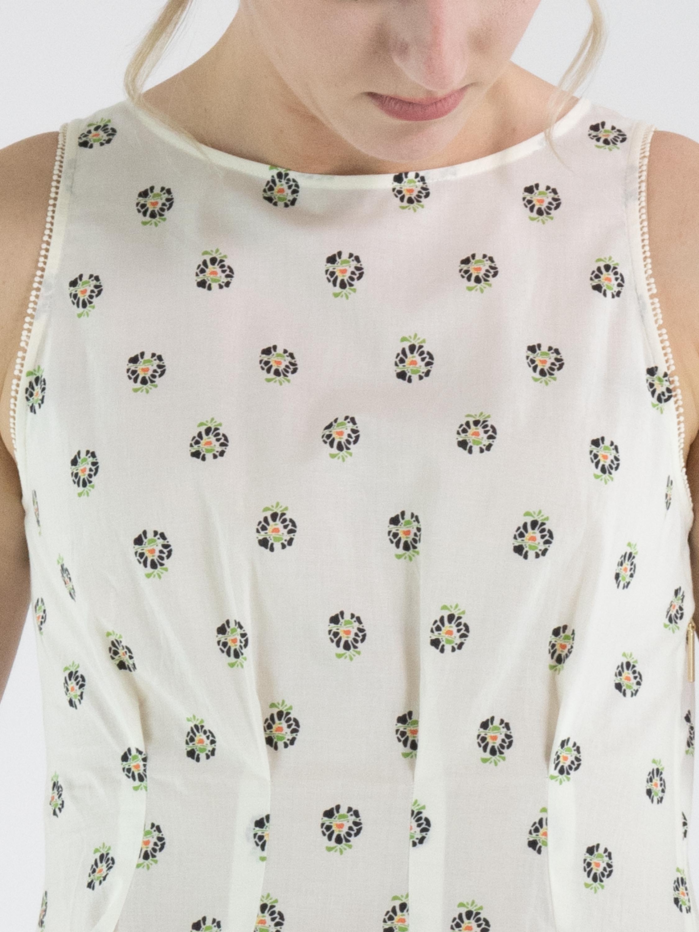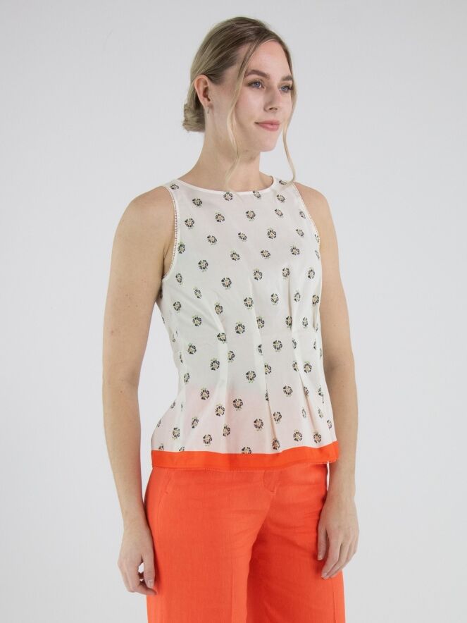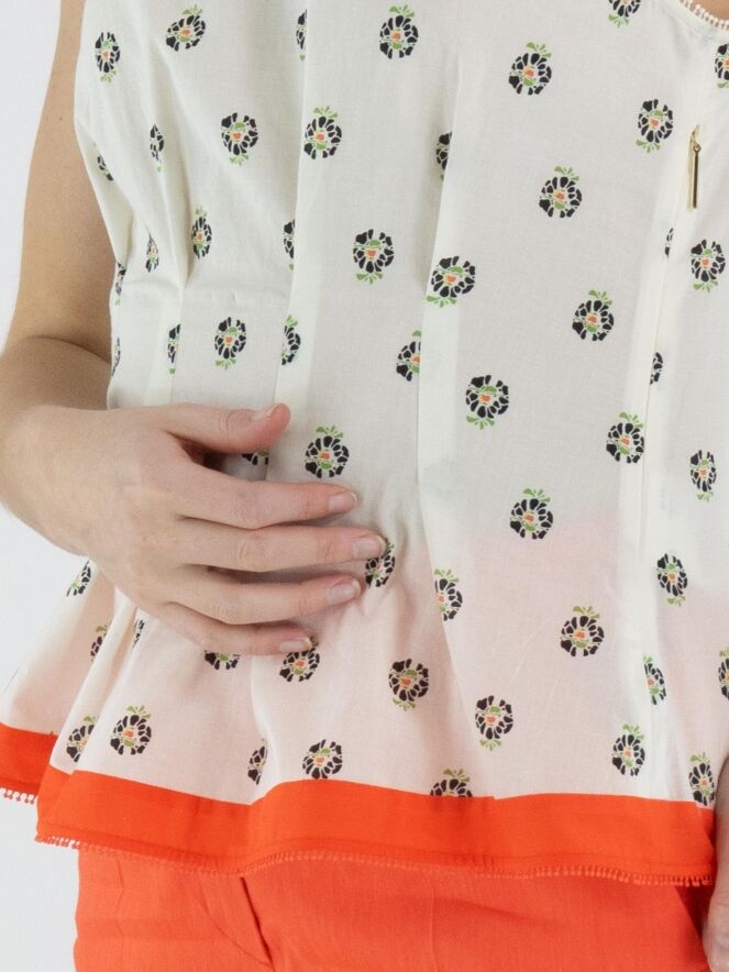 Top by Marc Cain featuring a delicate floral motif in green, black, and coral red on an off-white background. A fine mini pompom trim accents the sleeve inserts and hem, adding a playful yet refined touch. The hem is finished with a wide coral red band that provides a bold contrast. A concealed zip runs along the left side from the sleeve seam to the waist. Multiple pleats at the waist enhance the silhouette with a subtle shaping effect. This top can be washed at 30 degrees.