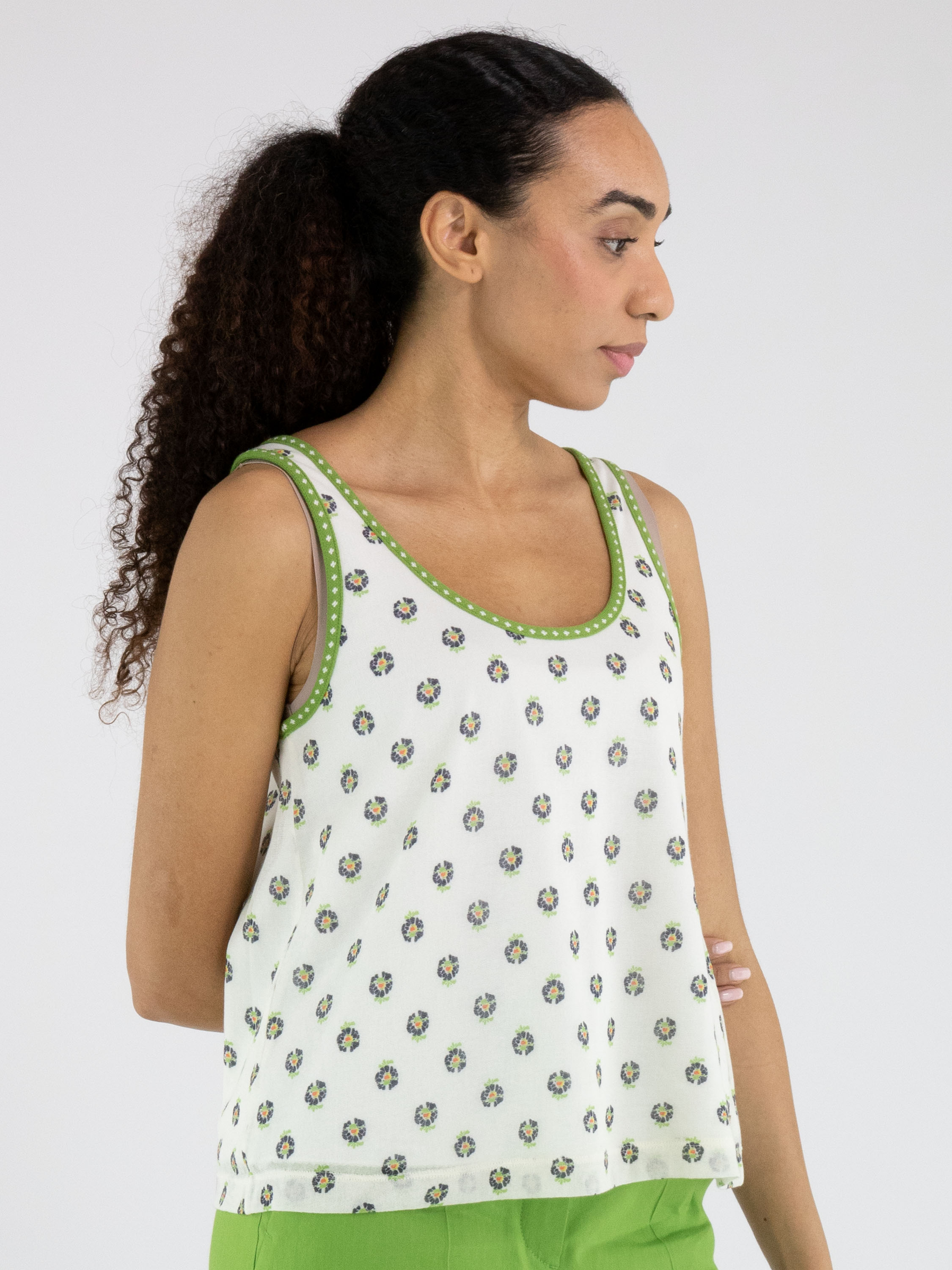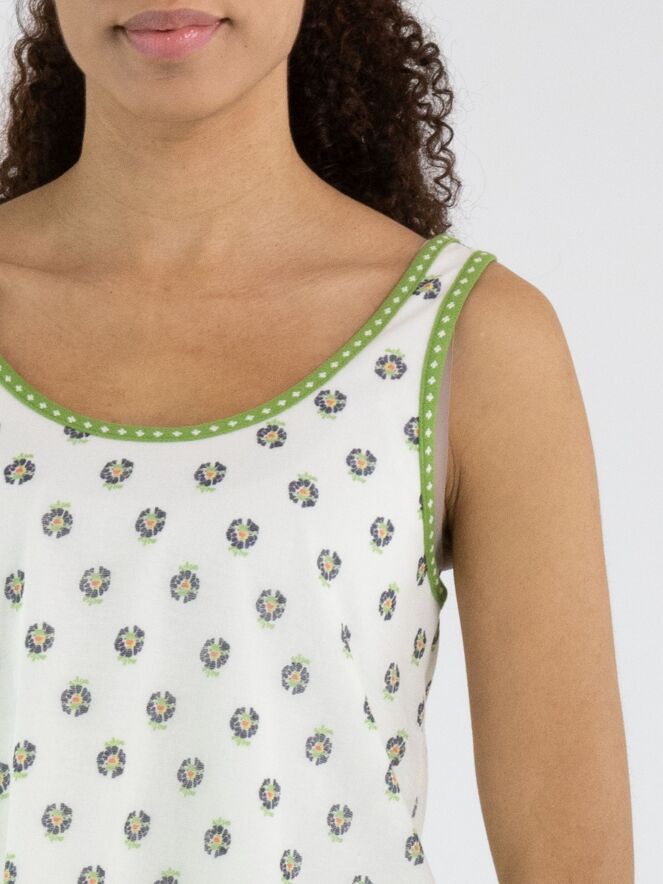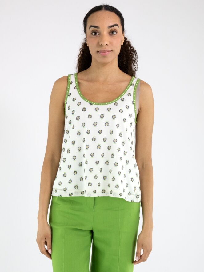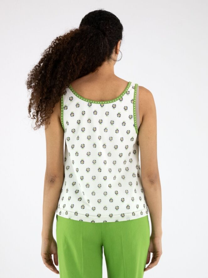 Top by Marc Cain featuring a delicate floral pattern in green, black, and coral red on an off-white background. Designed in two layers, it consists of a solid off-white underlayer and a sheer printed overlay, creating depth and refined elegance. A green trim with white polka dots frames the round neckline and sleeve inserts, adding a playful yet sophisticated detail. This top can be washed at 30 degrees.