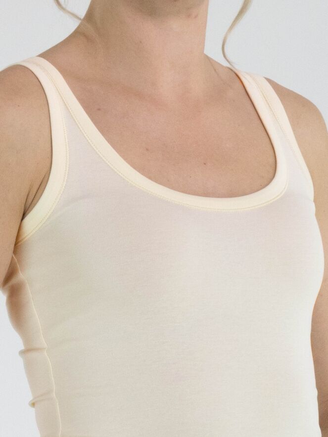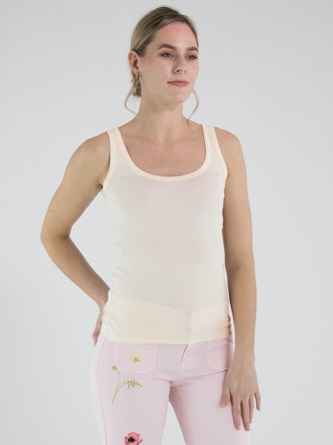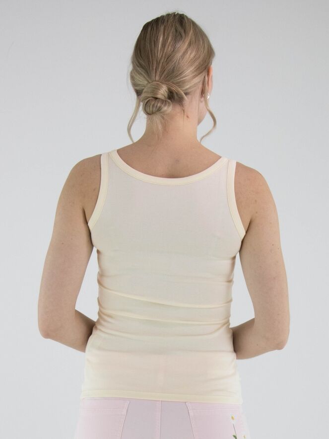 Top by Marc Cain in an elegant off-white shade. Designed with a generously cut round neckline, it offers a modern and relaxed look. This top can be washed at 30 degrees.