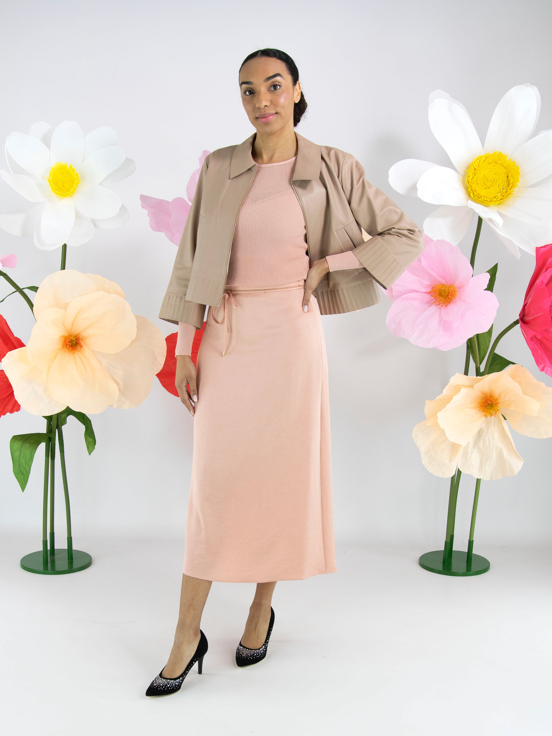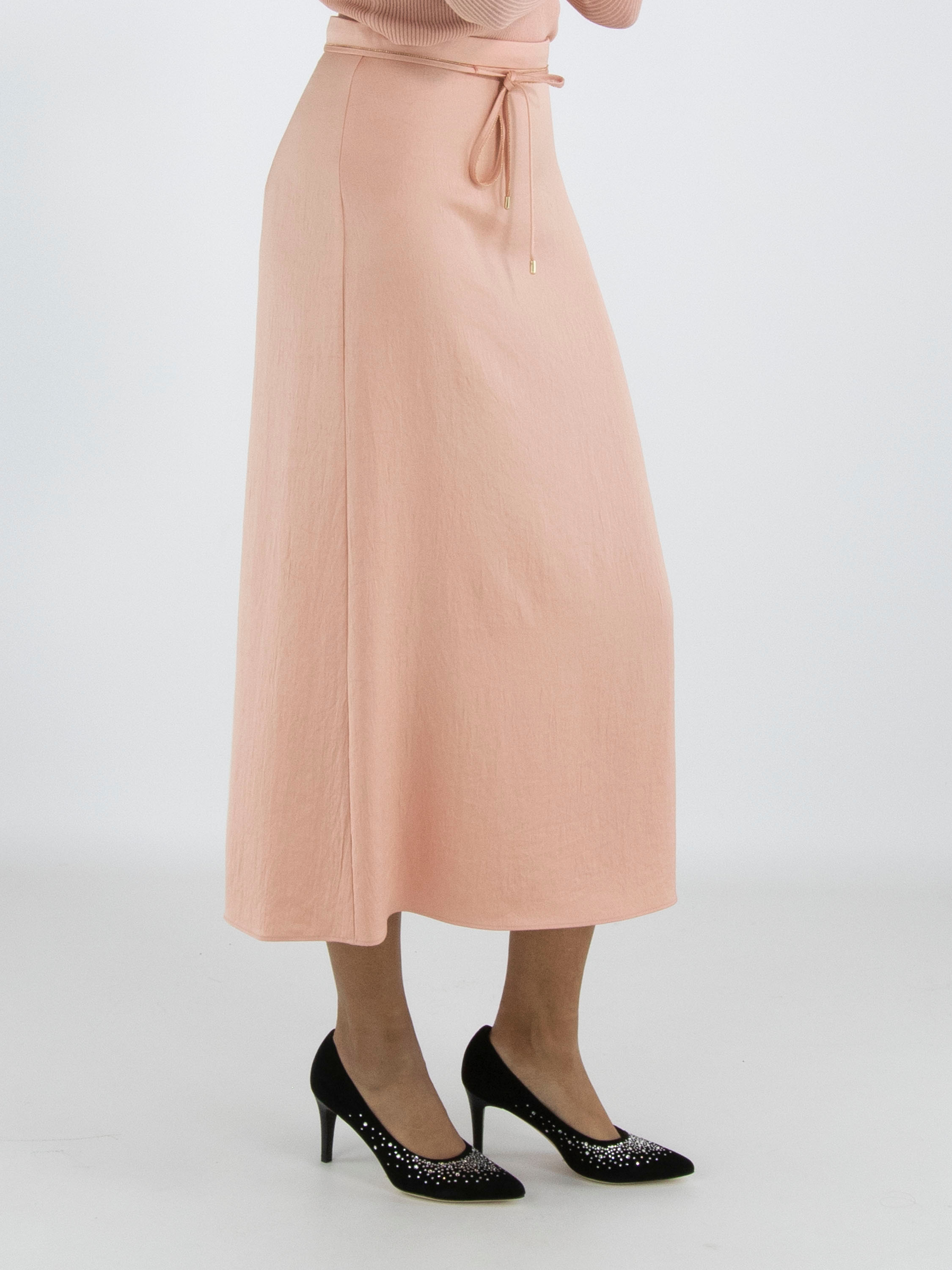 A long skirt from Marc Cain in a matte satin fabric in salmon pink. At the waist is a ribbon belt in the same fabric, finished along the edge with a zipper’s scalloped trim. This skirt can be washed at 30 degrees.