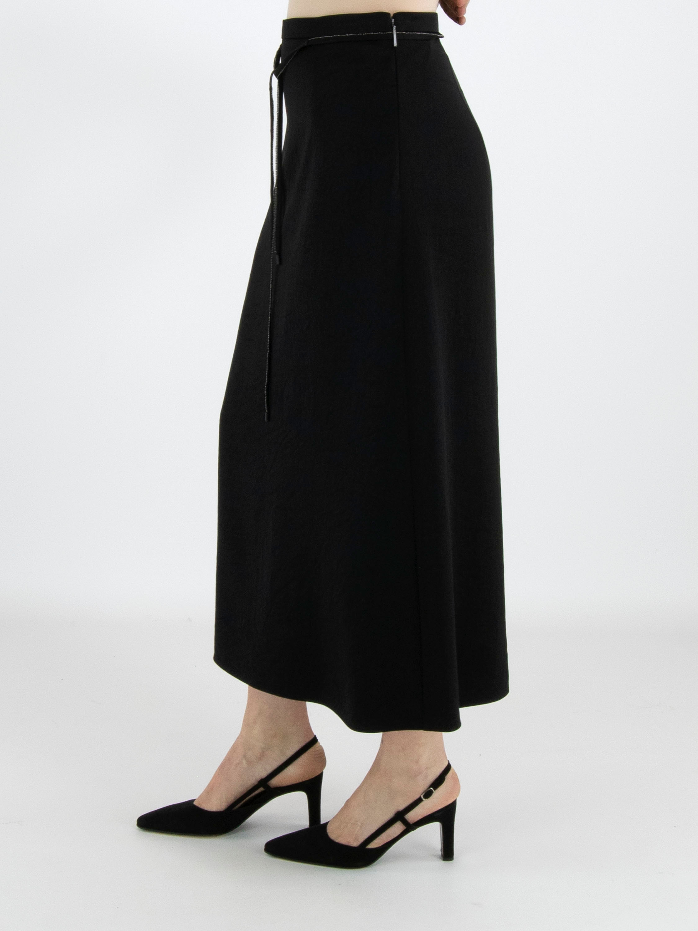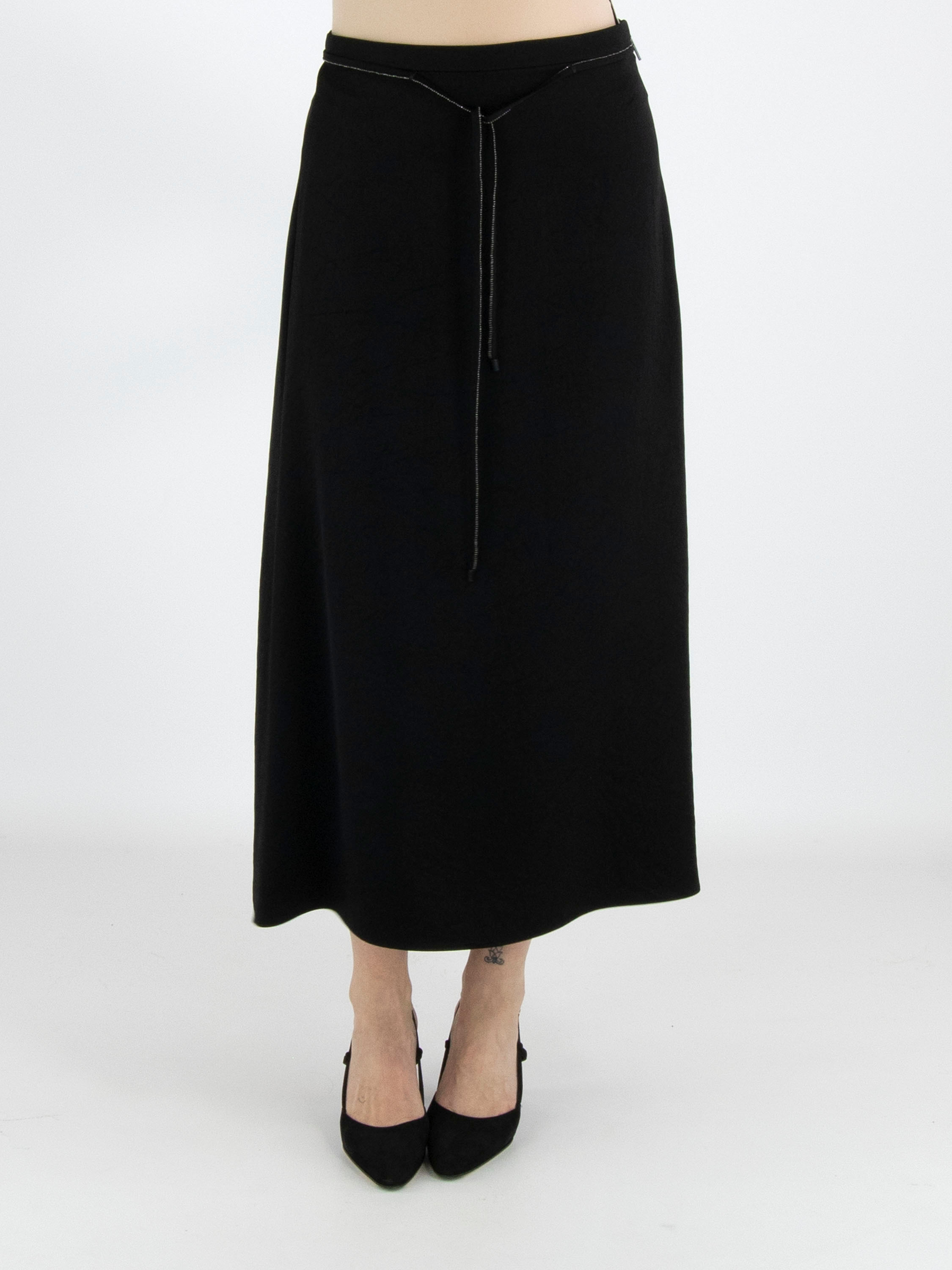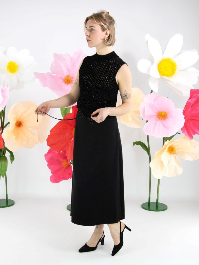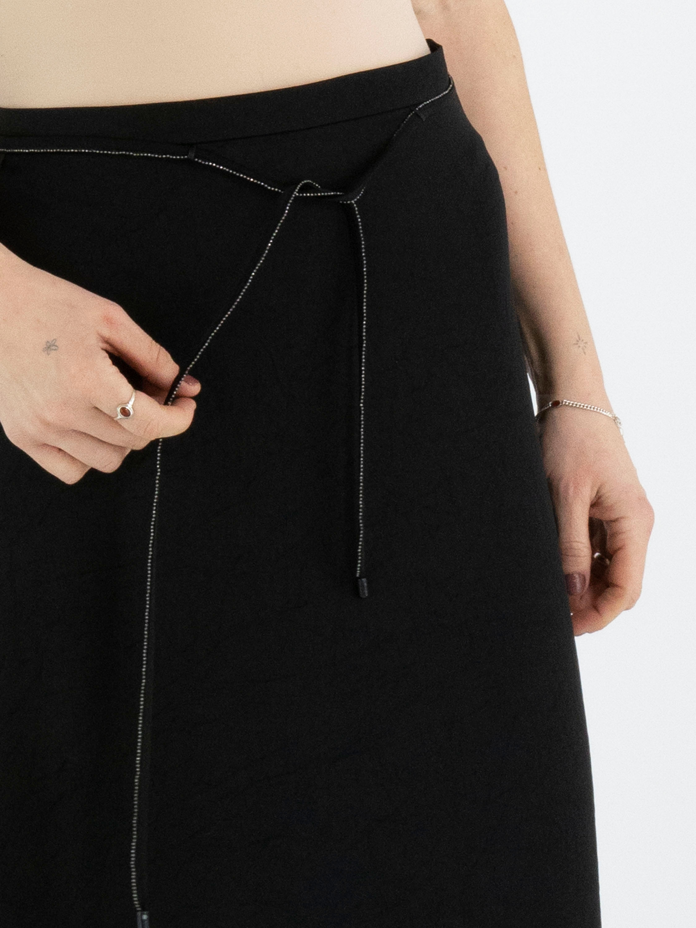 A long skirt from Marc Cain in a matte satin fabric in black. At the waist there is a ribbon belt in the same fabric, finished along the edge with a scalloped zipper trim. This skirt can be washed at 30 degrees.