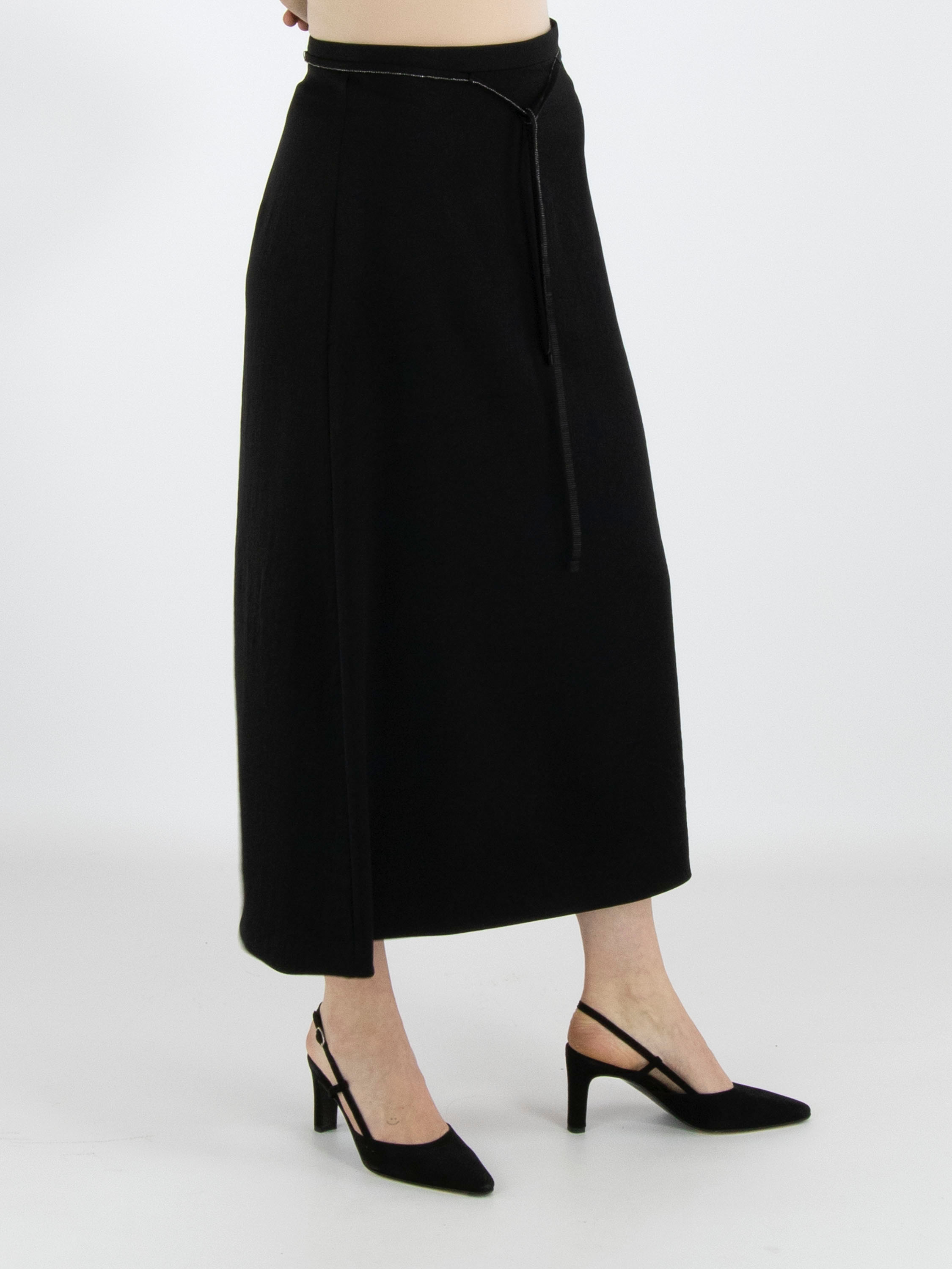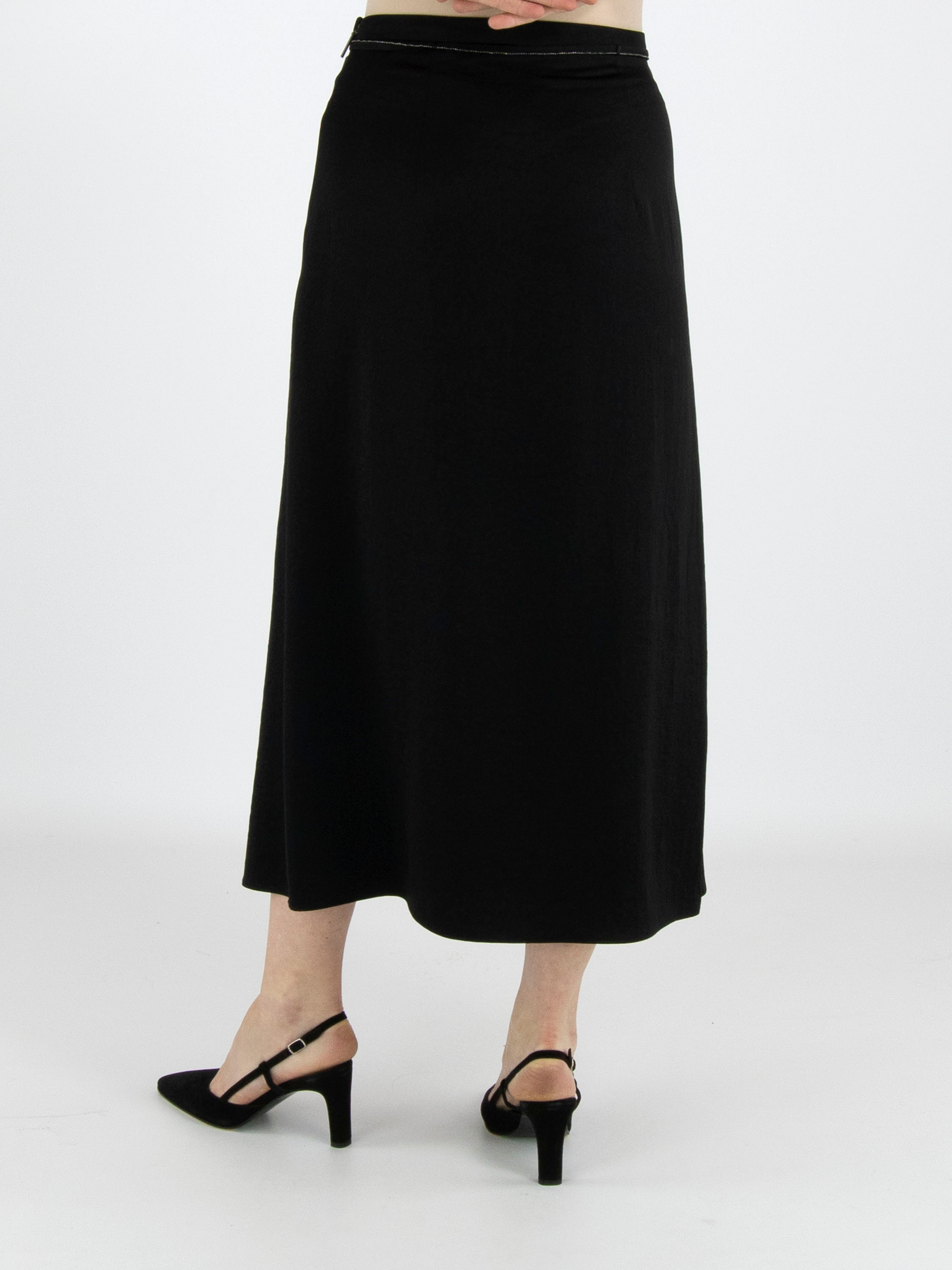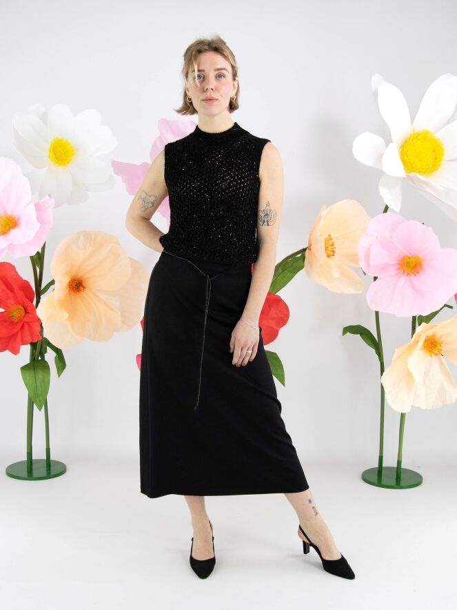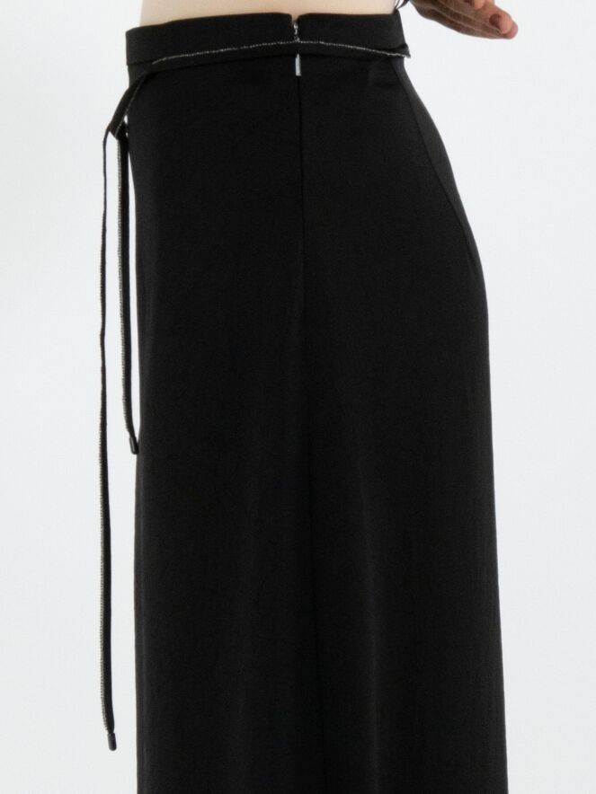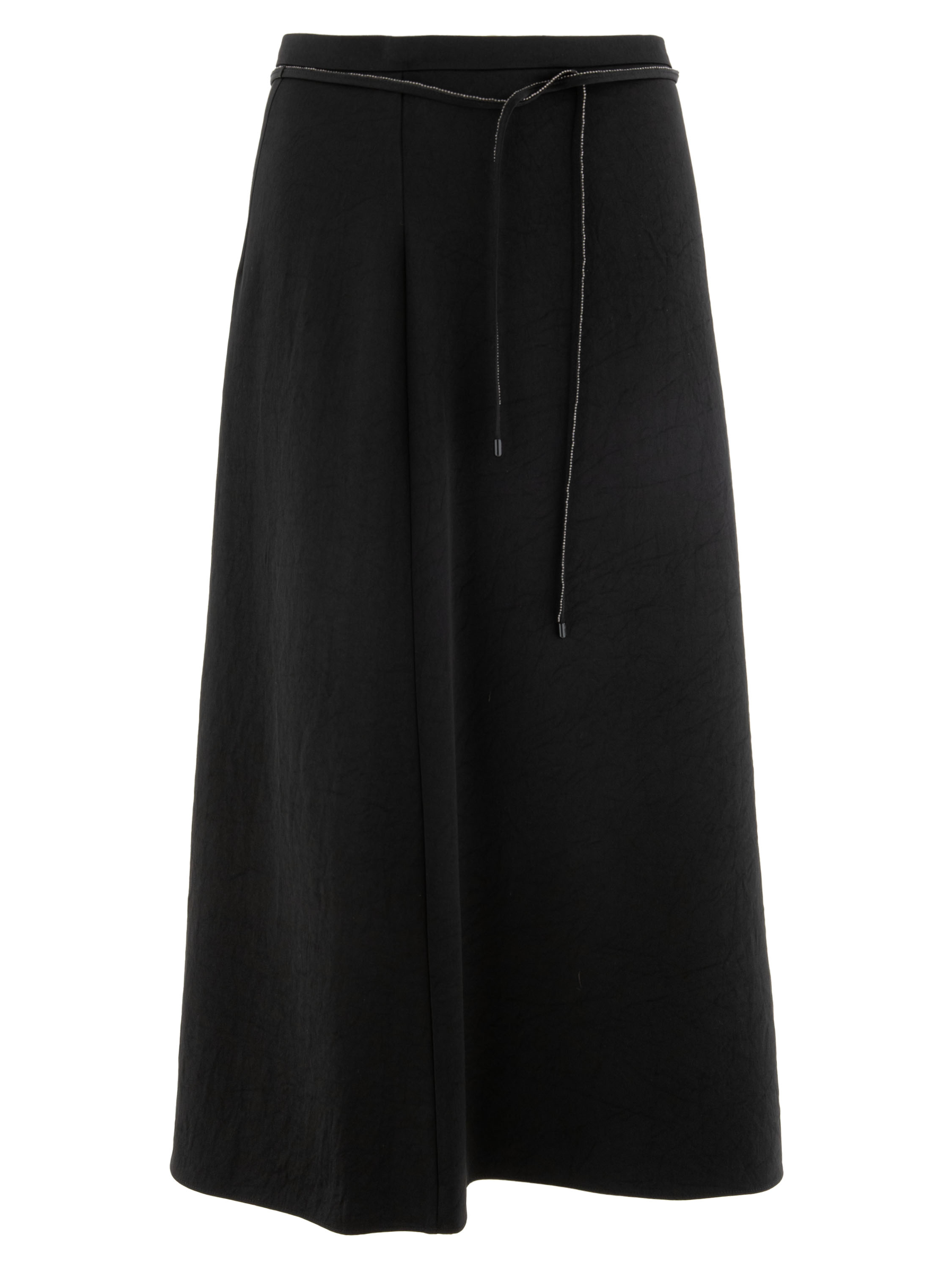 A long skirt from Marc Cain in a matte satin fabric in black. At the waist there is a ribbon belt in the same fabric, finished along the edge with a scalloped zipper trim. This skirt can be washed at 30 degrees.