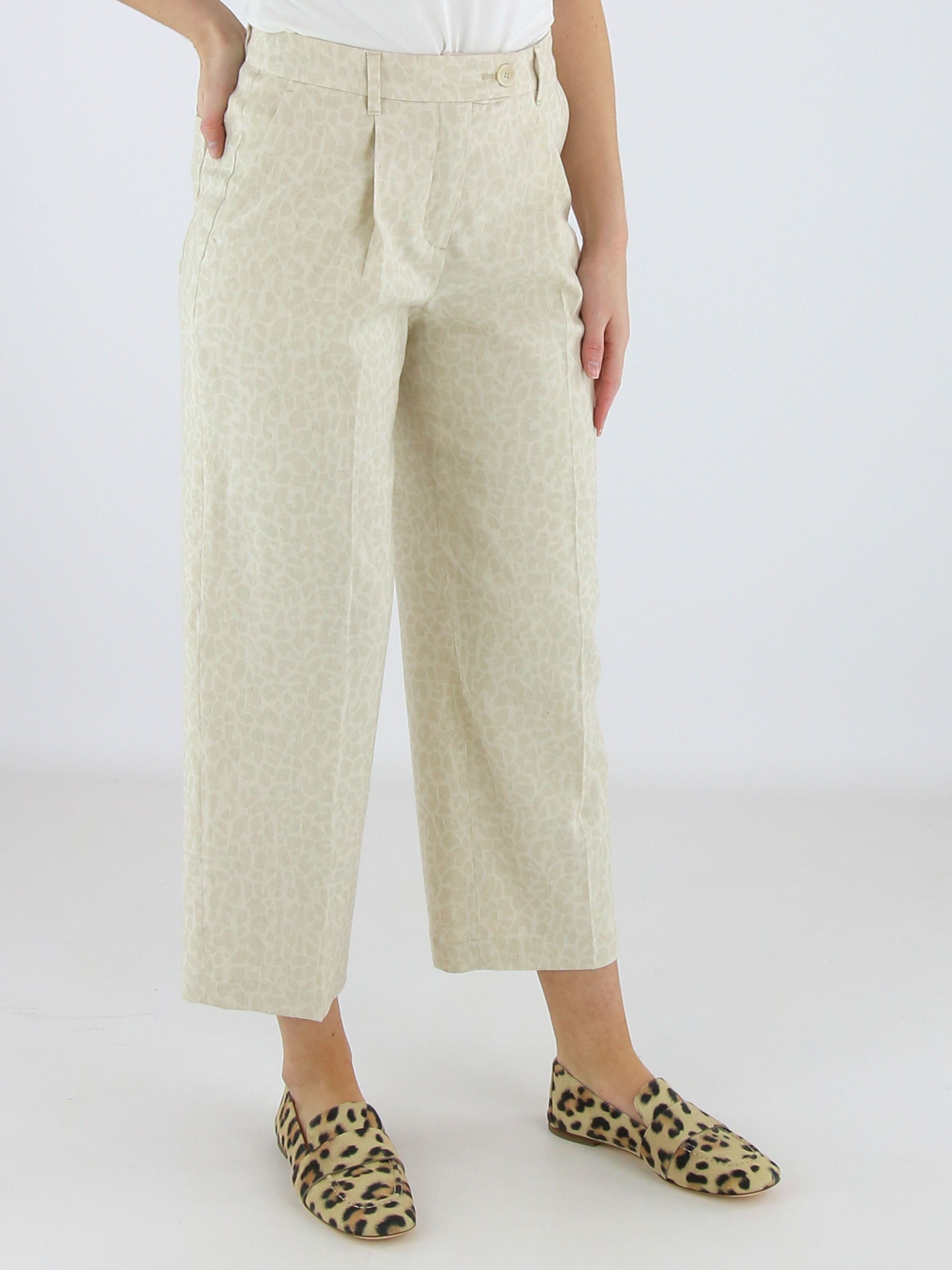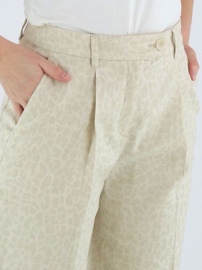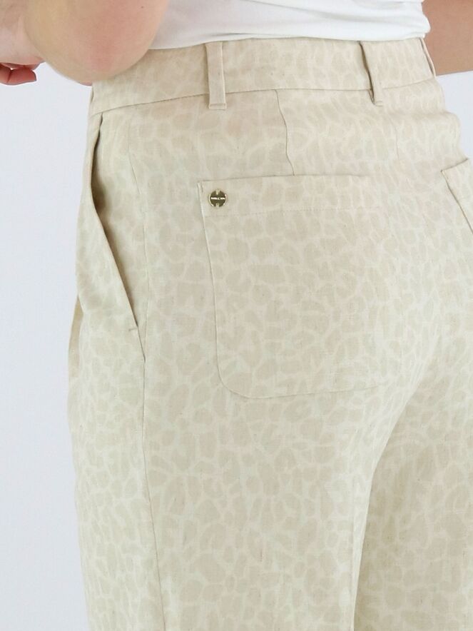 Trousers by Marc Cain featuring a leopard print in beige and off-white. Just below the waistband, several pleats create an elegant and relaxed drape. Designed with side pockets and a pressed crease along the center of the legs, it offers a refined finish. These trousers can be washed at 30 degrees.