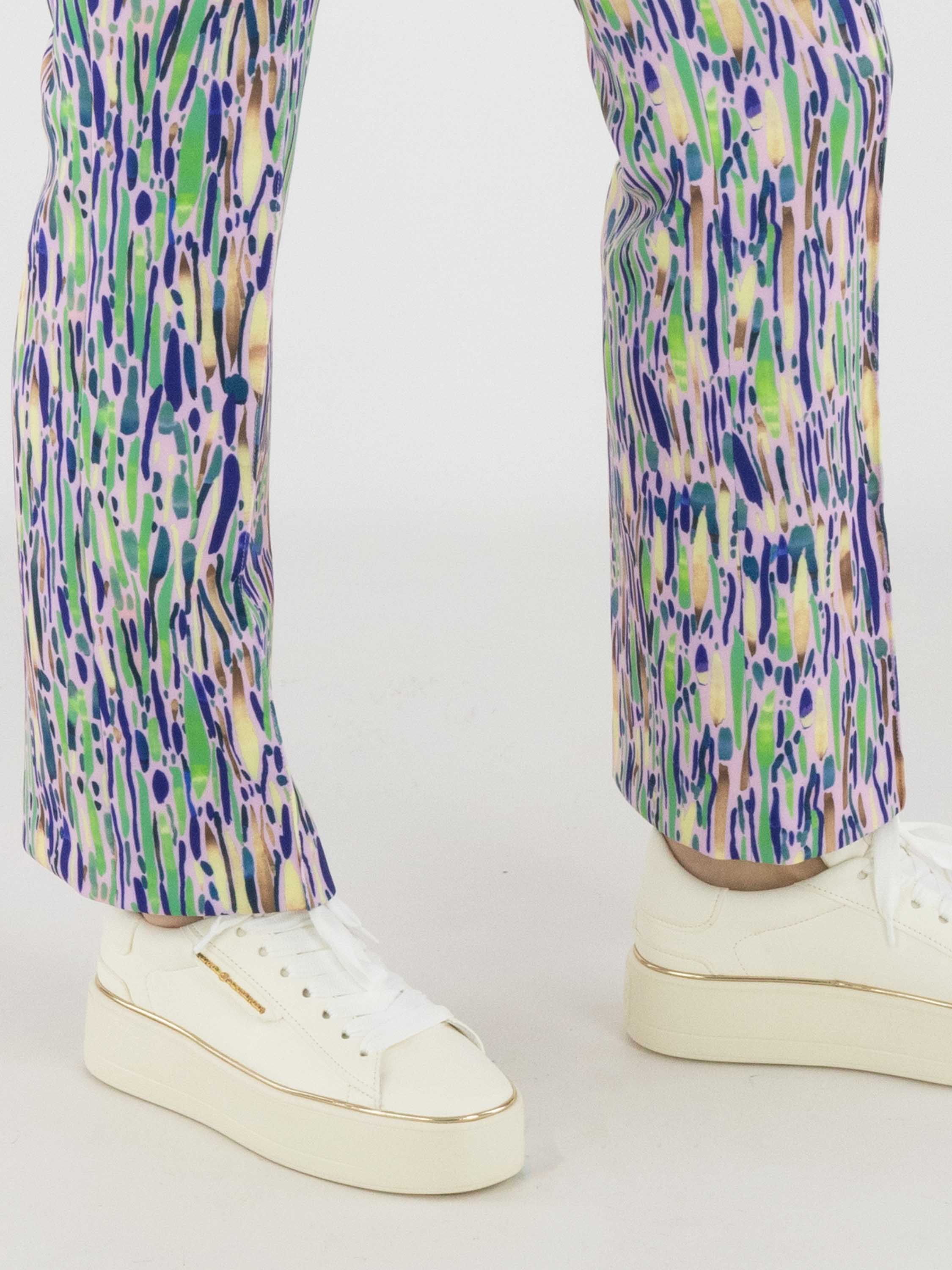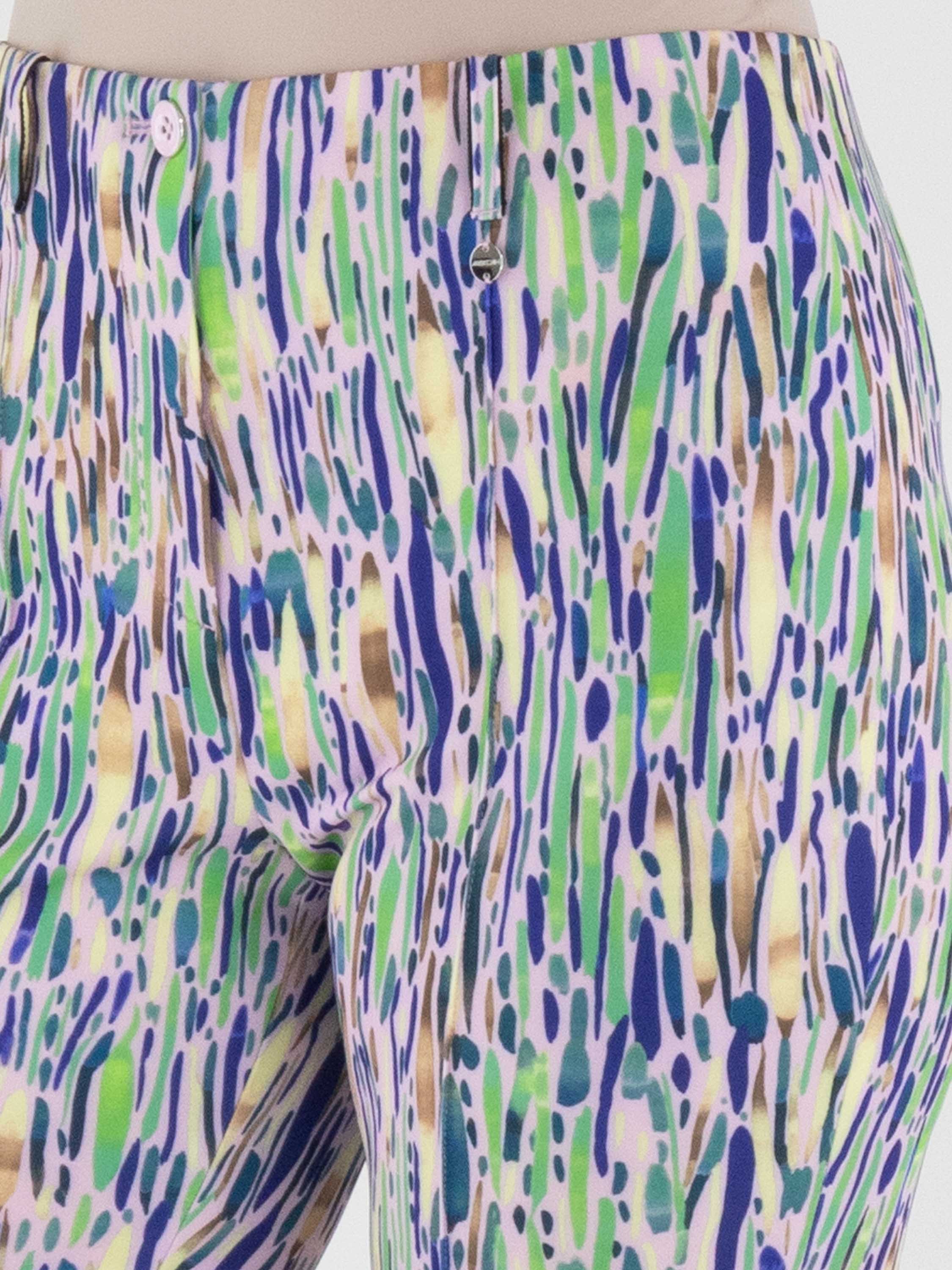 Trousers by Marc Cain featuring a confetti print in various shades of green, blue and brown on a pastel pink background. The waistband is elasticated. A reversed seam runs down the centre of the legs. These trousers can be washed at 30 degrees.