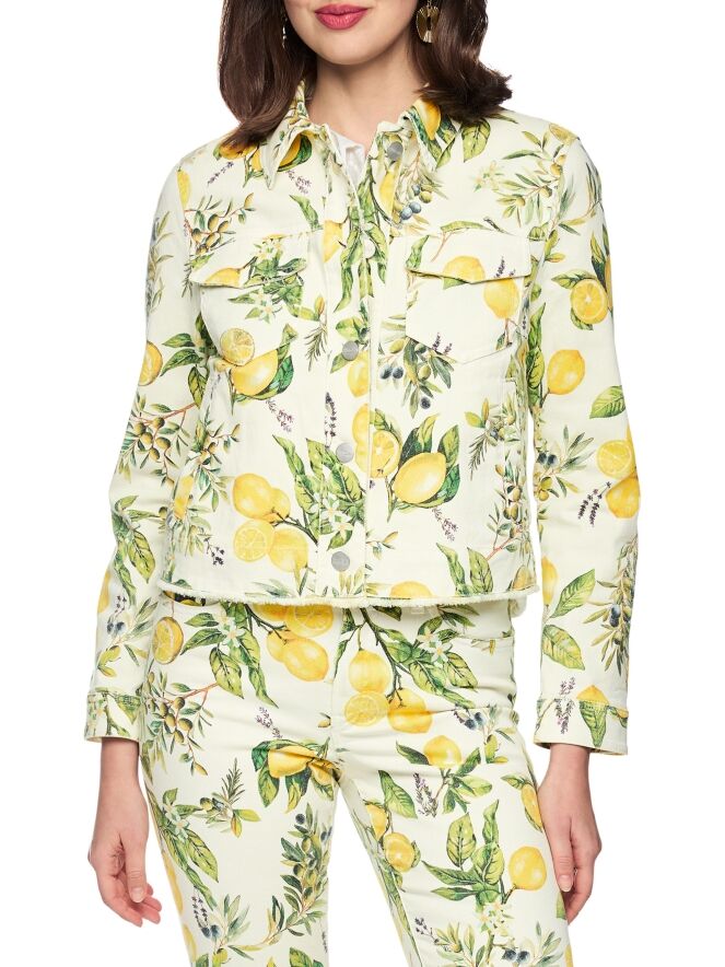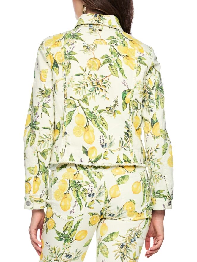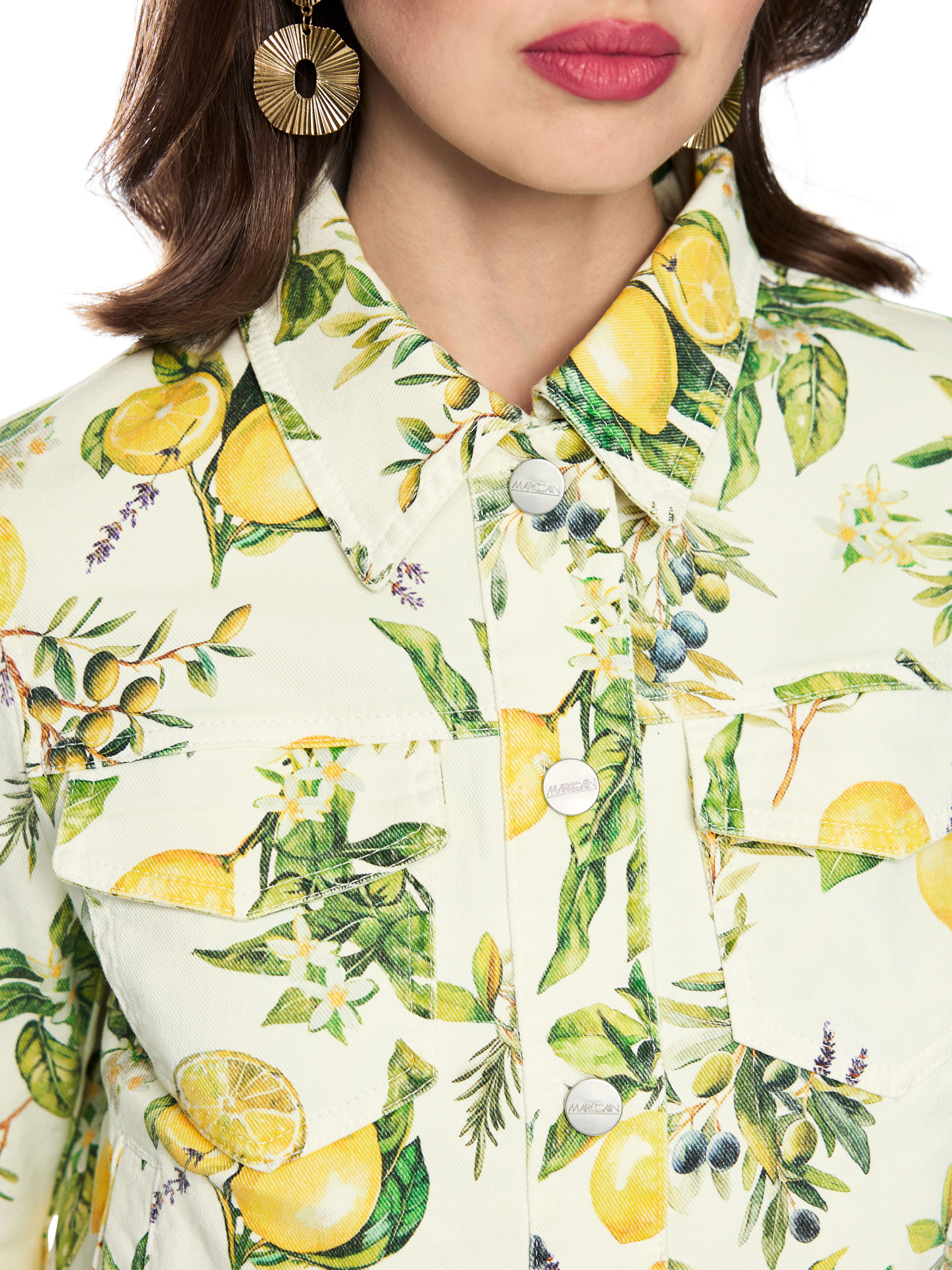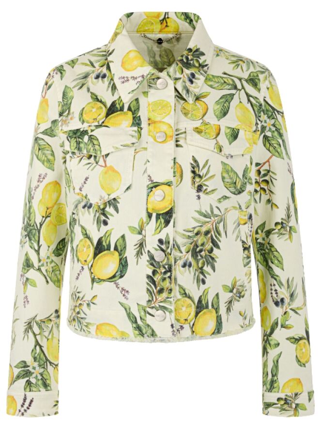 A short denim blazer by Marc Cain featuring a print of lemons and olives on branches with leaves against an off-white background. The blazer fastens with buttons and has a lightly tailored fit. Side pockets are placed at waist level. The hem is subtly frayed, adding a relaxed touch. This piece can be washed at 30 degrees.