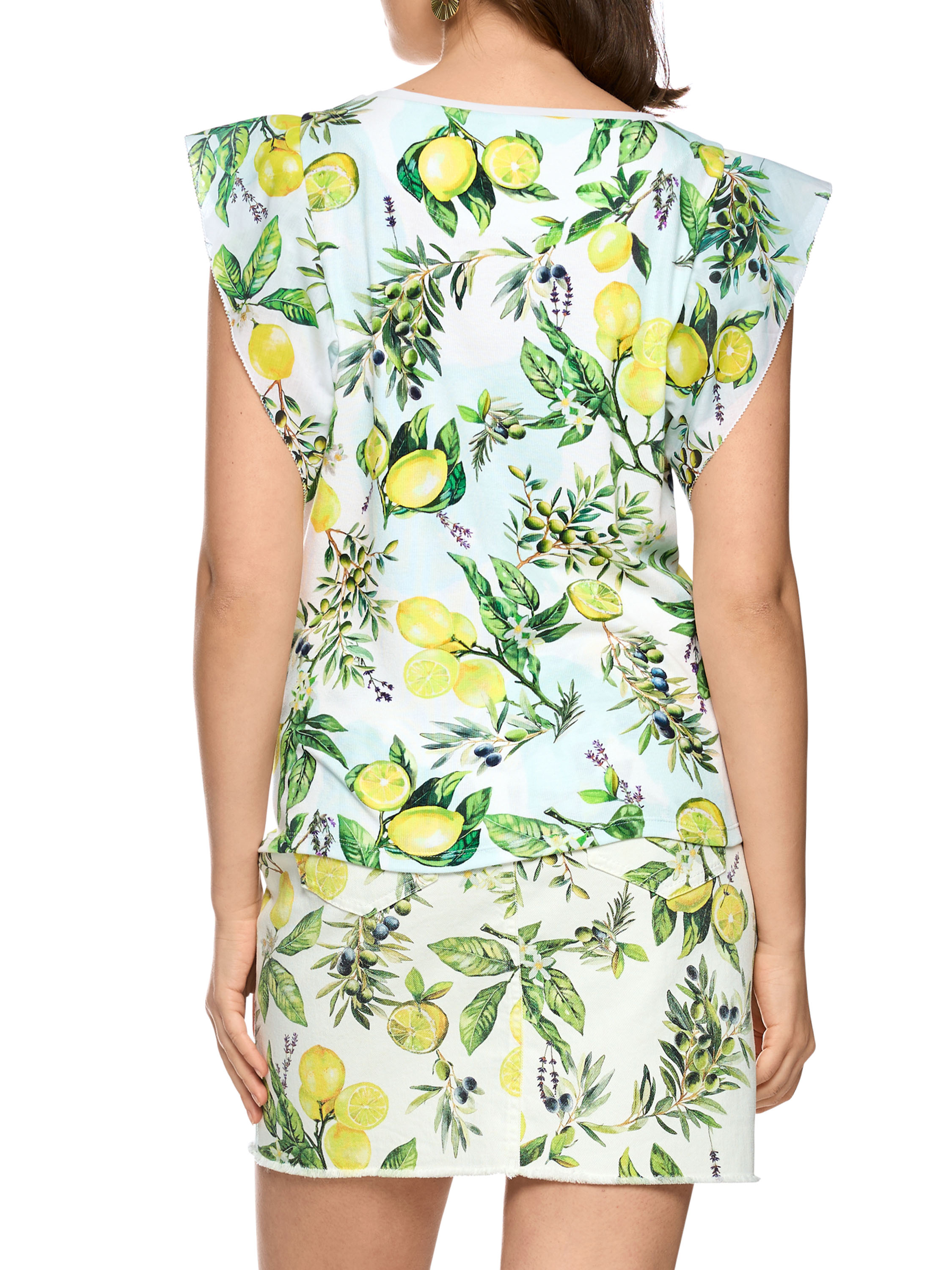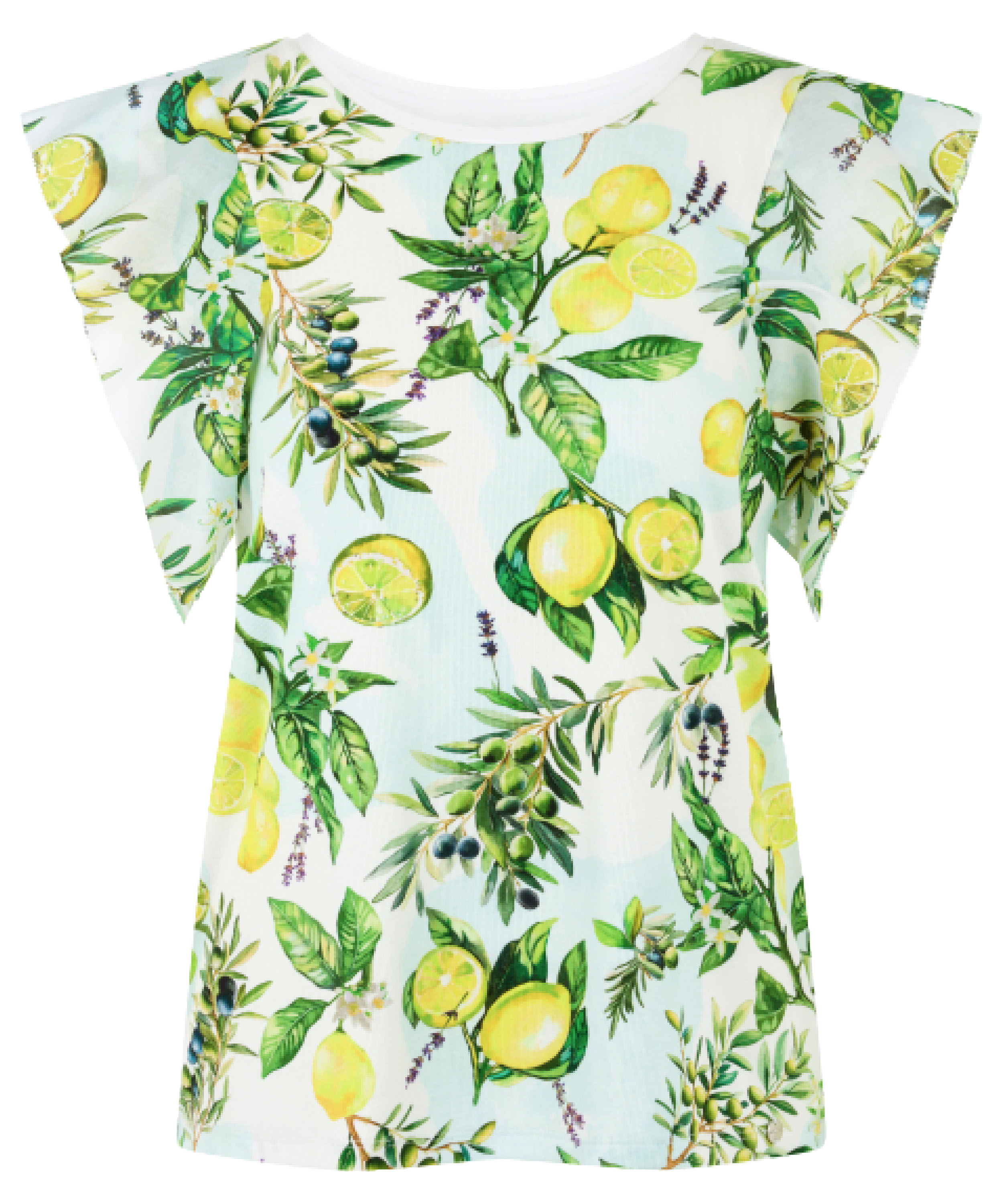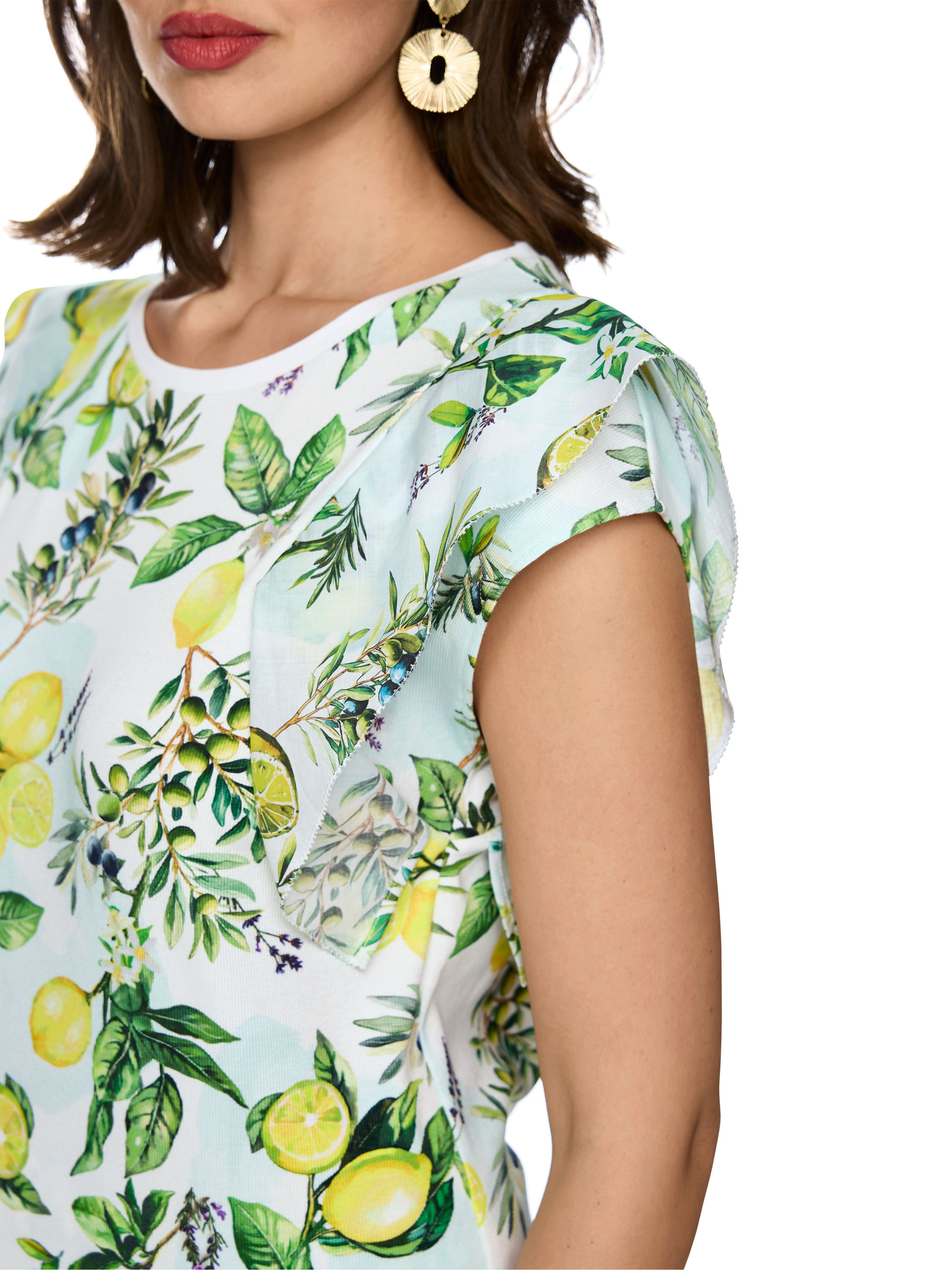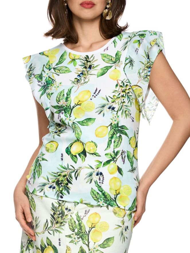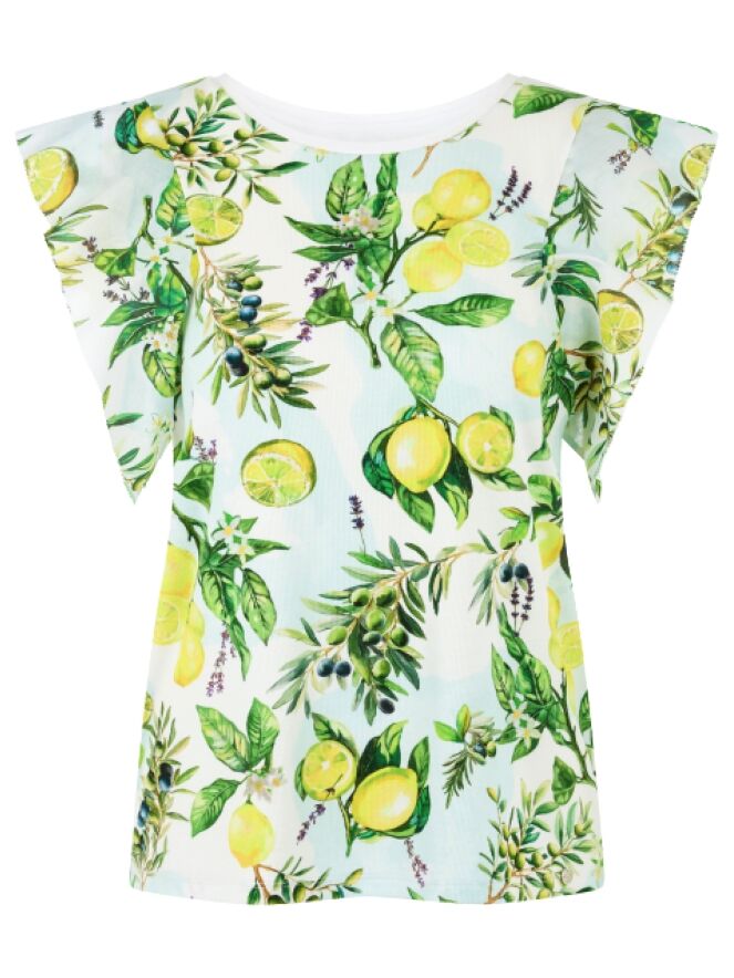 A Marc Cain T-shirt featuring a print of lemons and olives on branches with leaves. The design is set against a white and light blue background. The fabric has a finely ribbed texture. A white trim finishes the round neckline, while the sleeve insert is enhanced with a decorative double layer in a fine cotton quality. This piece can be washed at 30 degrees.