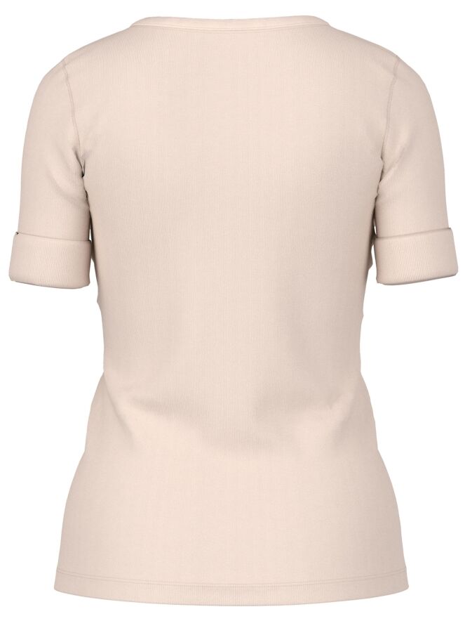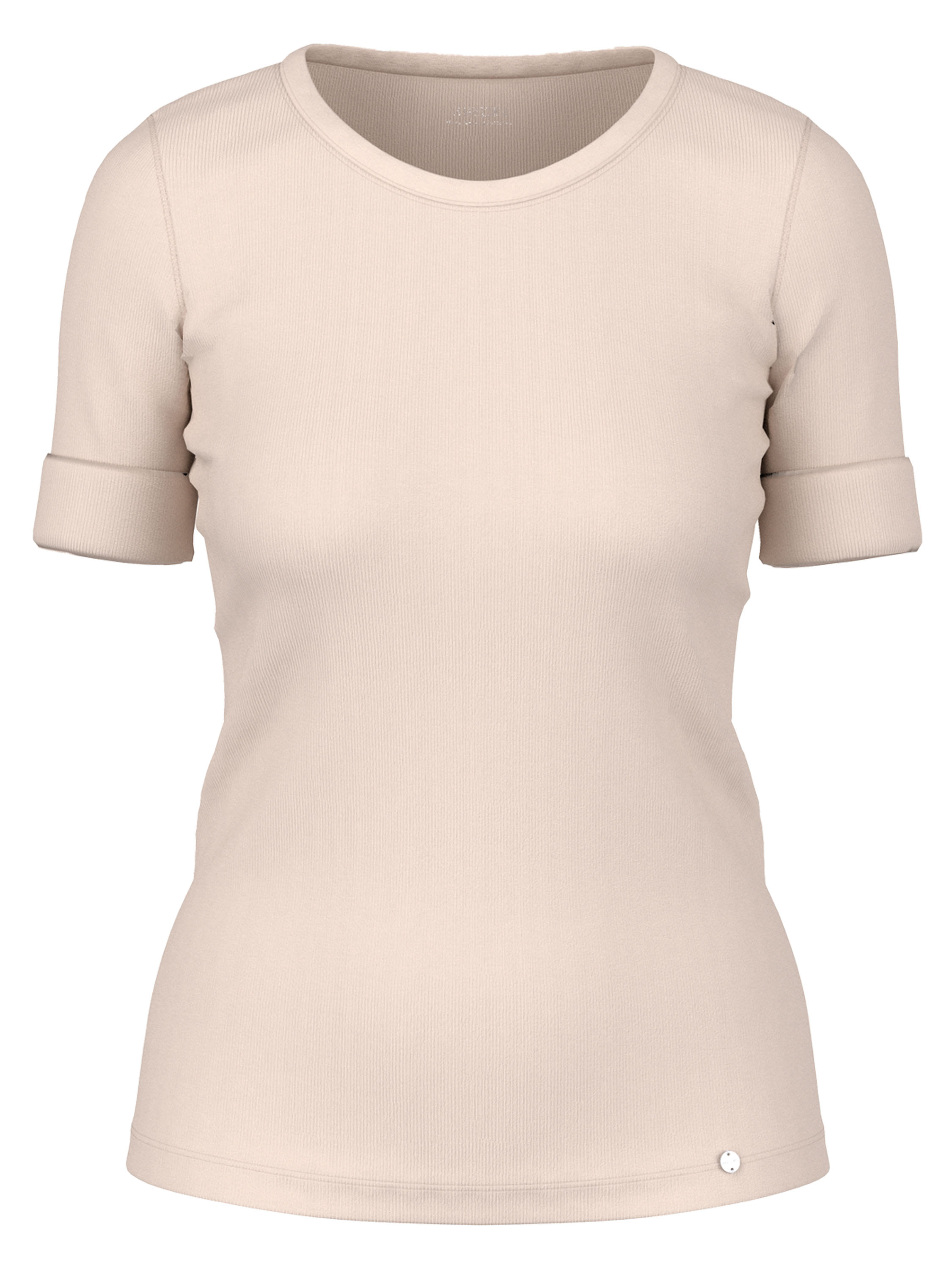 Shirt by Marc Cain crafted from fine ribbed fabric in beige. It features a round neckline and short sleeves with a refined turn-up detail, creating a stylish yet casual look. This exclusive designer top can be washed at 30 degrees.