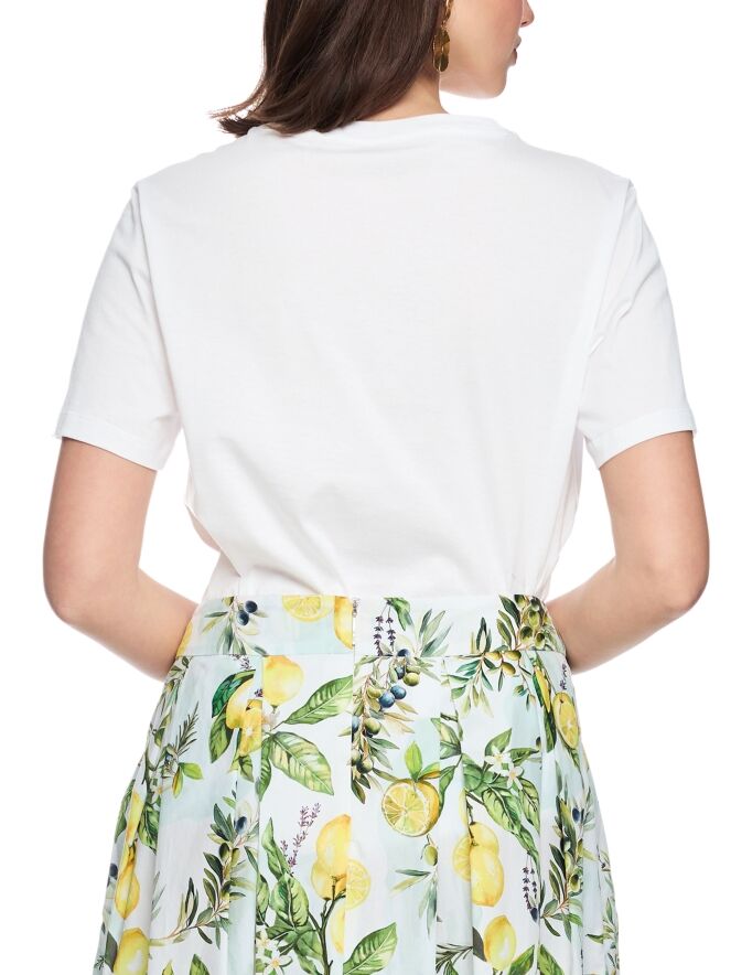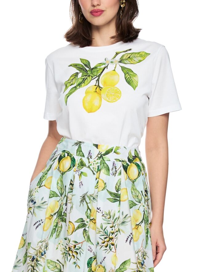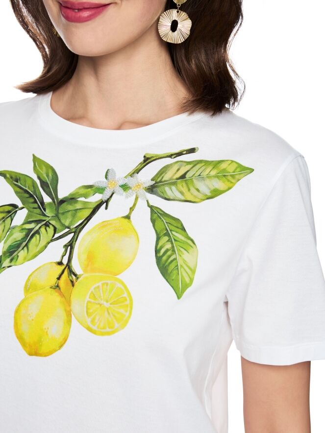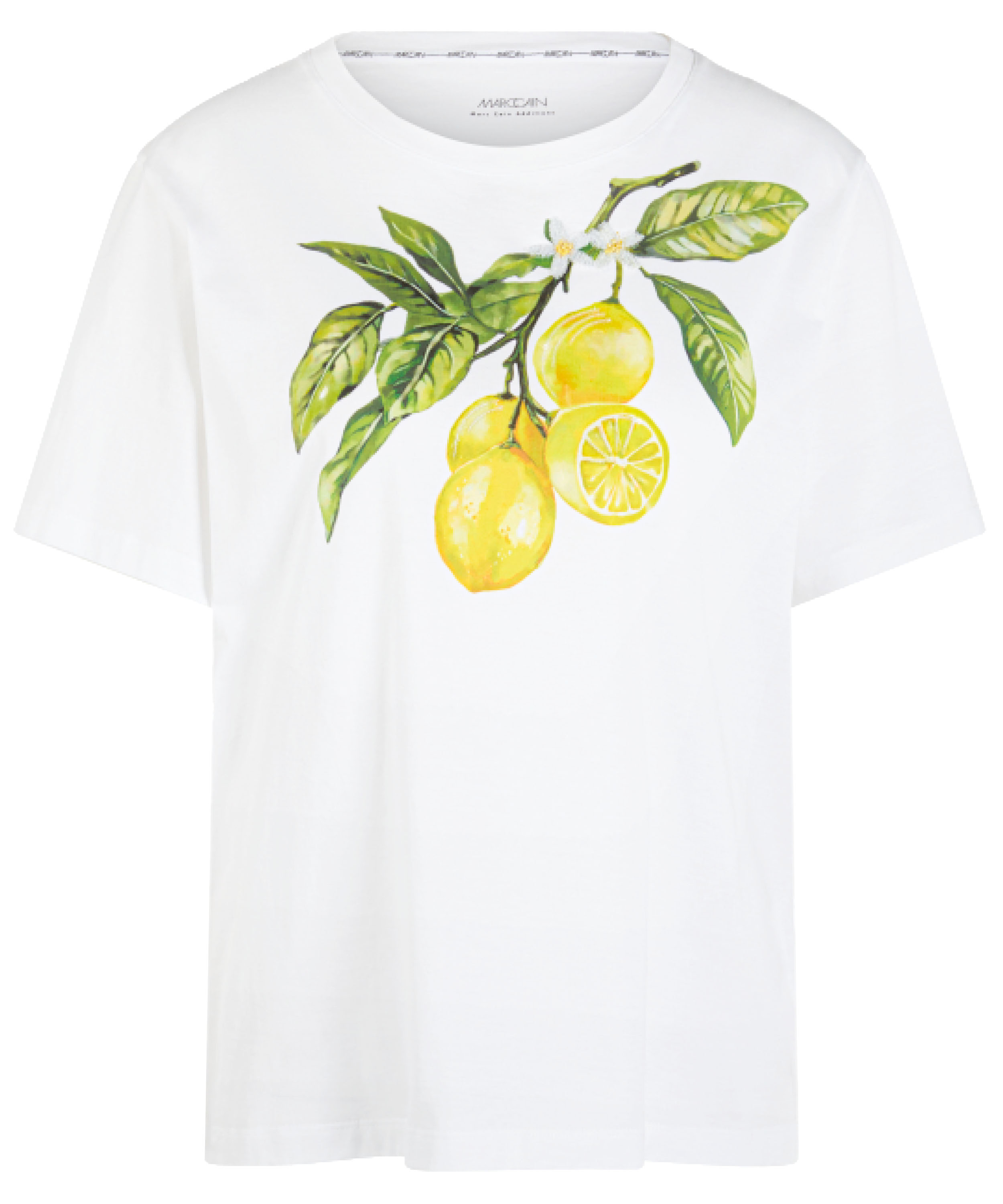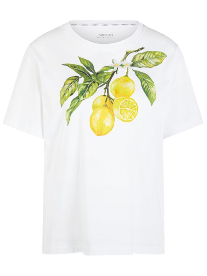 A Marc Cain T-shirt in white, featuring a front print of lemons on a branch with leaves. The shirt has short sleeves and a round neckline. This piece can be washed at 30 degrees.