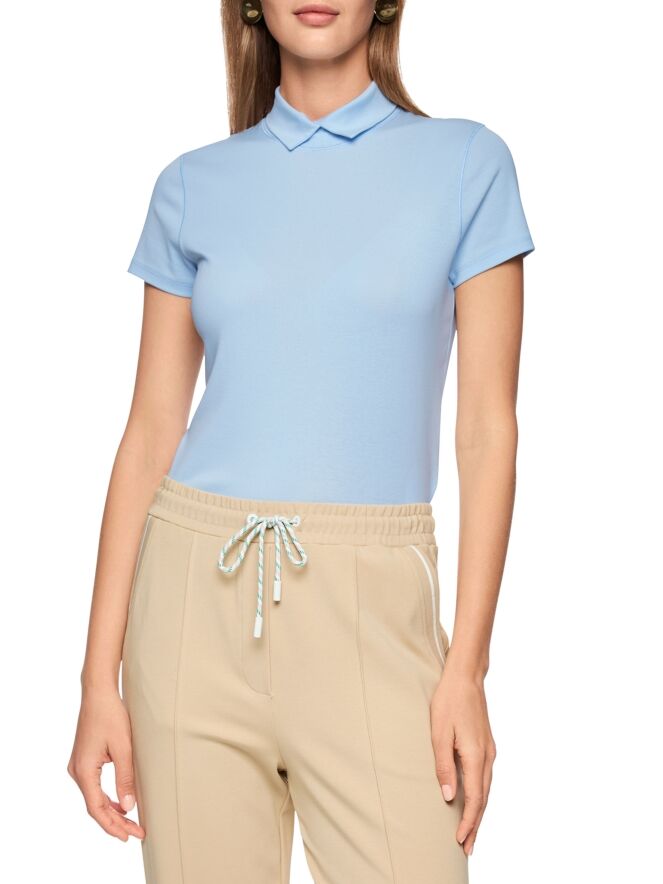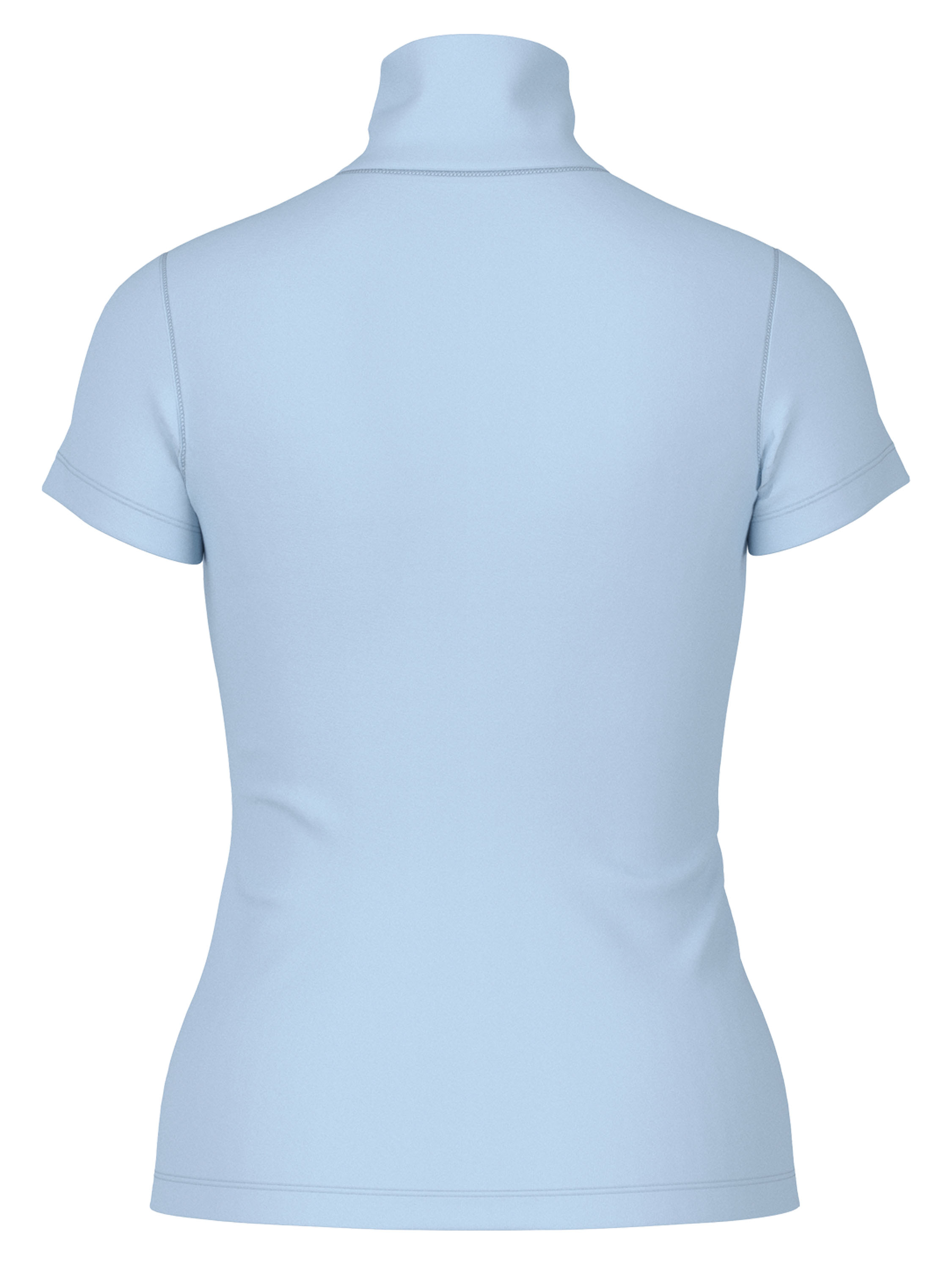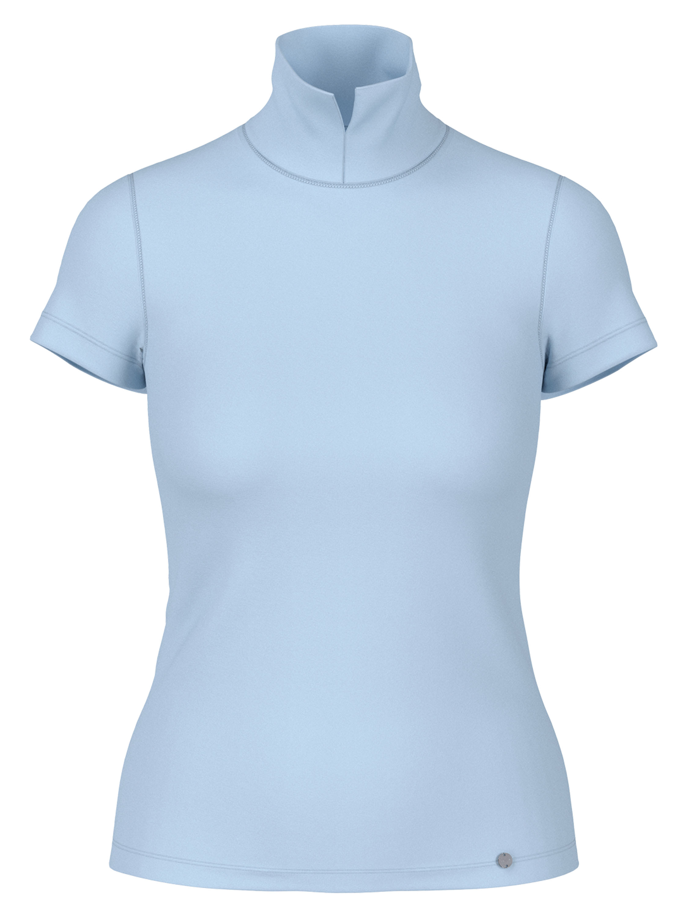Shirt by Marc Cain in a soft pastel blue shade. Featuring short sleeves and a turtleneck with a small front slit, it offers an elegant and feminine look. This exclusive designer top can be washed at 30 degrees.