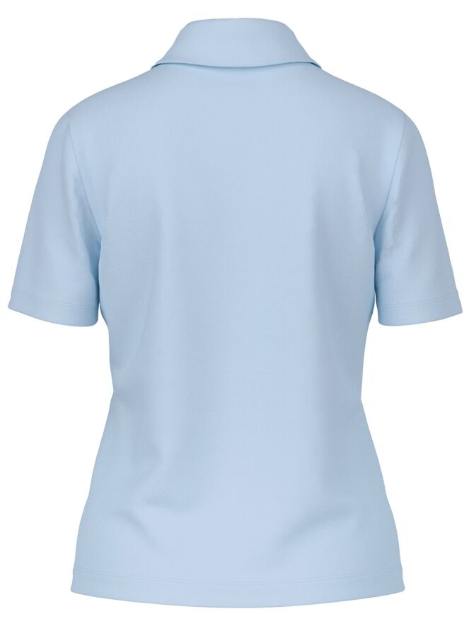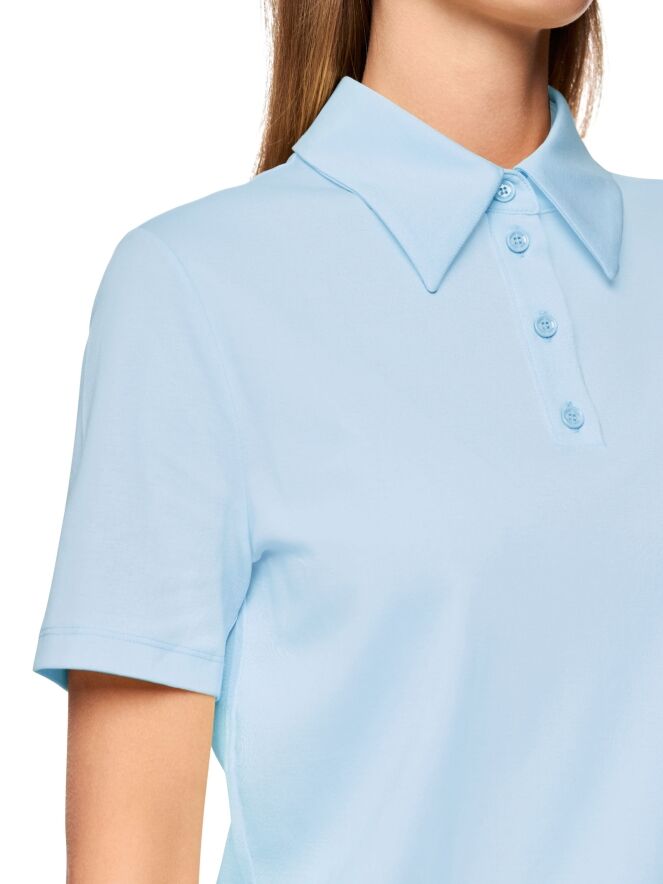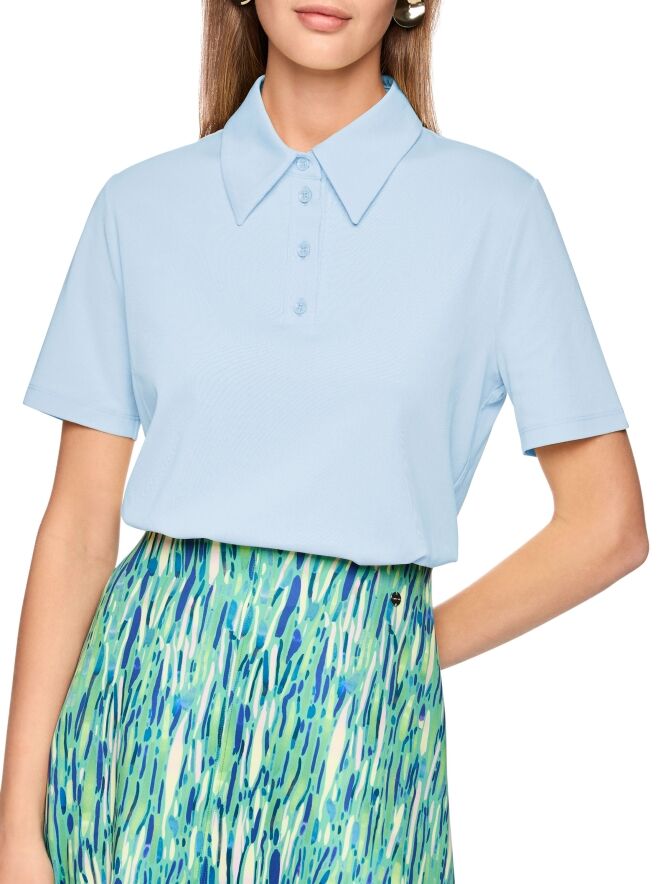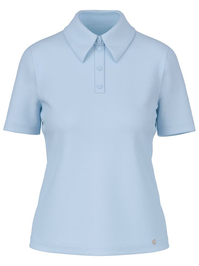 Polo shirt by Marc Cain in a soft pastel blue shade. Made entirely in a solid color and featuring short sleeves, it combines a fresh, sporty yet elegant look. This exclusive designer polo can be washed at 30 degrees.