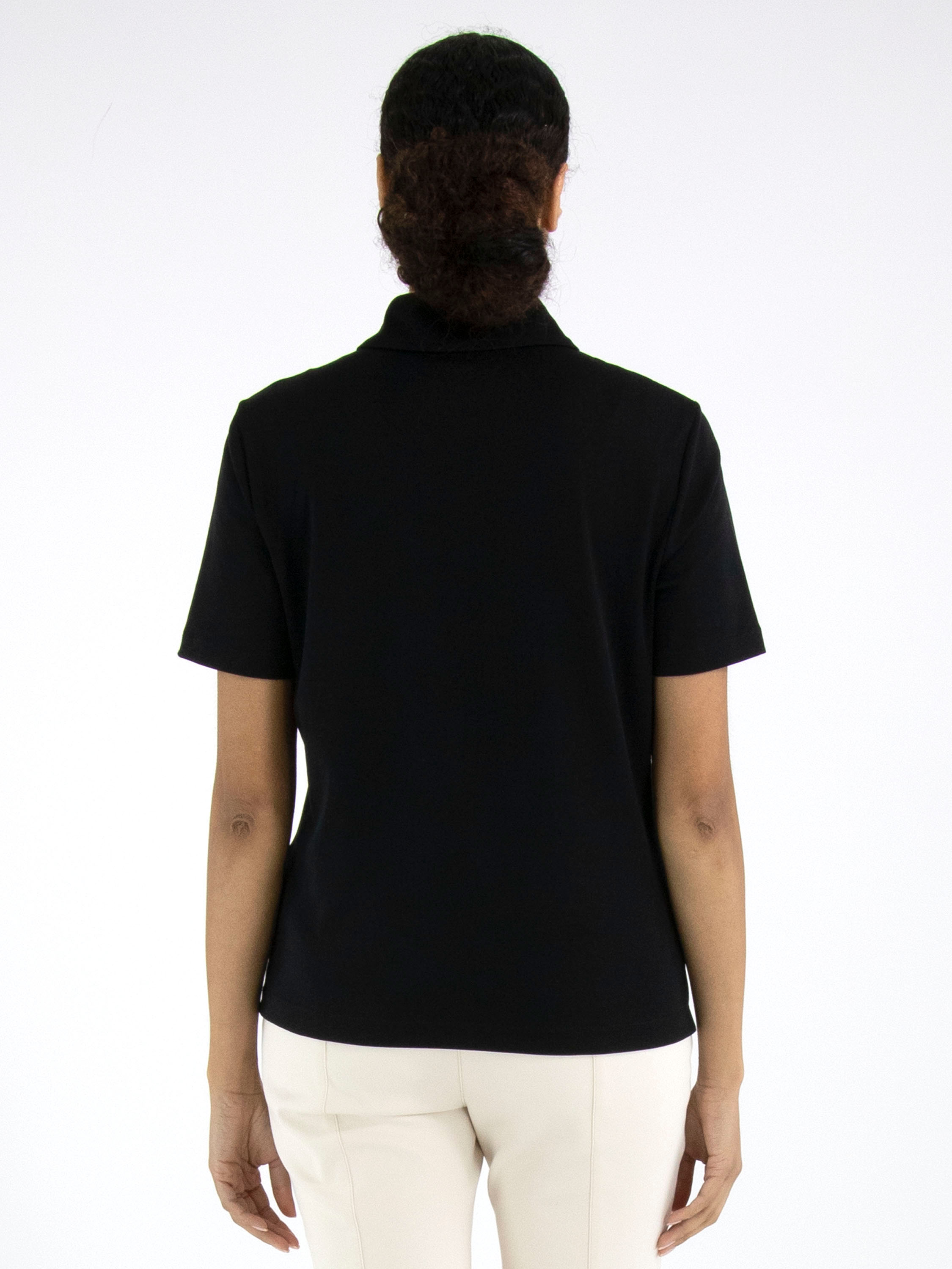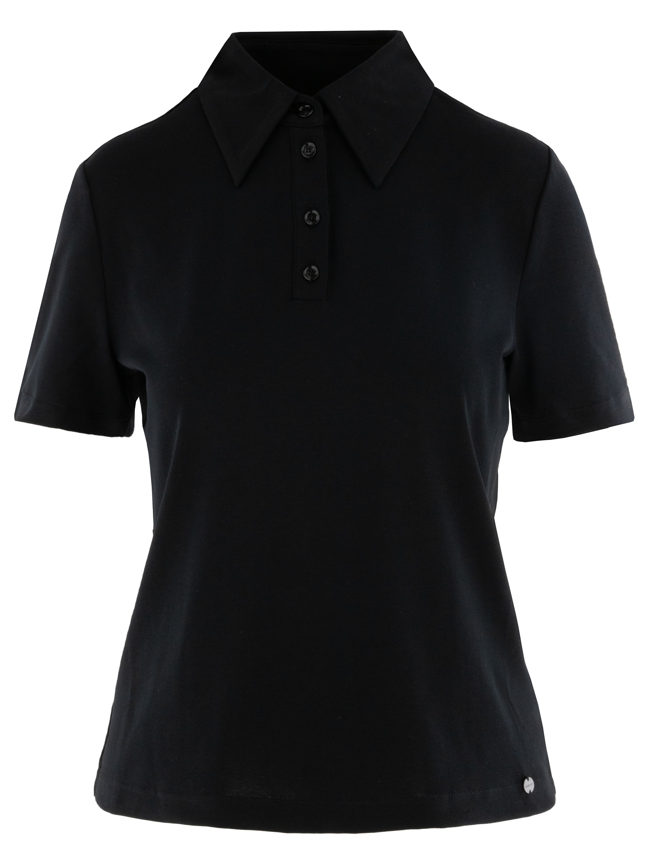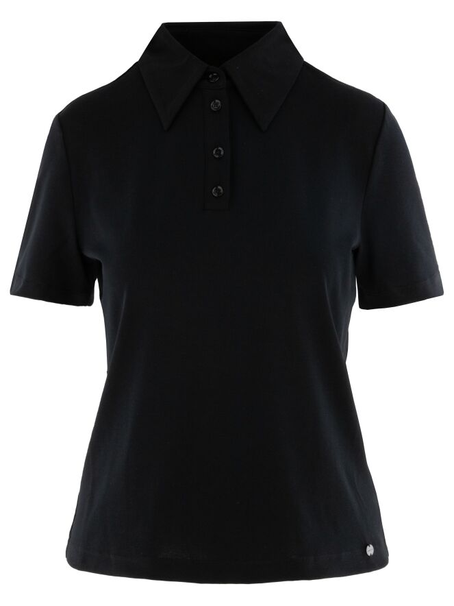 Polo shirt by Marc Cain in black. This elegant, solid-coloured design features short sleeves and a timeless, feminine fit — perfect for both casual and refined looks. This exclusive designer polo can be washed at 30 degrees.