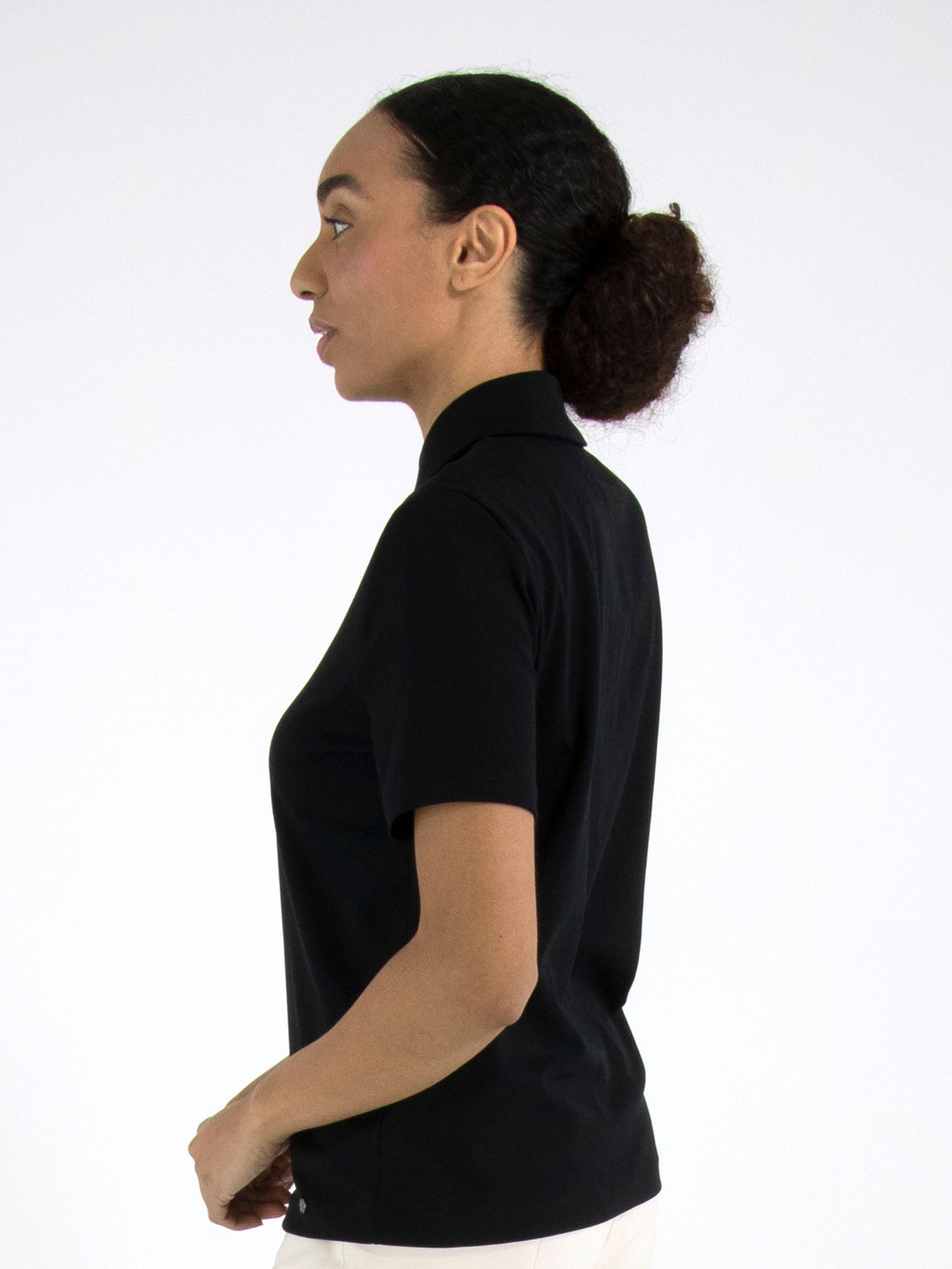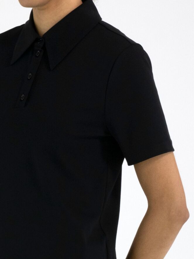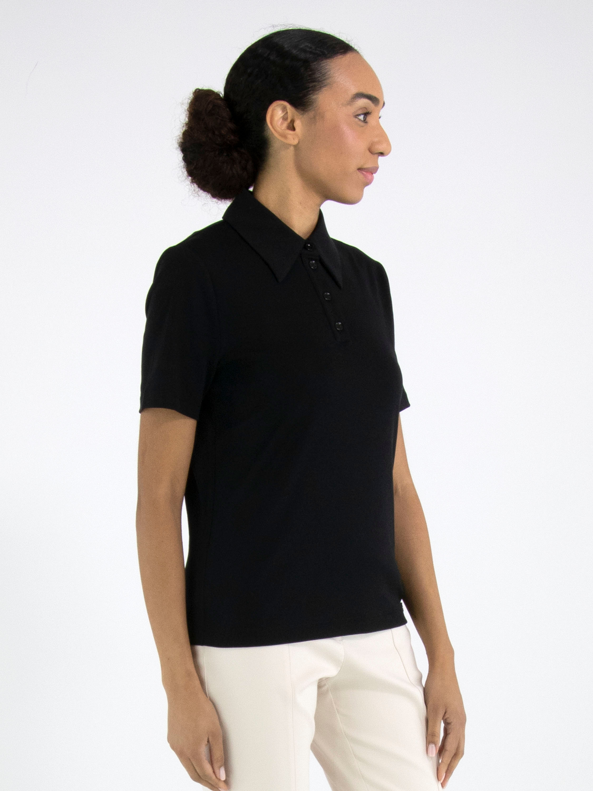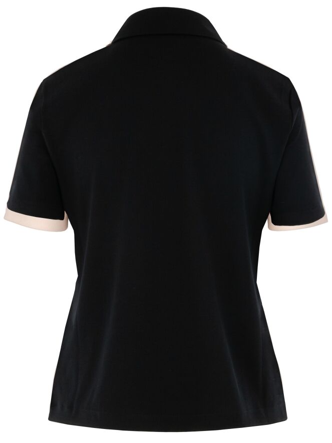 Polo shirt by Marc Cain in black. This elegant, solid-coloured design features short sleeves and a timeless, feminine fit — perfect for both casual and refined looks. This exclusive designer polo can be washed at 30 degrees.