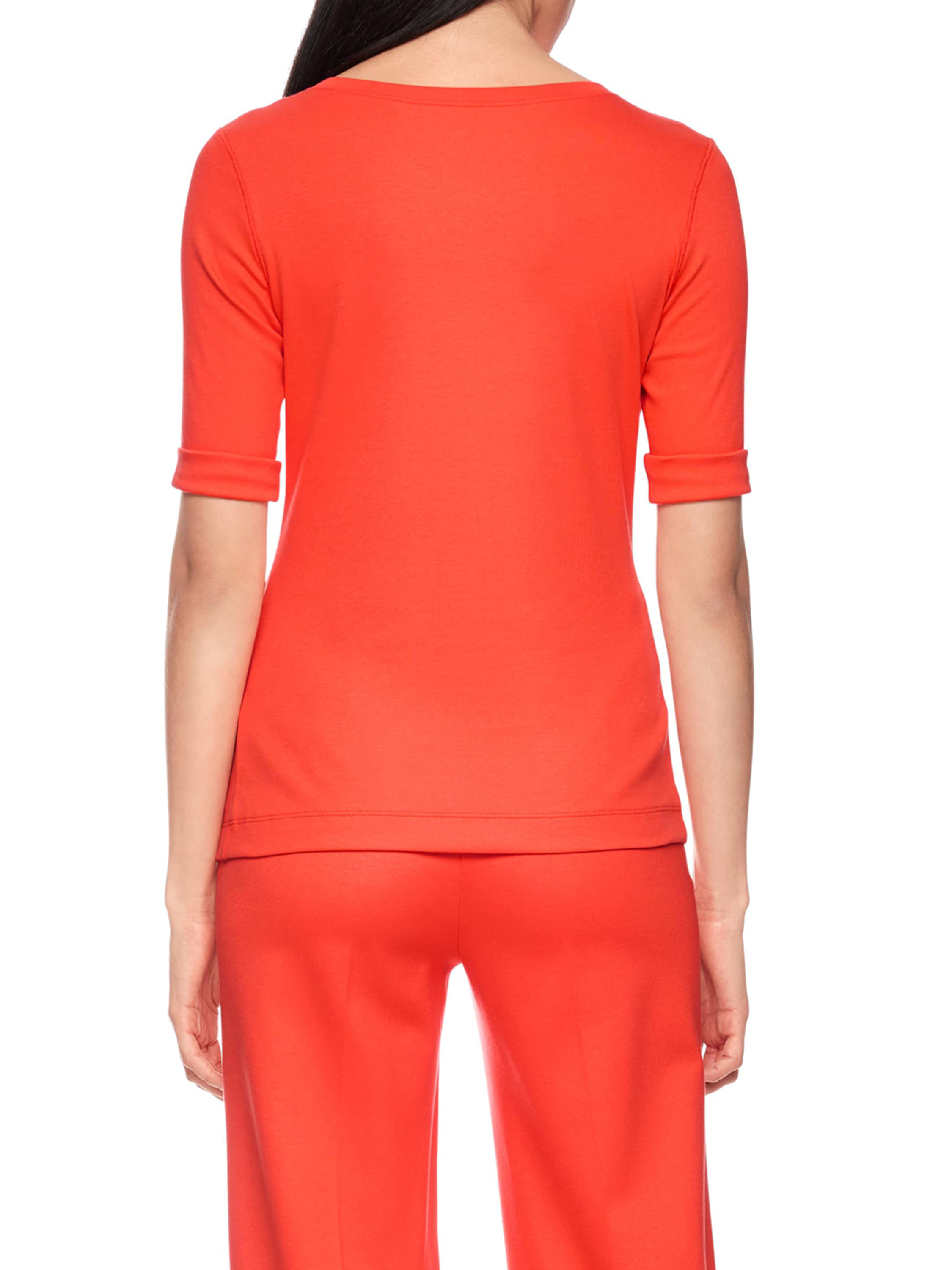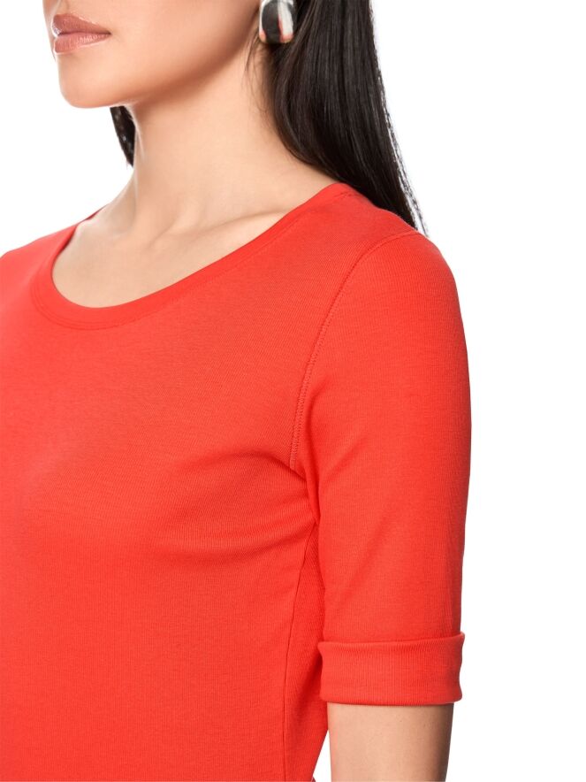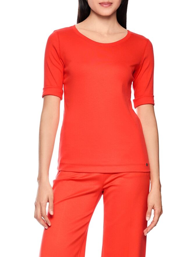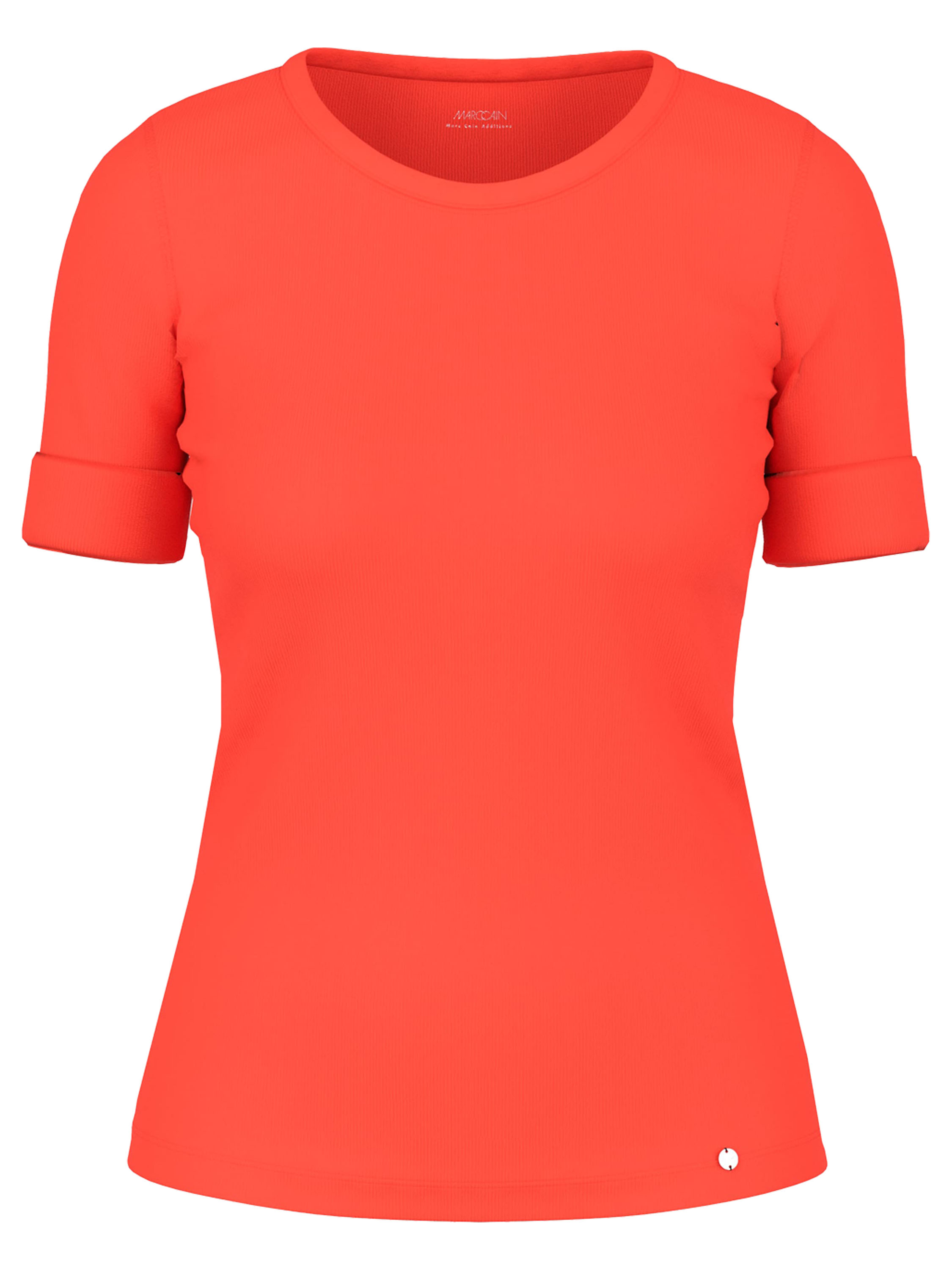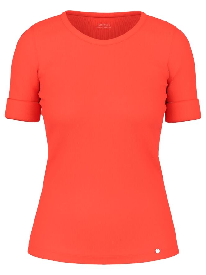 Shirt by Marc Cain crafted from fine ribbed fabric in a vibrant orange shade. Featuring a round neckline and short sleeves with a refined turn-up detail, it offers a modern and feminine look. This exclusive designer top can be washed at 30 degrees.