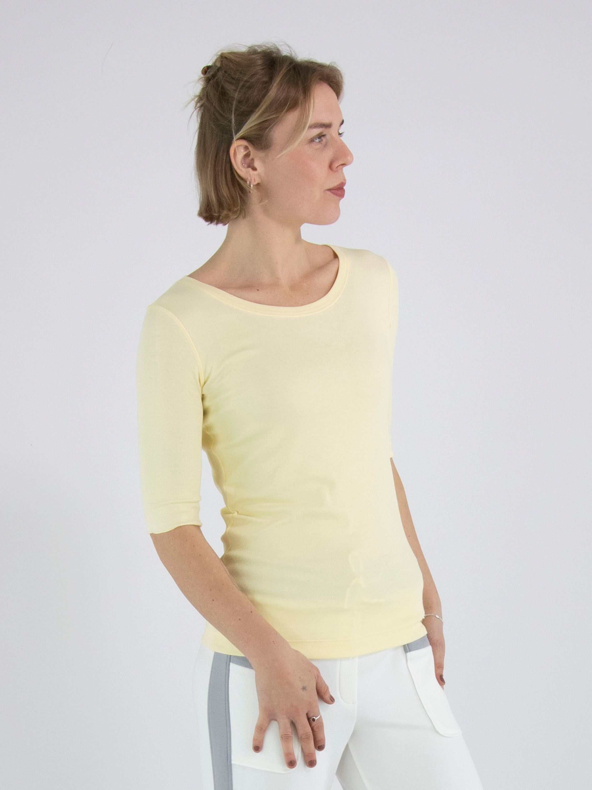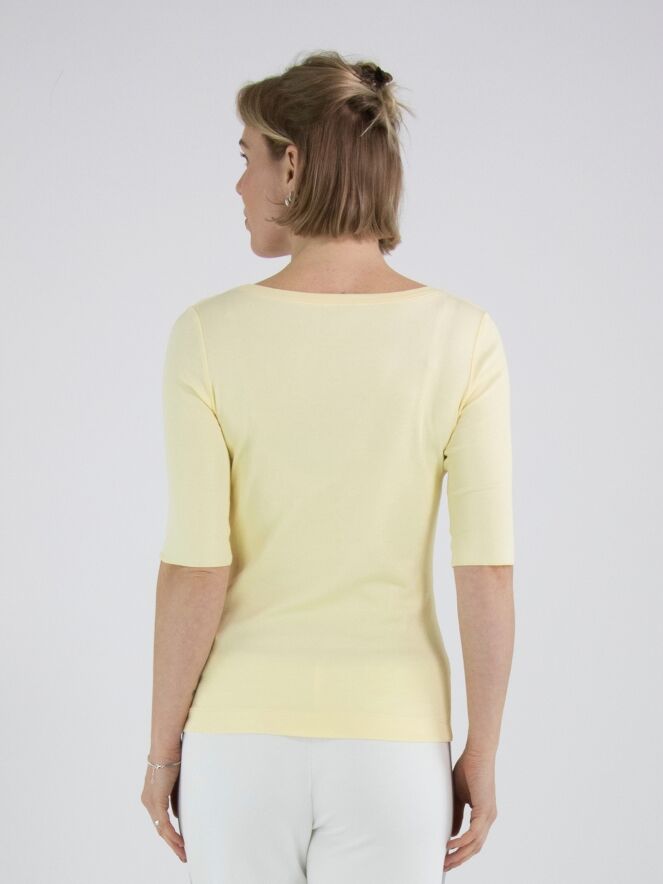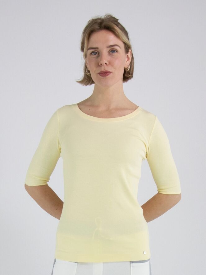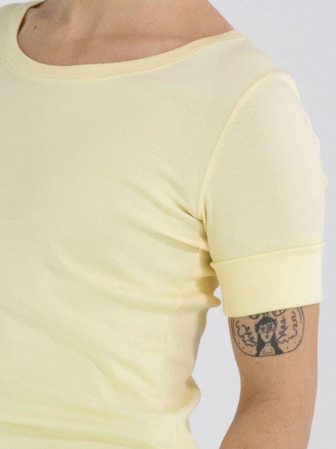 Shirt by Marc Cain made from a finely ribbed fabric in a soft pastel yellow shade. Featuring a round neckline and short sleeves with a chic turn-up detail, it offers a fresh and feminine look. This exclusive designer top can be washed at 30 degrees.