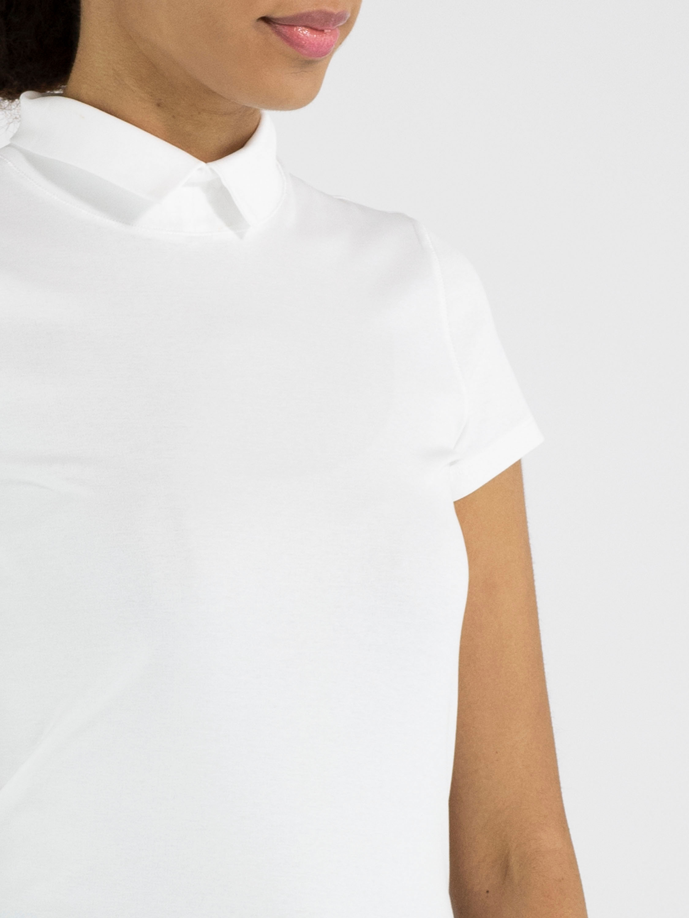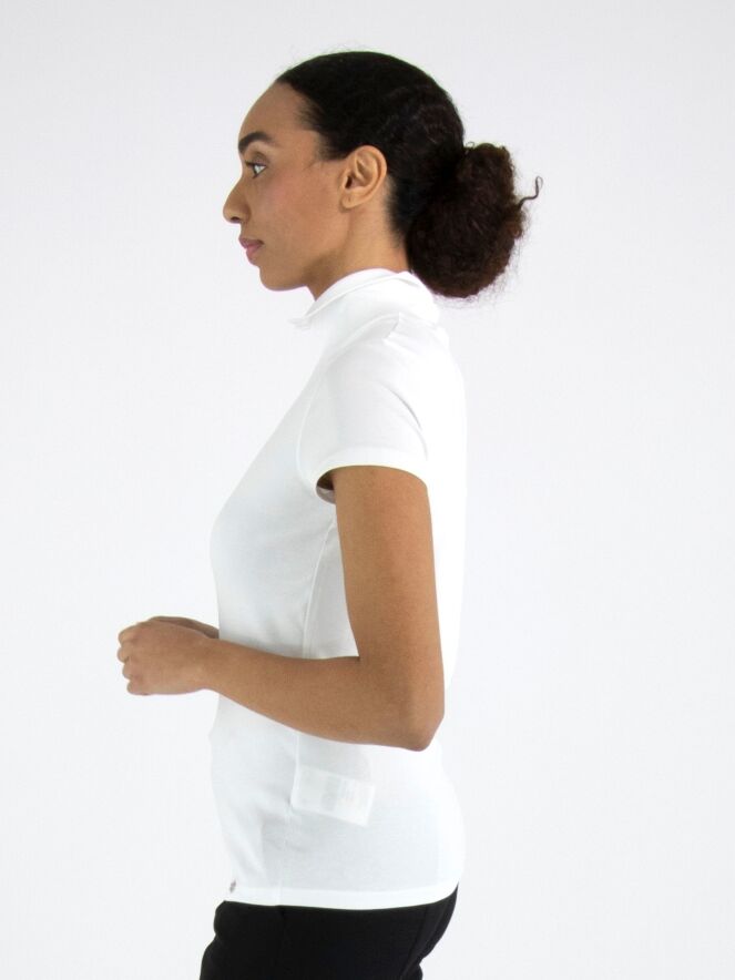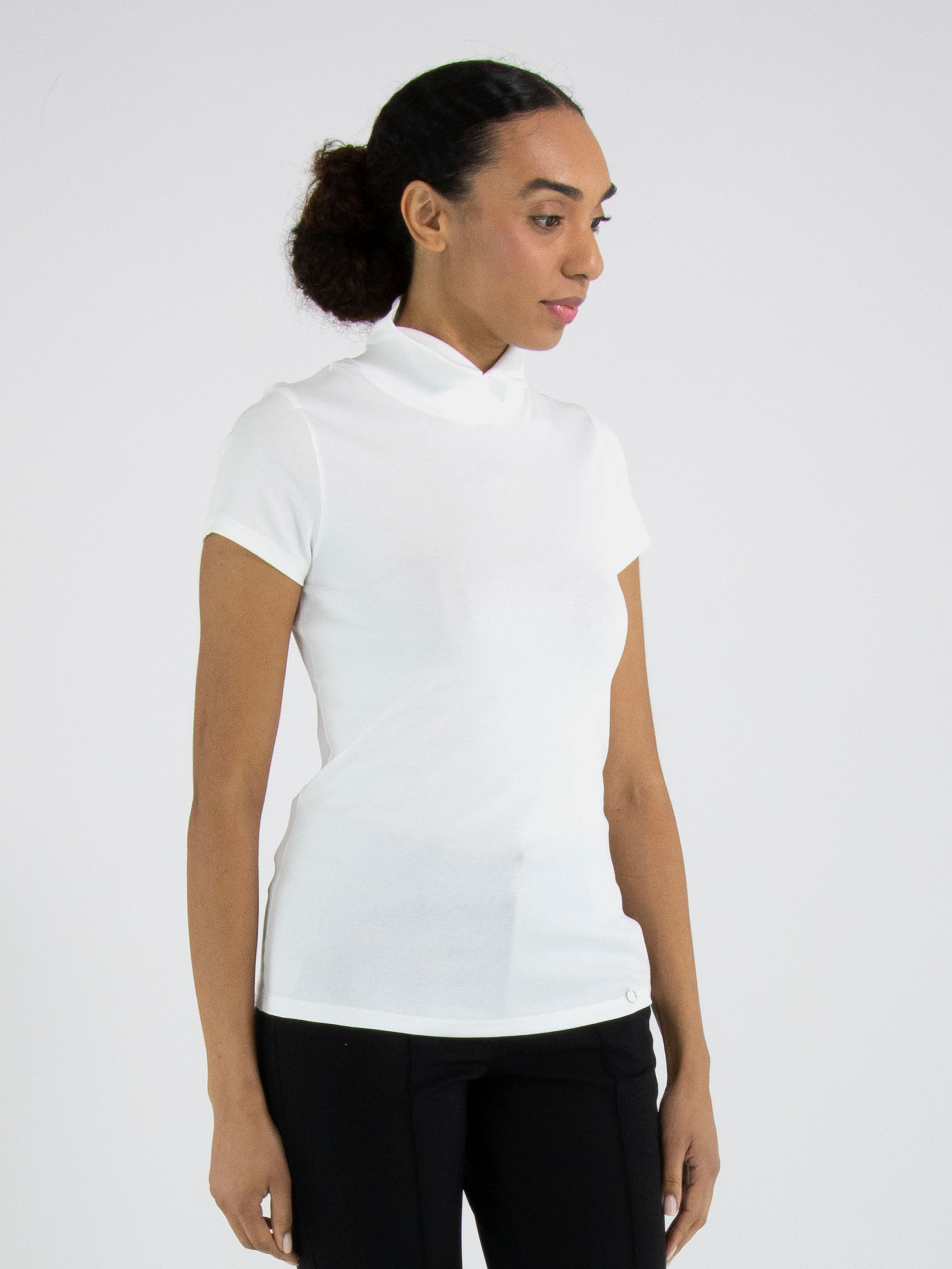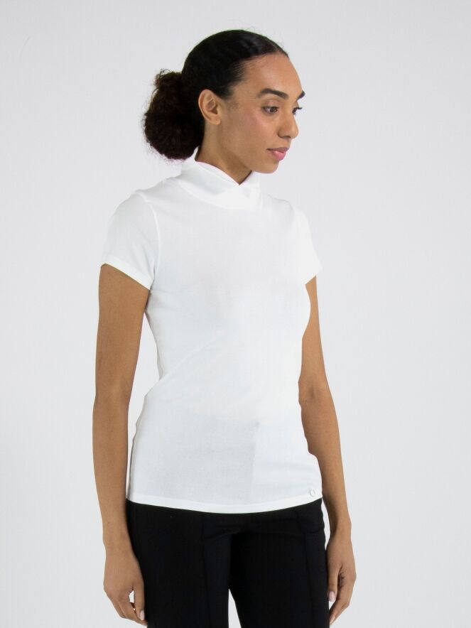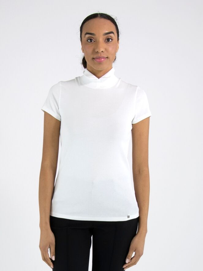 Shirt by Marc Cain in white. This elegant top features short sleeves and a refined turtleneck with a small front slit, creating a modern and feminine look. This exclusive designer piece can be washed at 30 degrees.