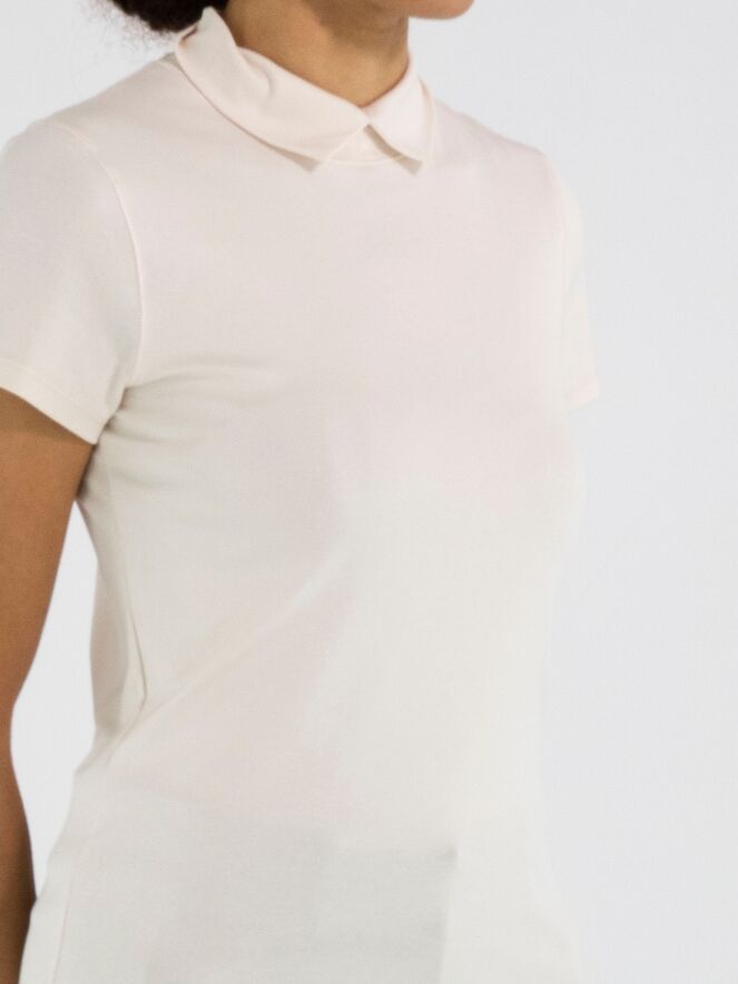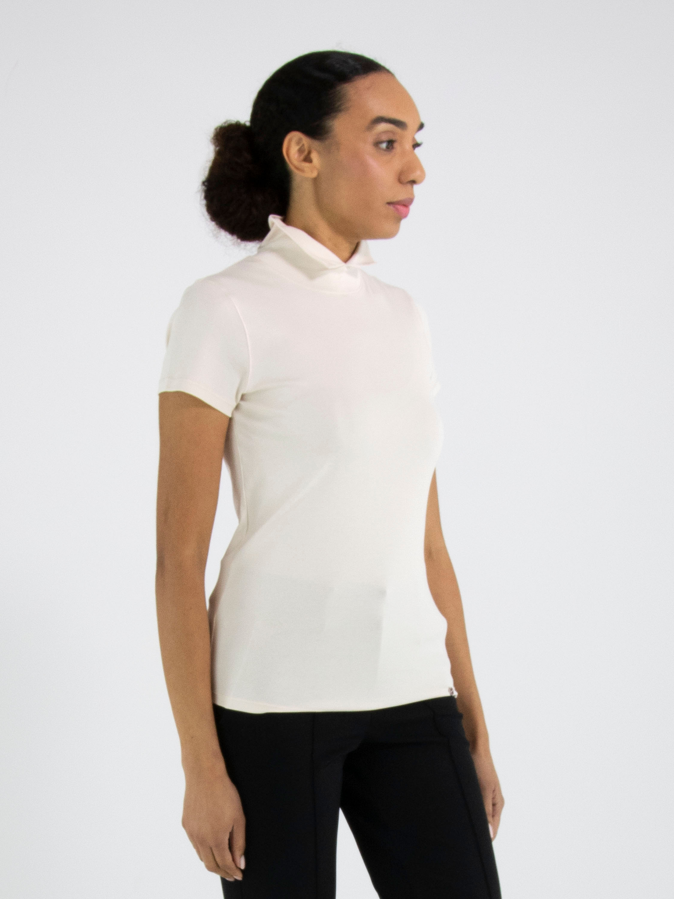Shirt by Marc Cain in beige. Featuring short sleeves and a turtleneck with a small front slit, this piece offers a refined and feminine look. This exclusive designer top can be washed at 30 degrees.
