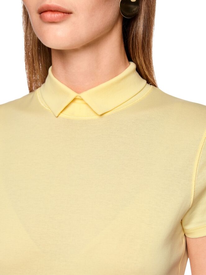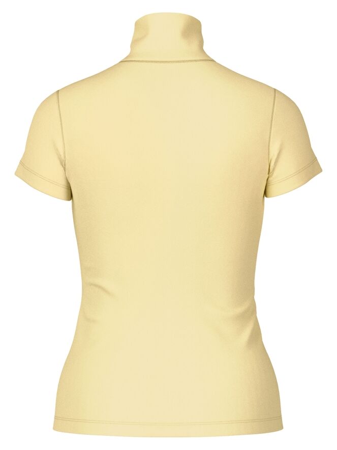 Shirt by Marc Cain in a soft pastel yellow shade. Featuring short sleeves and a turtleneck with a small front slit, it offers an elegant and feminine look. This exclusive women’s top can be washed at 30 degrees.