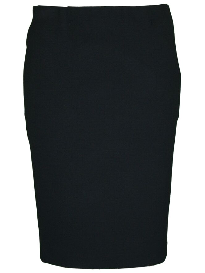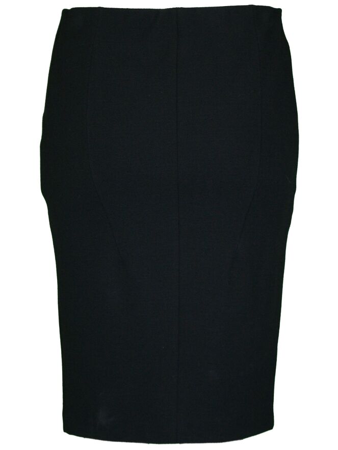 A skirt of the brand Marc Cain in the color black. The waist has an incorporated elastic band and the skirt is lined. This skirt falls just above the knee and can be washed by hand.