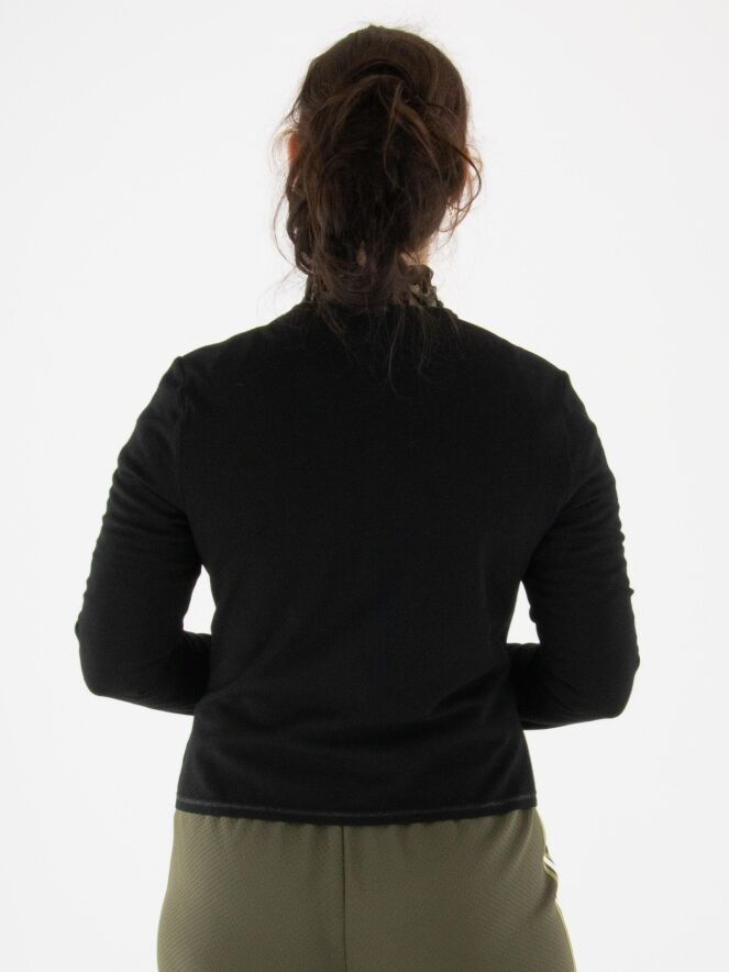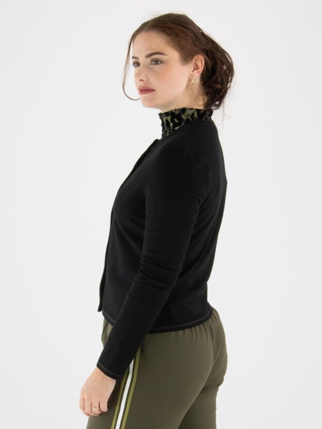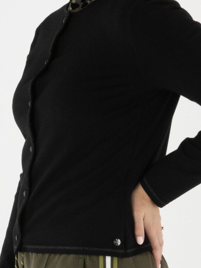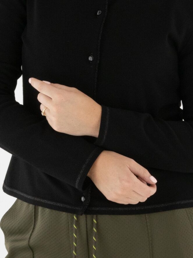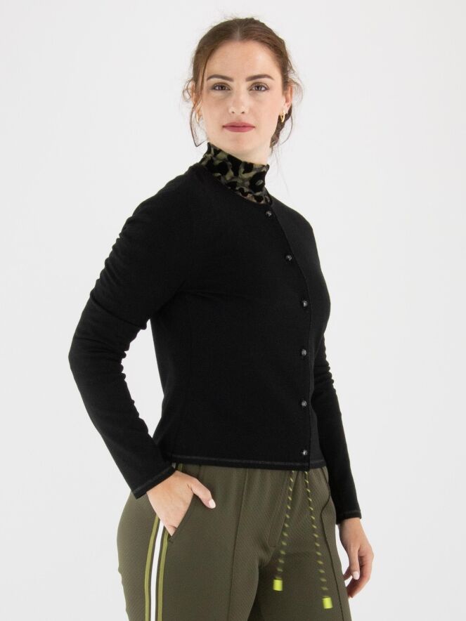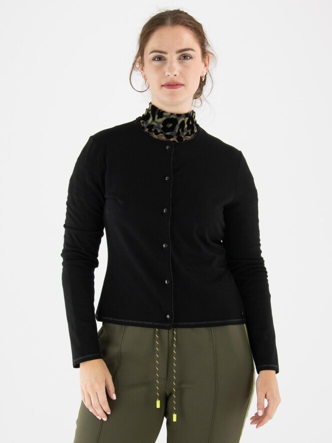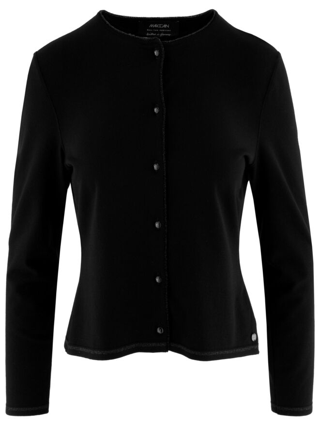 A short cardigan by Marc Cain in black. Along the neckline and fastening runs a trim woven with black metallic thread. The bottom edge features a narrow, finely ribbed knit band matching the trim. This cardigan can be washed at 30 degrees.