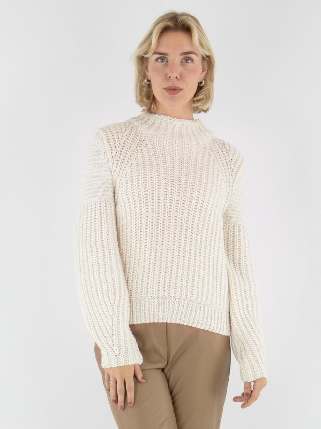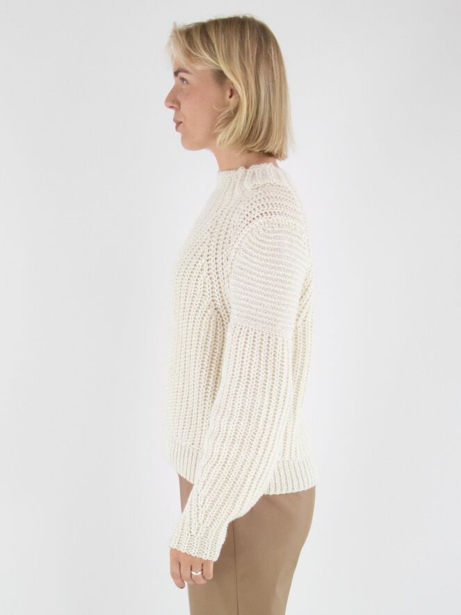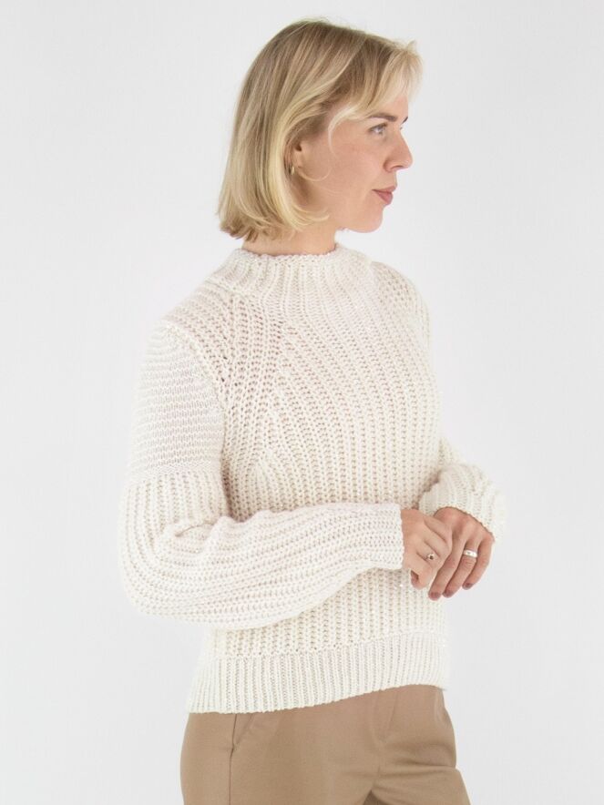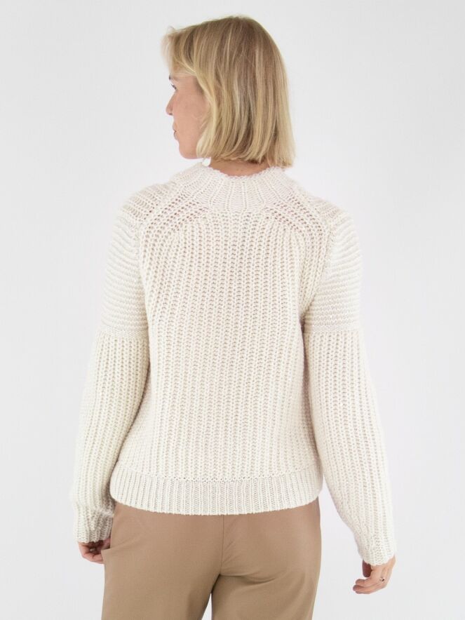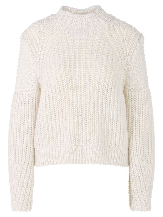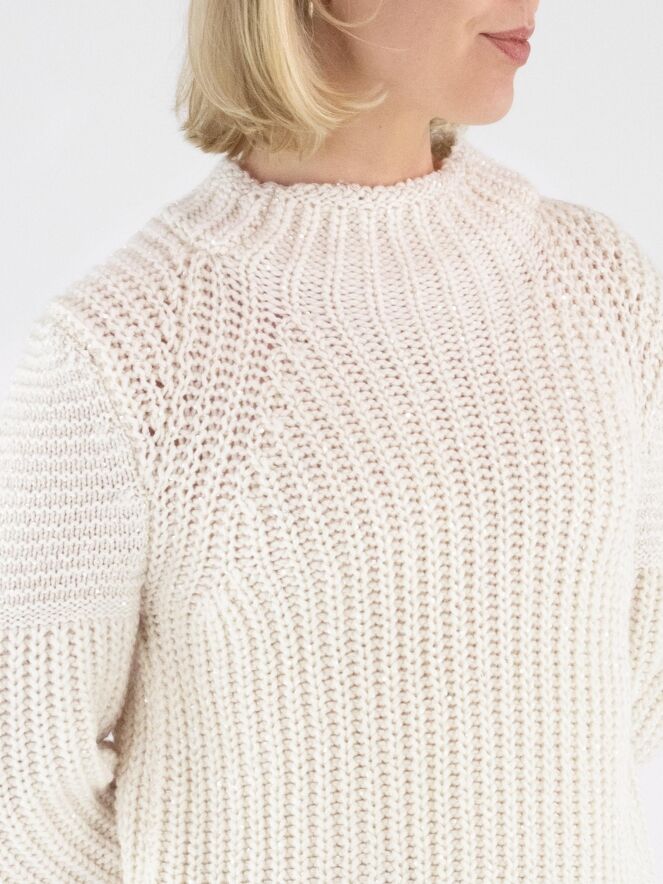 A pullover by Marc Cain in off-white. The patent stitch is adorned with shimmering silver sequins. The pullover features a turtleneck and should be hand washed.