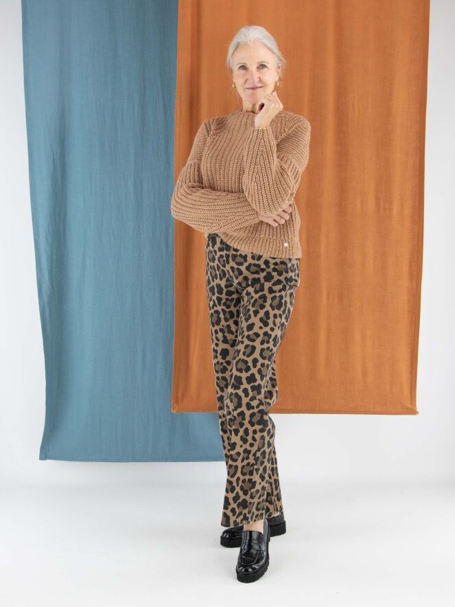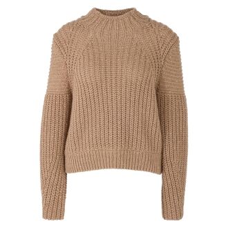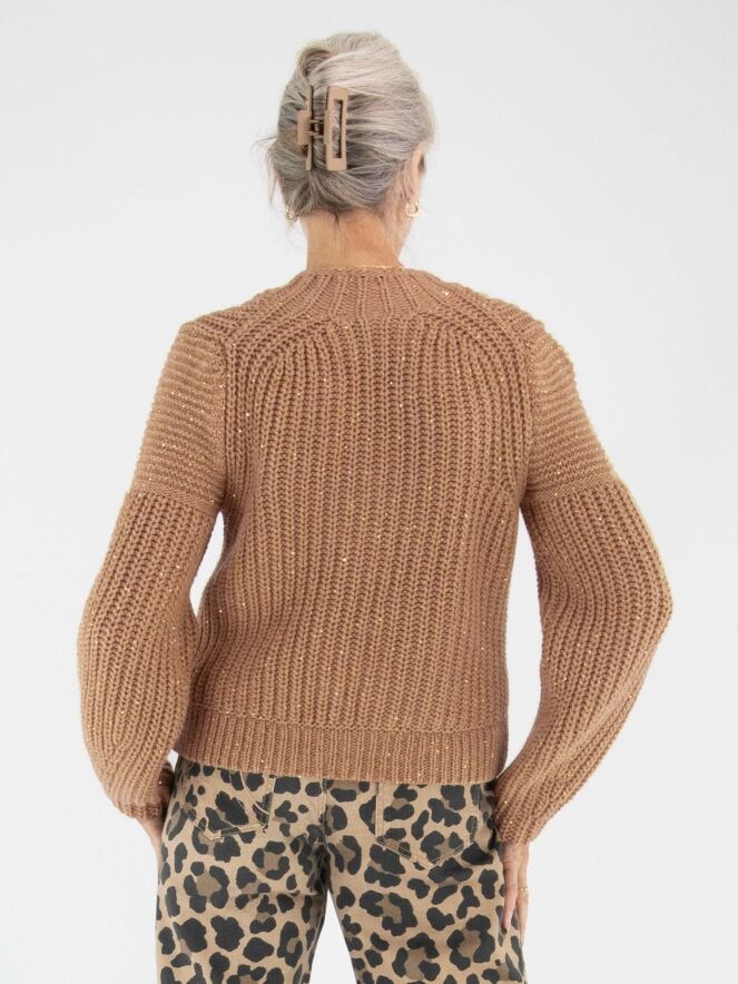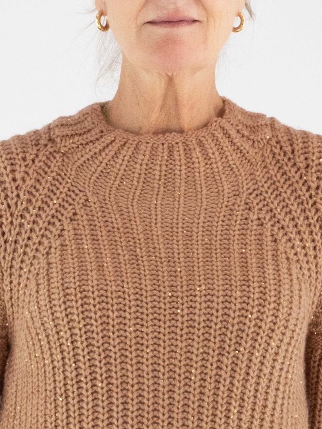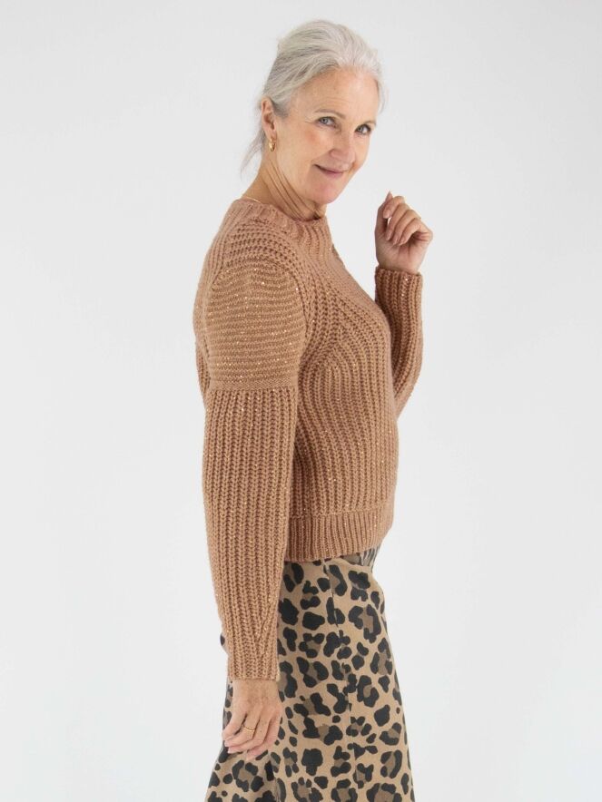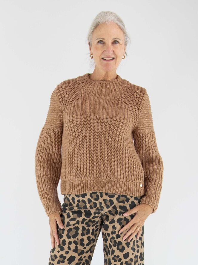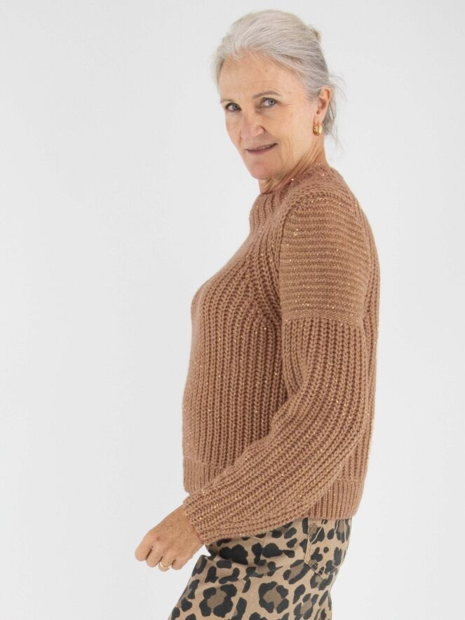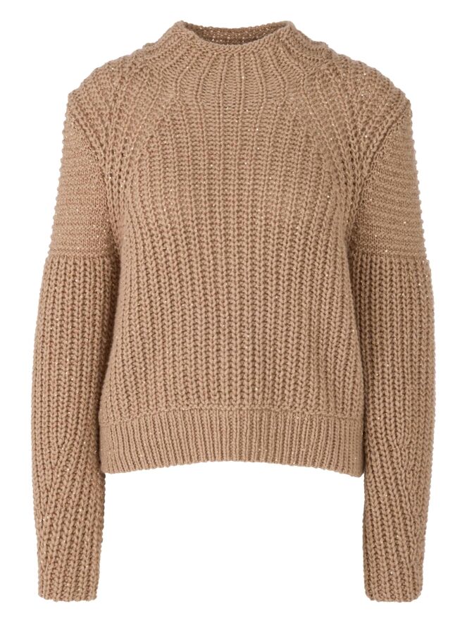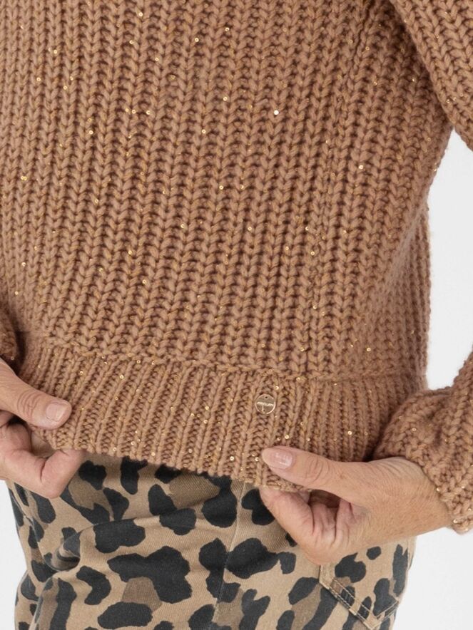 A pullover by Marc Cain in camel. The patent stitch is embellished with shimmering camel-colored sequins. The pullover features a turtleneck and should be hand washed.