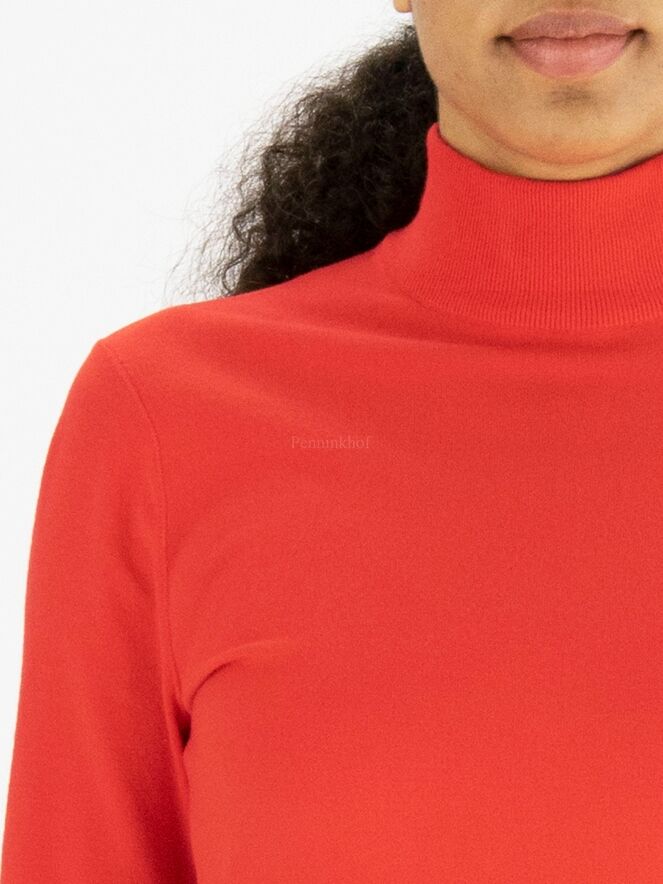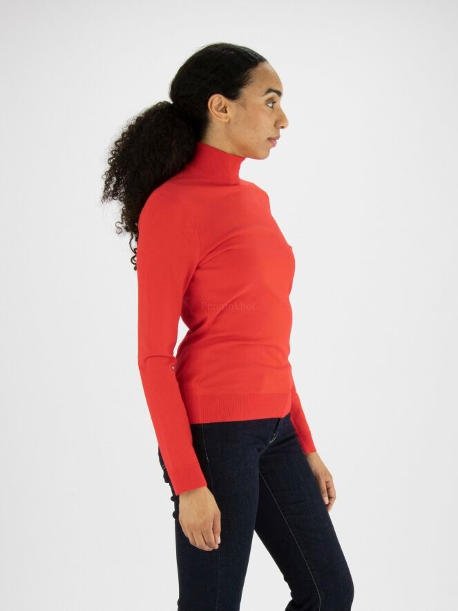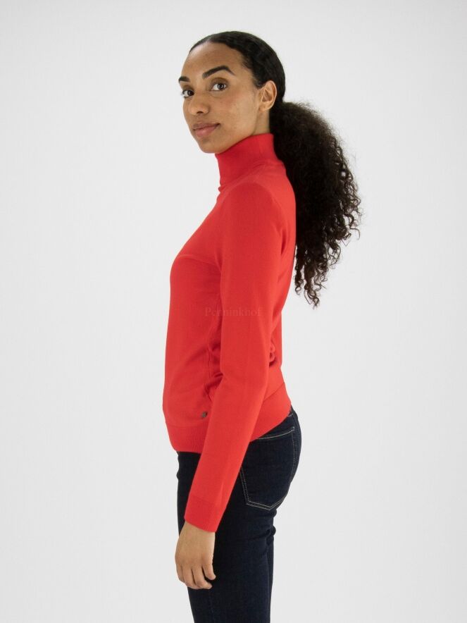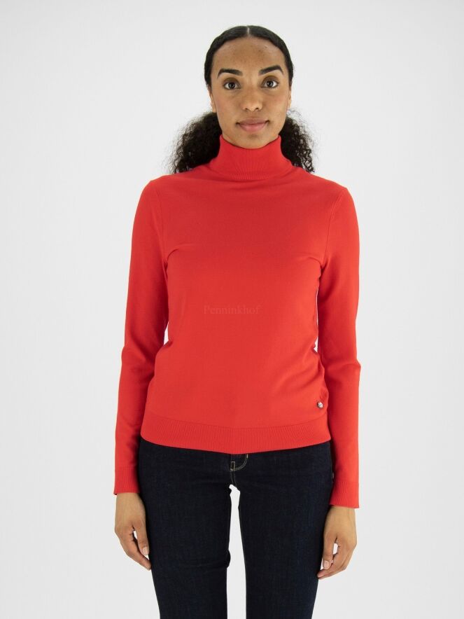 A pullover from Marc Cain in the color red. The pullover has long sleeves and a turtle neck. At the bottom of the pullover and at the end of the sleeves is a finely ribbed tricot collar. This pullover can be washed at 30 degrees.