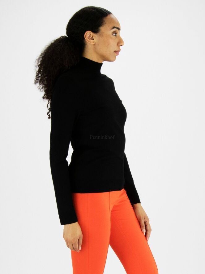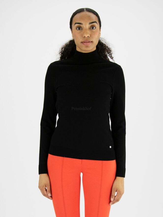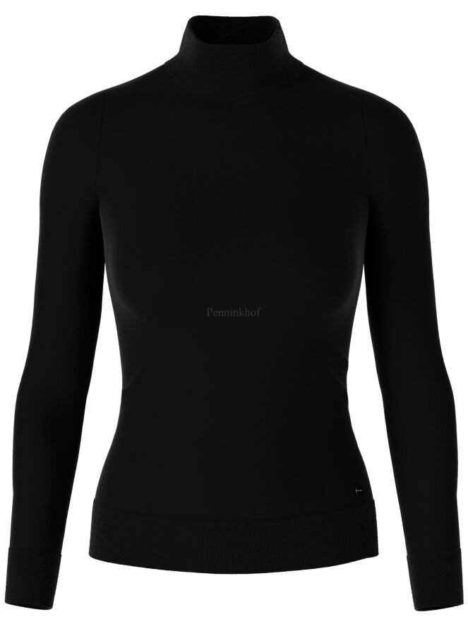 A pullover from Marc Cain in the color black. The pullover has long sleeves and a turtle neck. At the bottom of the pullover and at the end of the sleeves is a finely ribbed tricot collar. This pullover can be washed at 30 degrees.