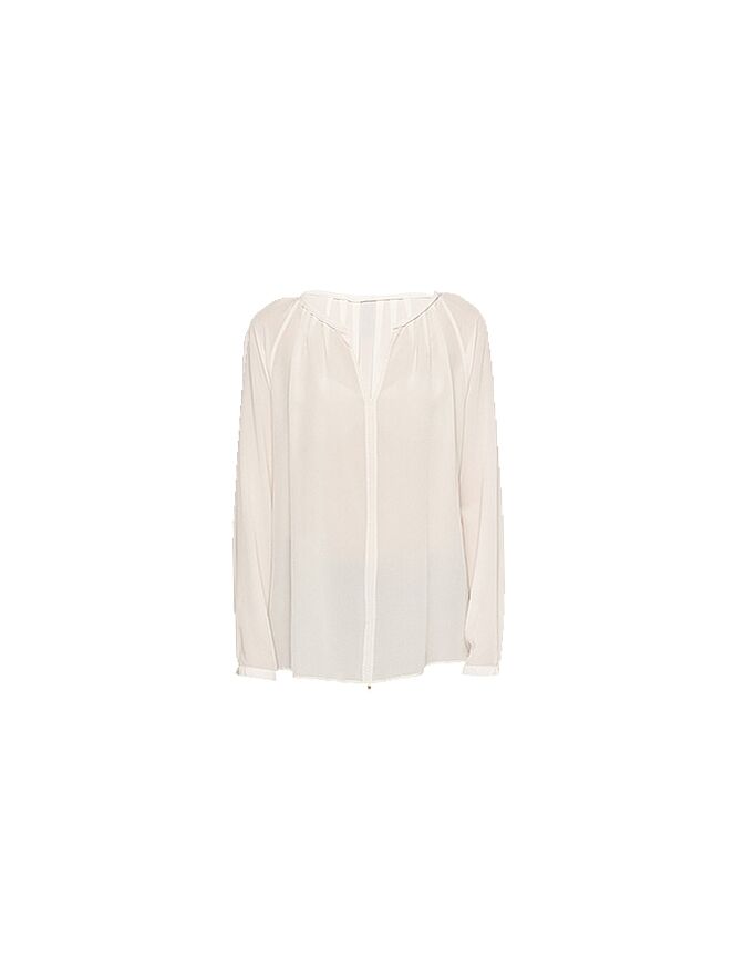 A blouse from the brand Marc Cain in a plain color ecru. In the round neckline is a small piece of metal used in brass color. The blouse is downwards out wide and has in the middle a band of double fabric that is fine stitching. This shirt can be washed by hand.