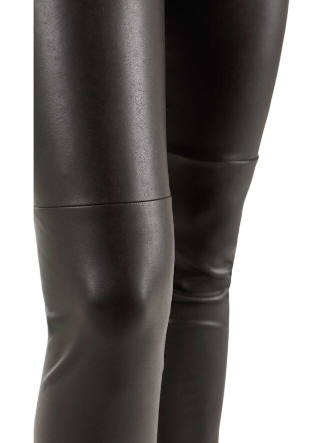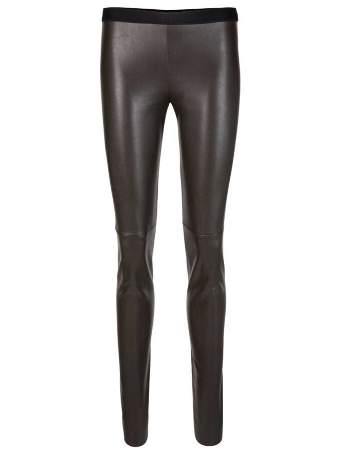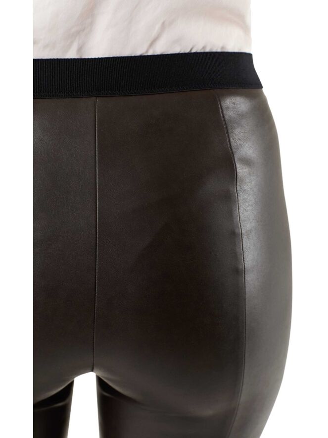 Pants by the brand Marc Cain essentiels in an imitation leather fabric in the color mocha brown. The fabric is elastic. At the waist is an elastic band of 3 cm wide. These pants can be washed at 30 degrees.