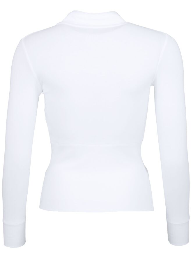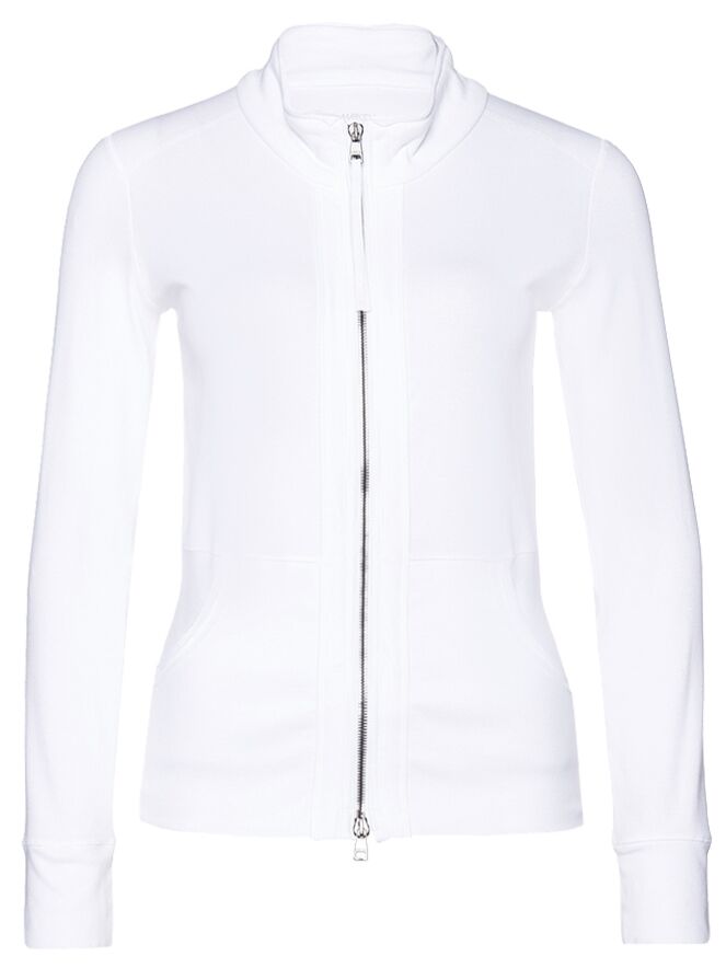 A short Cardigan by the brand Marc Cain in the color white. At the front are 2 bags, round cut. Along the zipper runs on both sides a solid band. This vest can be washed at 30 degrees.