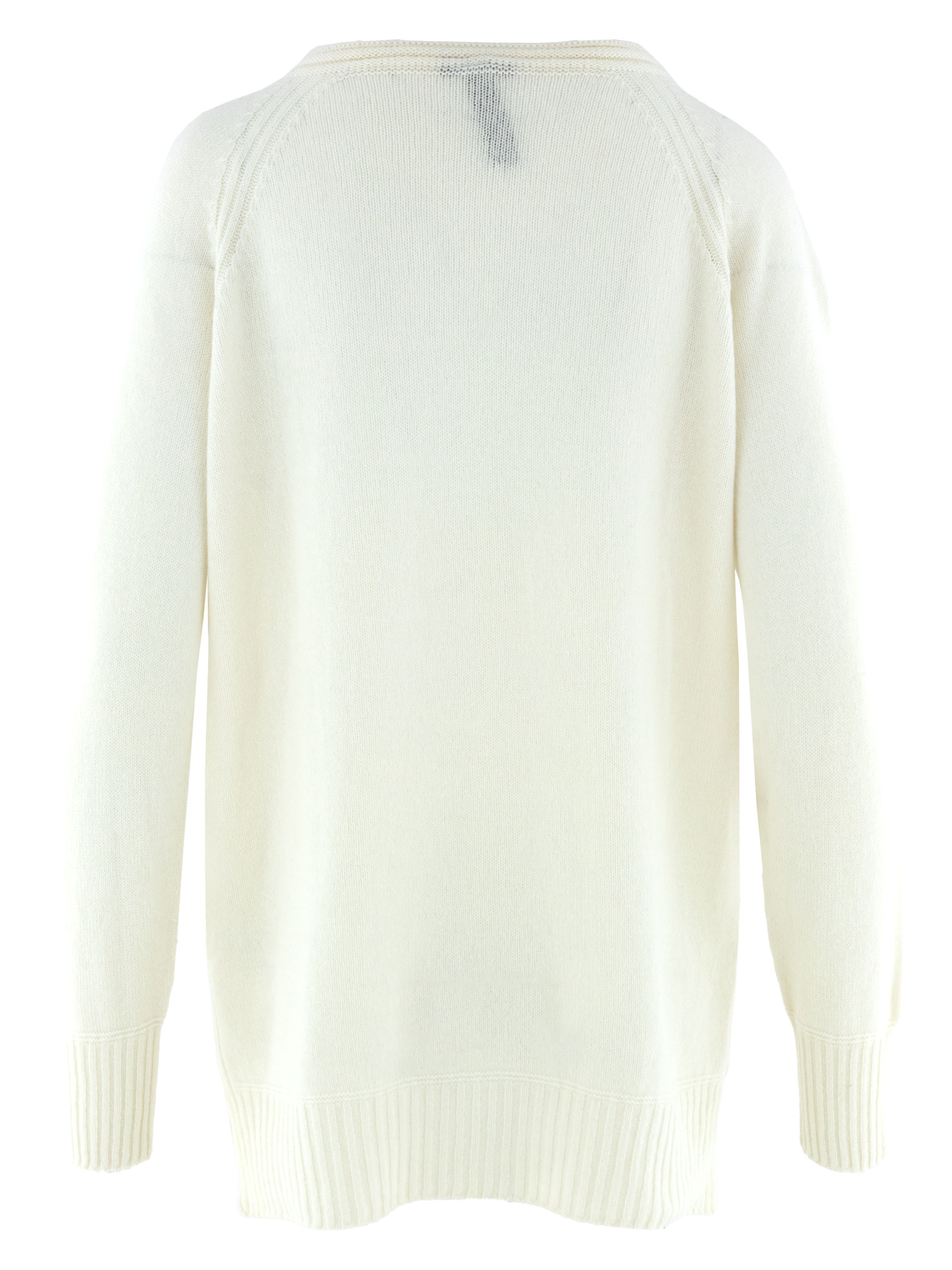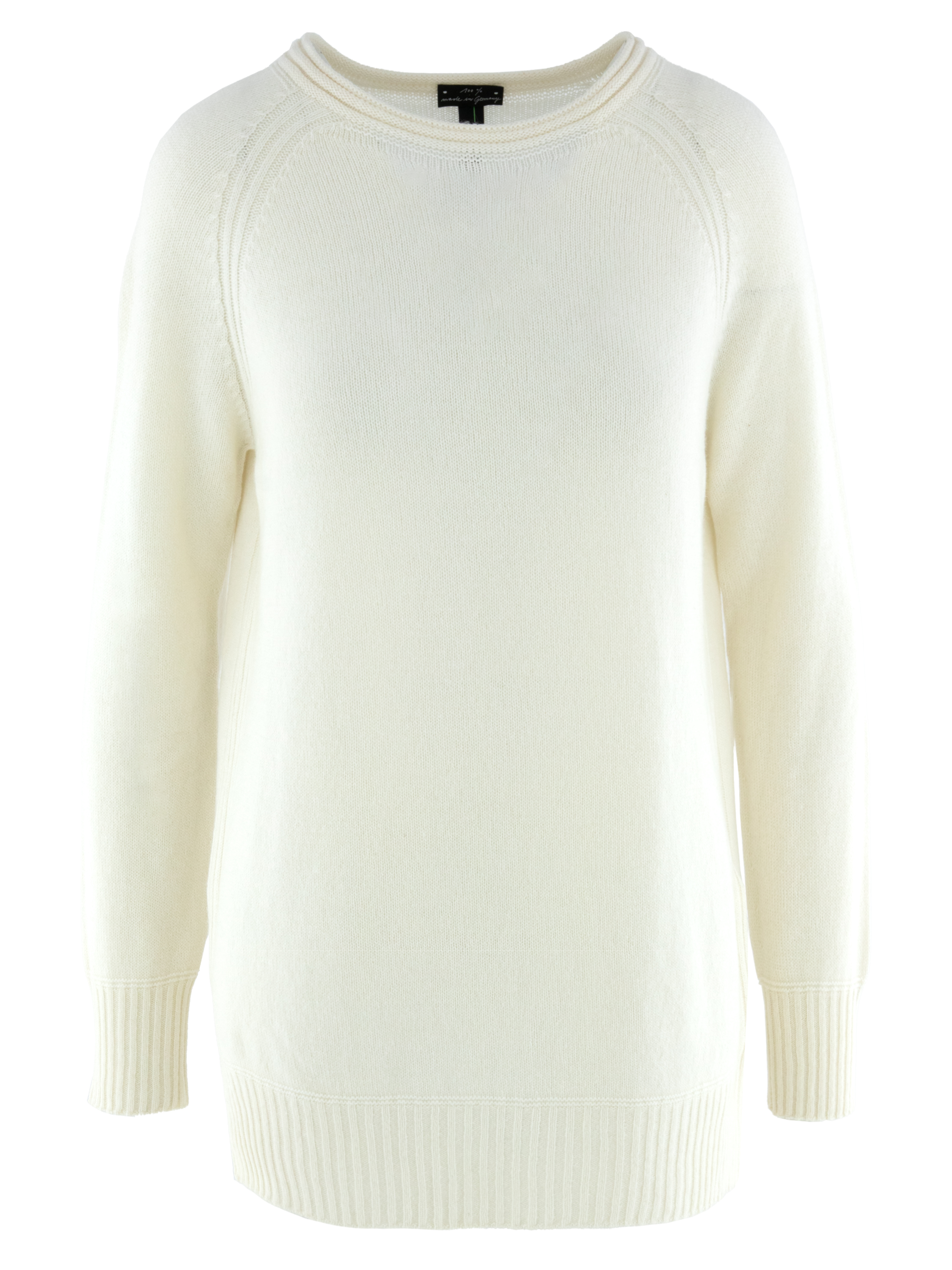 A pullover from Marc Cain in the color cream white. The pullover has a round neck with a piping. At the end of the sleeves and at the bottom of the pullover is a wide hem. This pullover can be washed by hand.