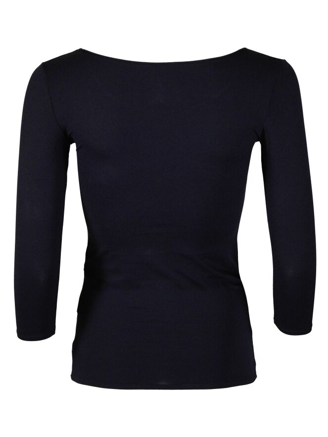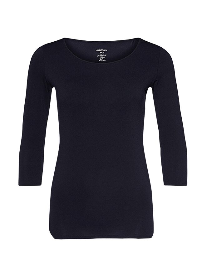 A panty shirt of the brand Marc Cain essentiels in the color navy bleu. The shirt fits nicely on the skin and is slightly fitted. The round neck lining has a narrow band and the shirt has long sleeves. This shirt can be washed at 30 degrees.
