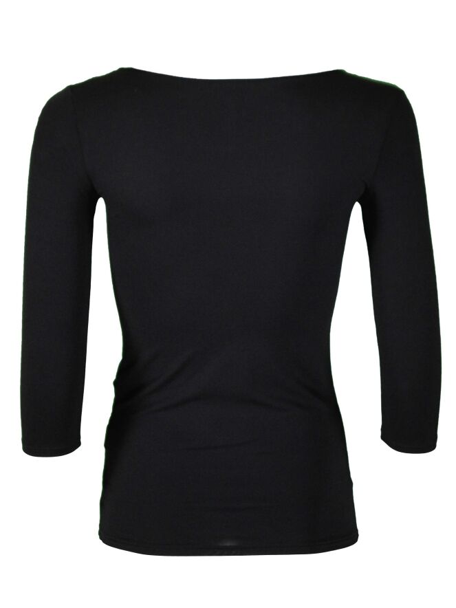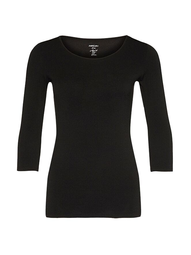 A panty shirt of the brand Marc Cain essentiels in the color black. The shirt fits nicely on the skin and is slightly fitted. The round neck lining has a narrow band and the shirt has long sleeves. This shirt can be washed at 30 degrees.