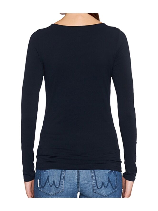 A basic shirt from the brand Marc Cain in the color navy blue. The shirt has long sleeves and a round neck. This shirt can be washed at 30 degrees.
