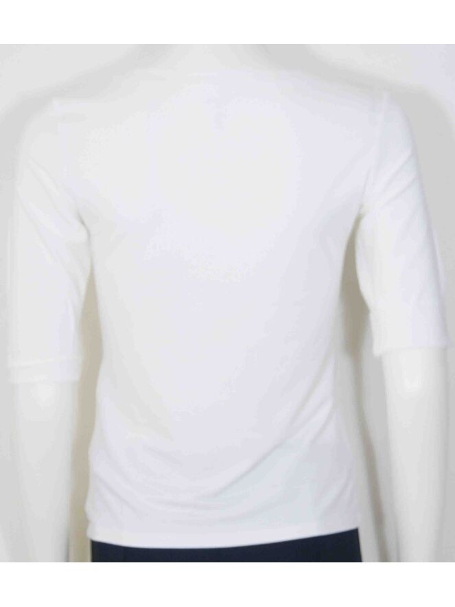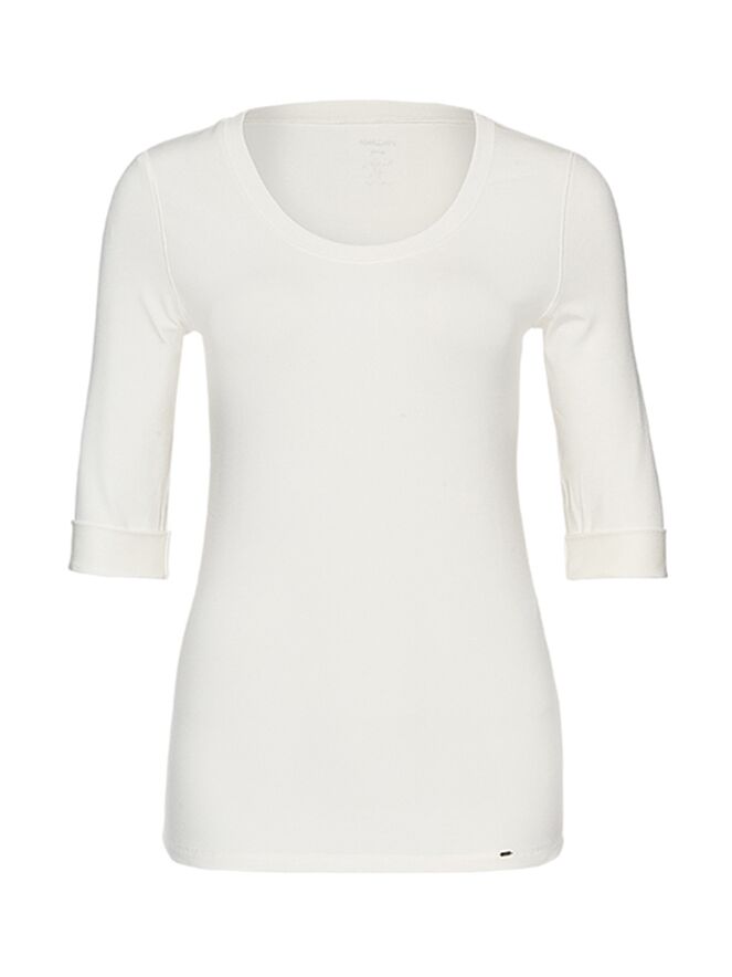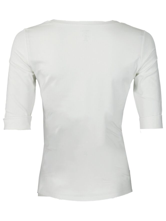 A shirt of the brand Marc Cain Essentiels in the colour off white. The shirt has a round neckline with a band 2 cm wide. The short sleeves have a folder of 3 cm wide. The shirt can be washed at 30 degrees.