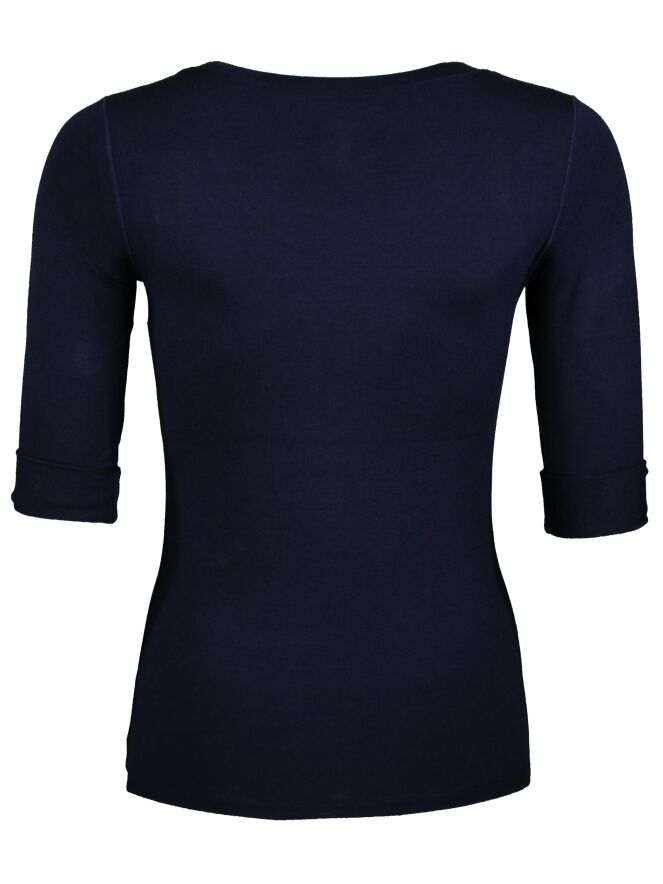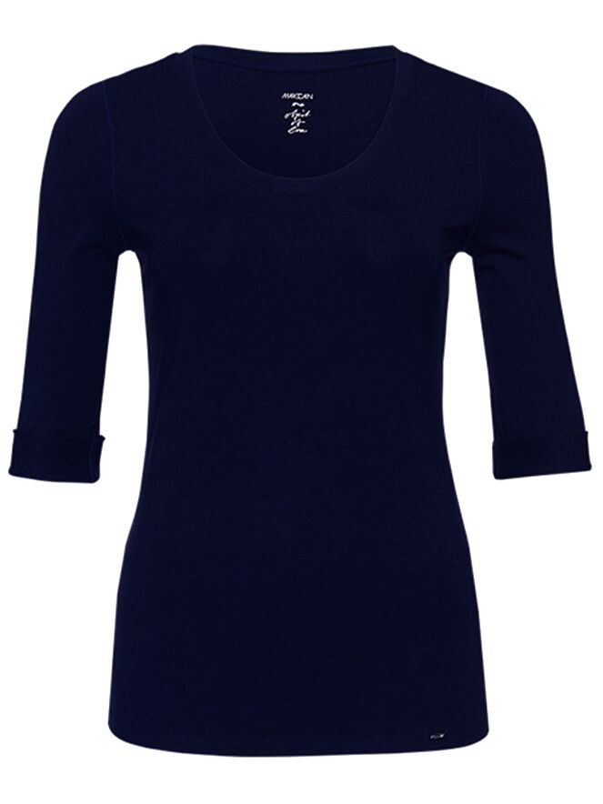 A shirt of the brand Marc Cain Essent m in the colour navy bleu. The shirt has a round neckline with a band 2 cm wide. The short sleeves have a folder of 3 cm wide. The shirt can be washed at 30 degrees.