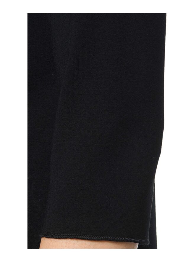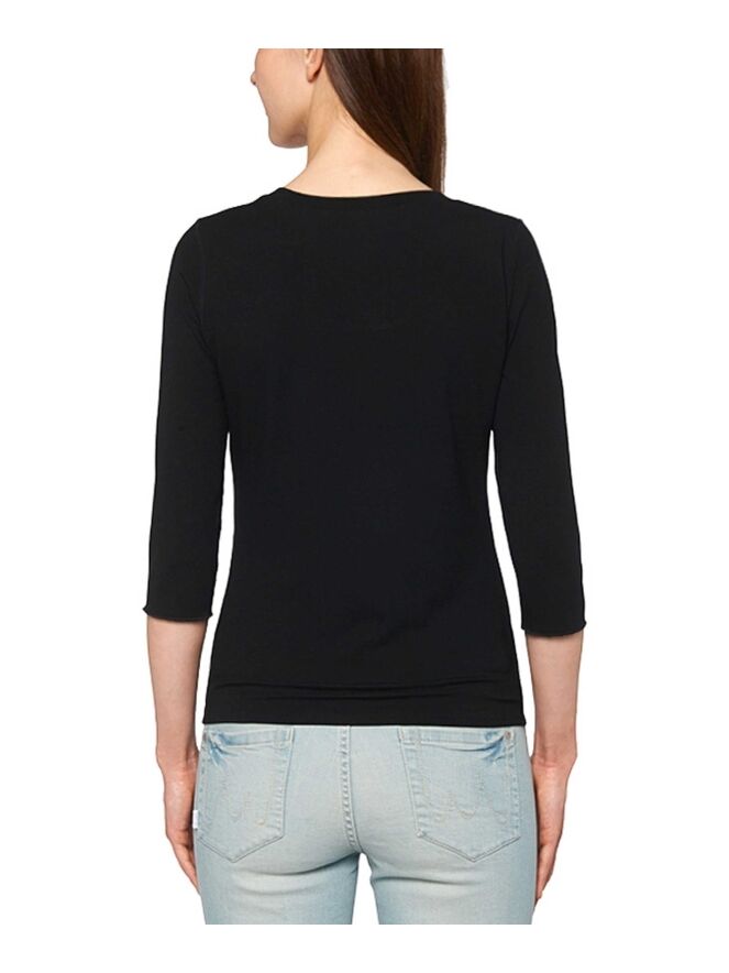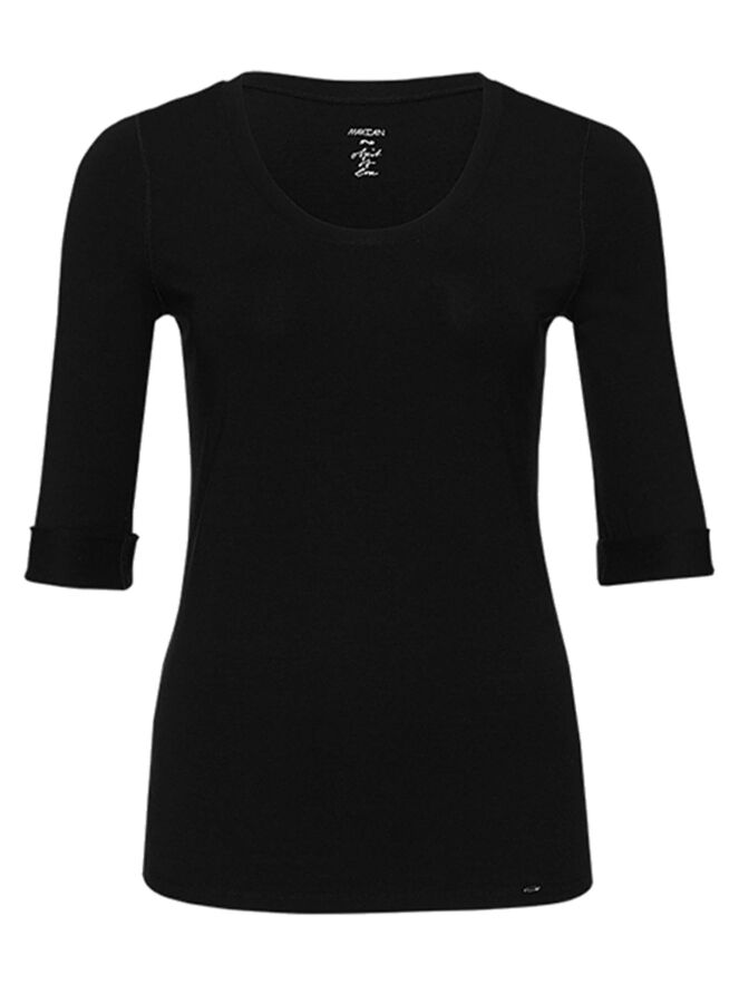 A shirt of the brand Marc Cain Essent m in the colour black. The shirt has a round neckline with a band 2 cm wide. The short sleeves have a folder of 3 cm wide. The shirt can be washed at 30 degrees.