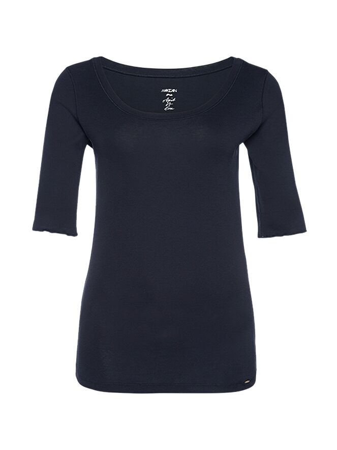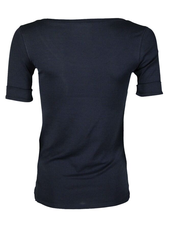 A shirt of the brand Marc Cain from the basic collection in the color Navy Blue. The shirt has a round neckline and a short sleeve with a folder. This shirt can be washed at 30 degrees.