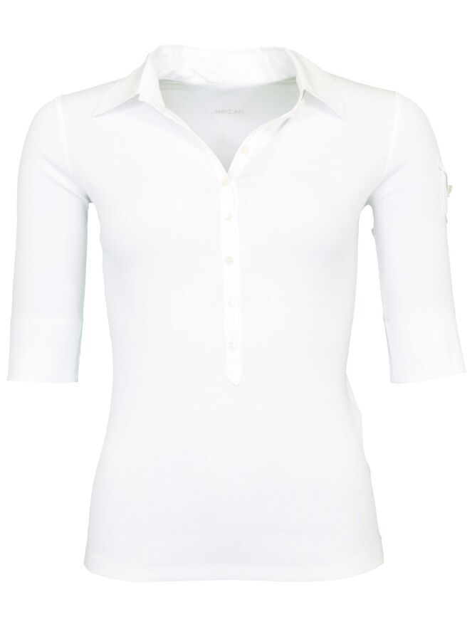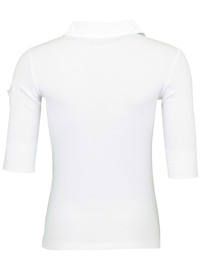 A polo shirt of the brand Marc Cain in the color white. The fabric of the shirt is finely ribbed. On the left sleeve is a small bag. The mat shiny collar is of 100% polyester. This polo shirt can be washed at 30 degrees.