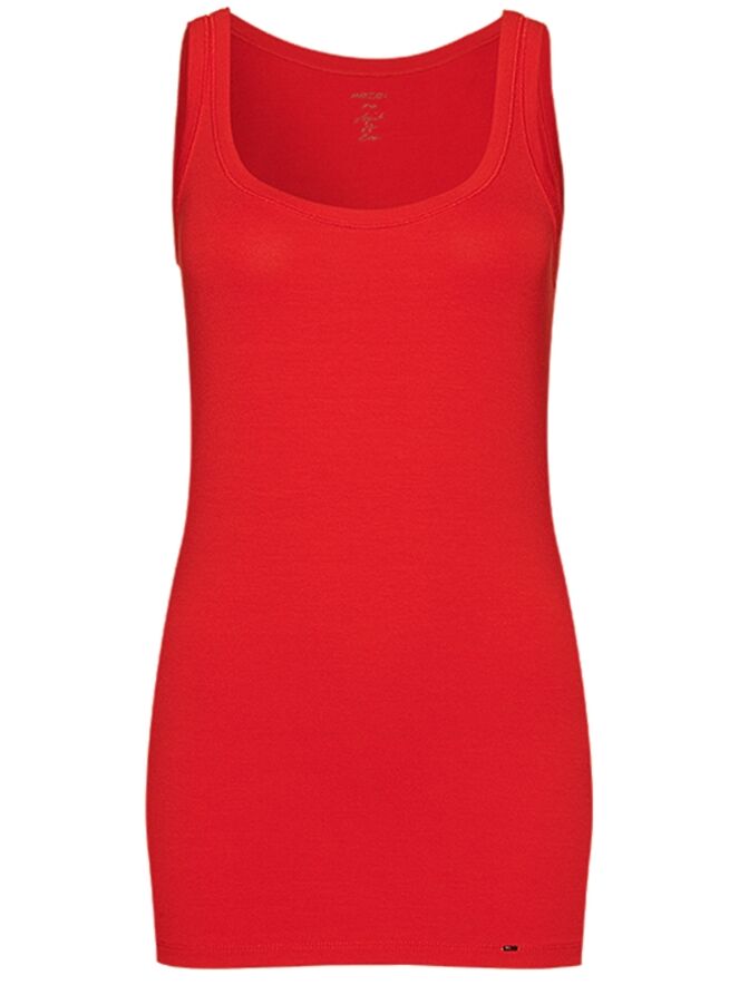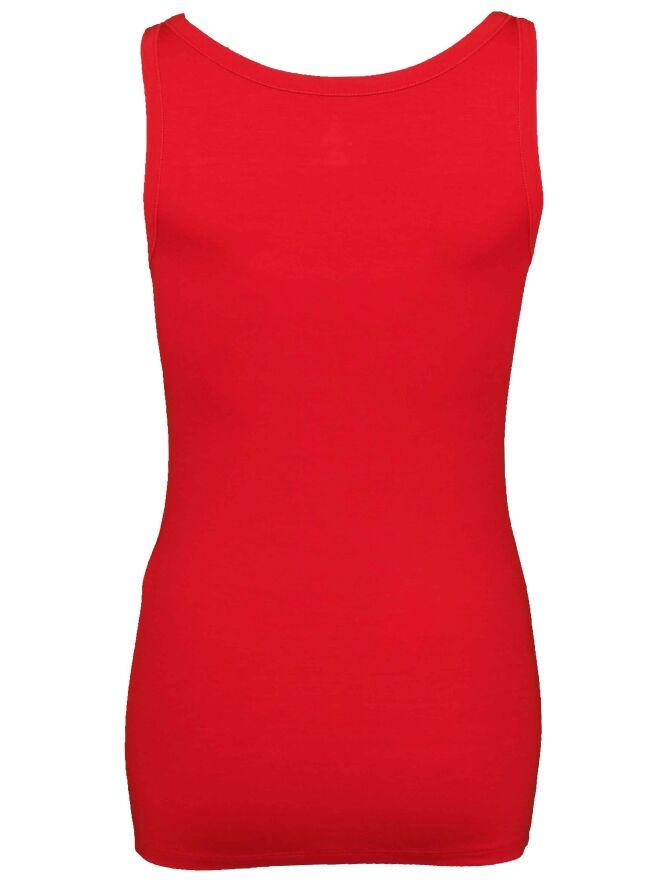 A basic top from the brand Marc Cain in the color red. The viscose makes the fabric feel very soft on the skin. The top has a round neck and is slightly fitted. The shoulder straps are 3 cm wide. This top can be washed at 30 degrees.