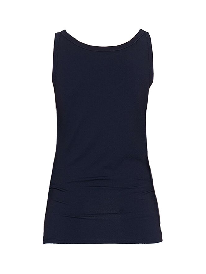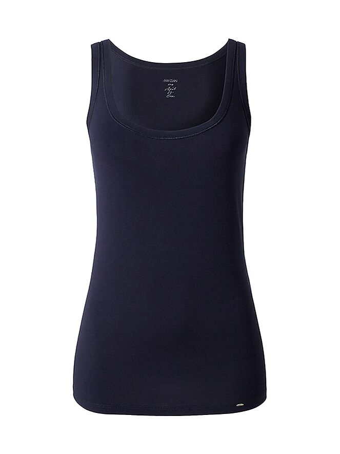 A basic top of the brand Marc Cain in the color navy bleu. The viscose makes the fabric very soft to the touch on the skin. The top has a round neckline and is slightly fitted. The shoulder straps are 3 cm wide. This Summit should be washed at 30 degrees.