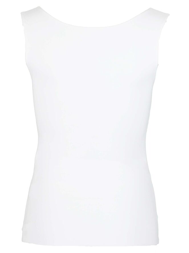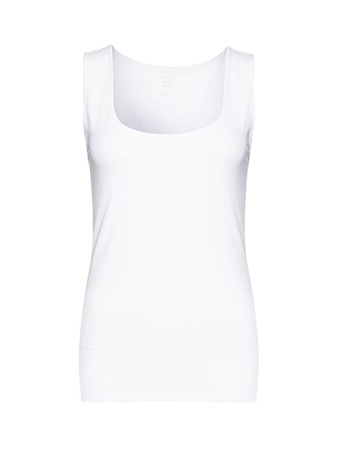 A basic top from the brand Marc Cain essentiels in the color white. The top has a double fabric and the shoulder straps are 4cm wide. The top may be washed at 30 degrees.