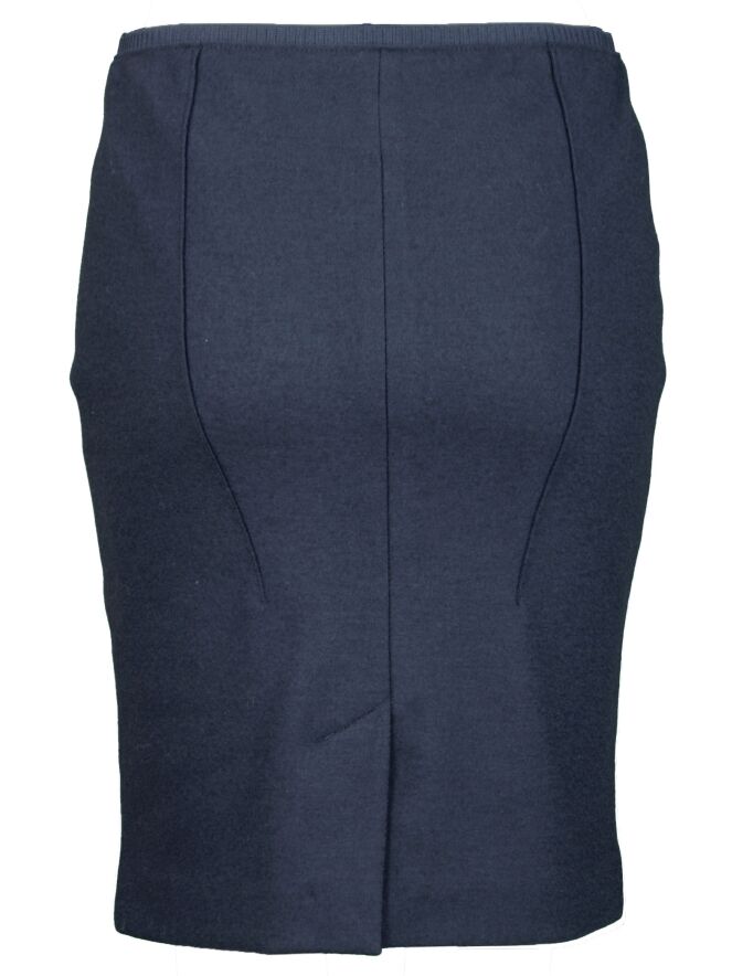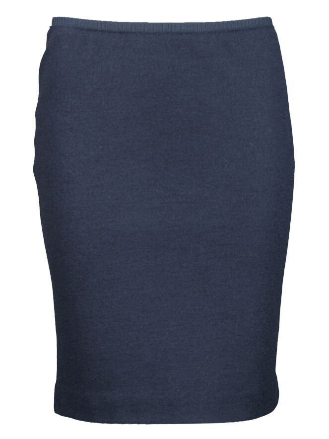 A skirt in the color navy blue by the brand Marc Cain. The skirt has an elastic band 3 cm wide in the waist  and is lined. The skirt falls just above the knee and should not be washed.