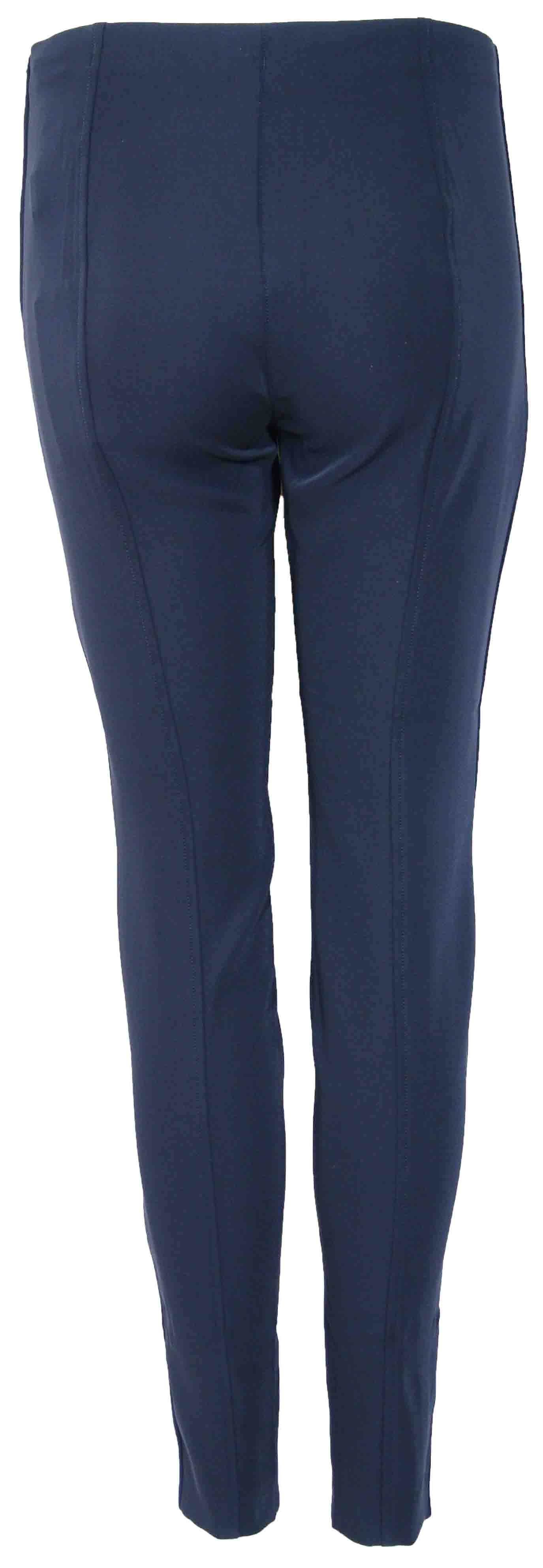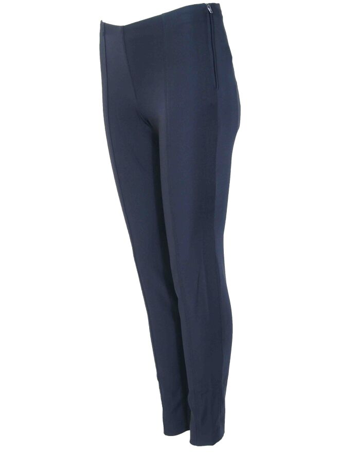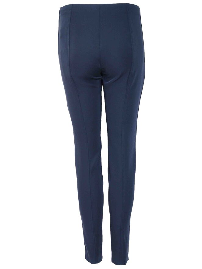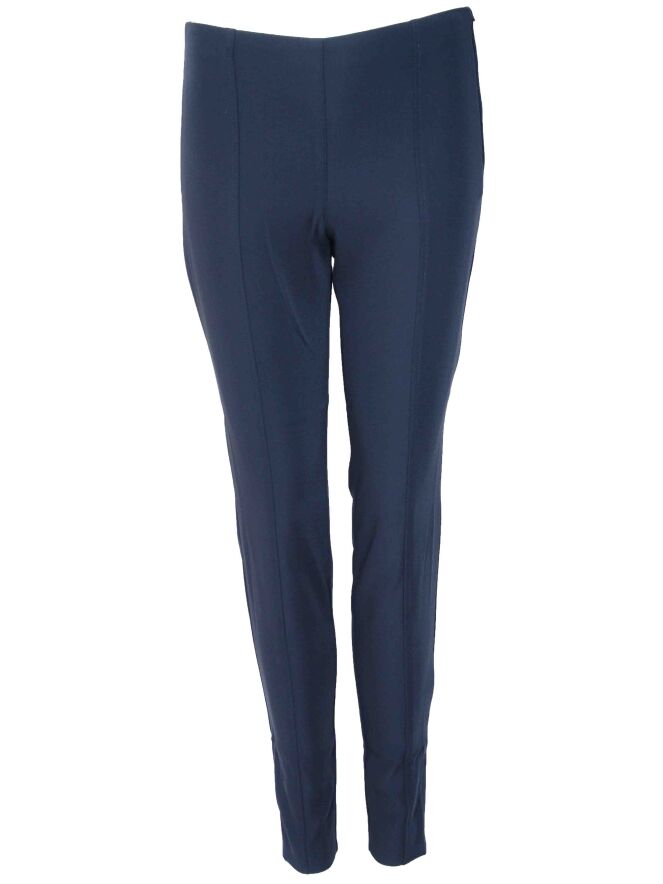 A trouser ofthe brand Marc Cain from the essentiels collection in the color navy bleu. The trouser has an elastic band of 3 cm in the waist and has a seam line across the middle of the pipes on the front as well as on the back side. These pants can be washed at 30 degrees.