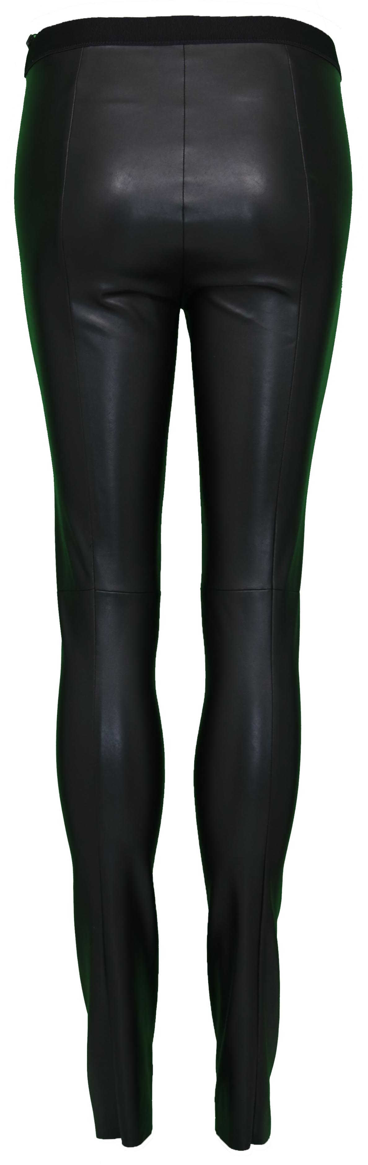 A suit by the brand Marc Cain essentiels in an imitation leather material in the color black. The fabric is elastic. In the waist is an elastic band of 3 cm wide. These pants can be washed at 30 degrees.