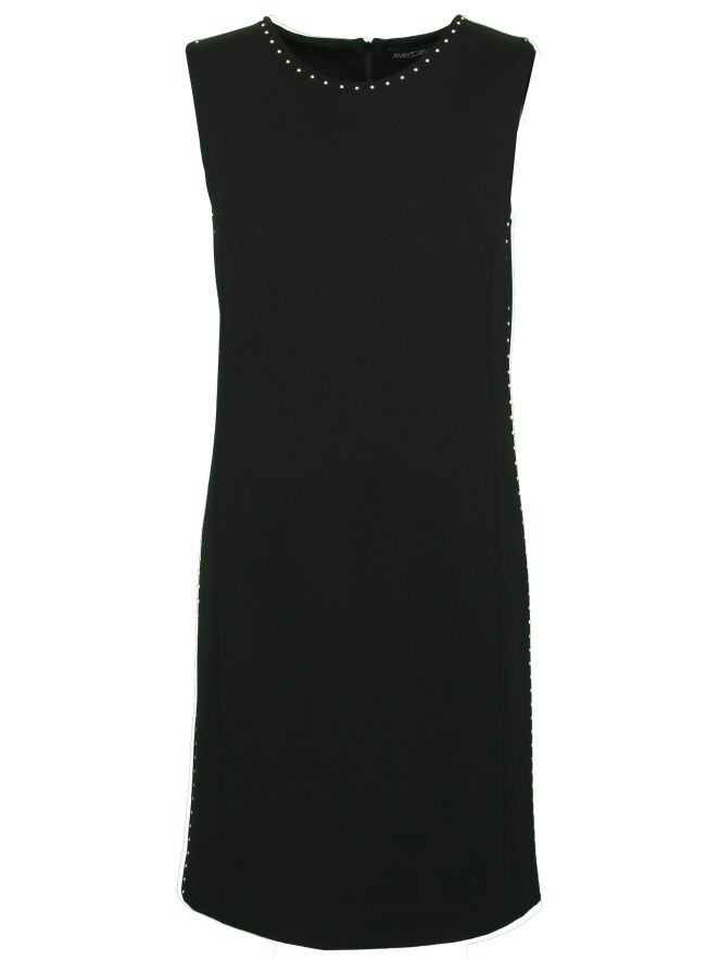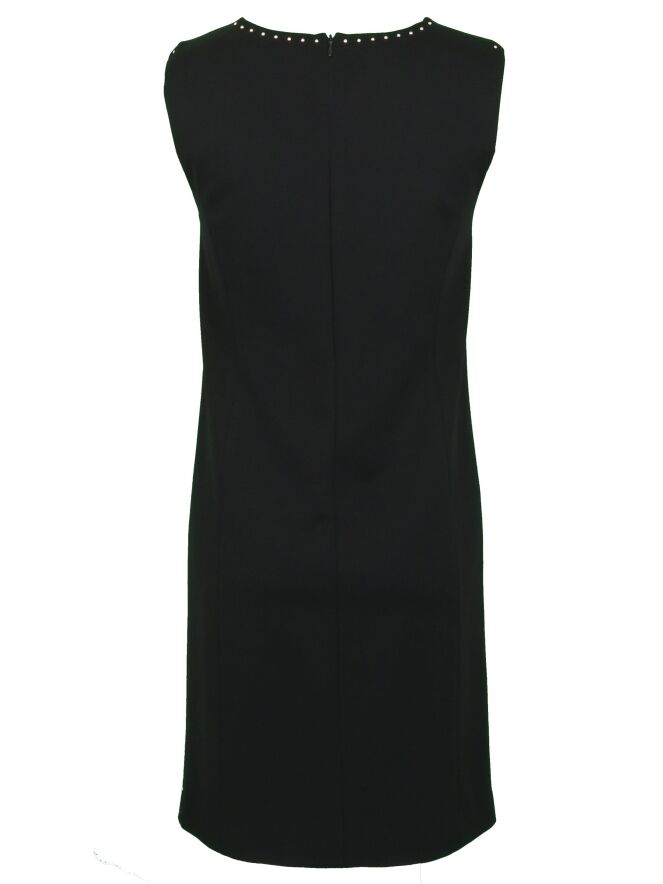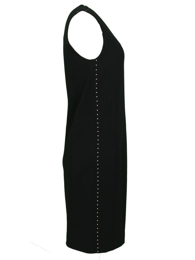 A sleeve lose dress by Marc Cain in the color black. Along the edge of the round neck and along the side seams of the dress are decorative studs in a brass color. The dress is lined and can be washed by hand.