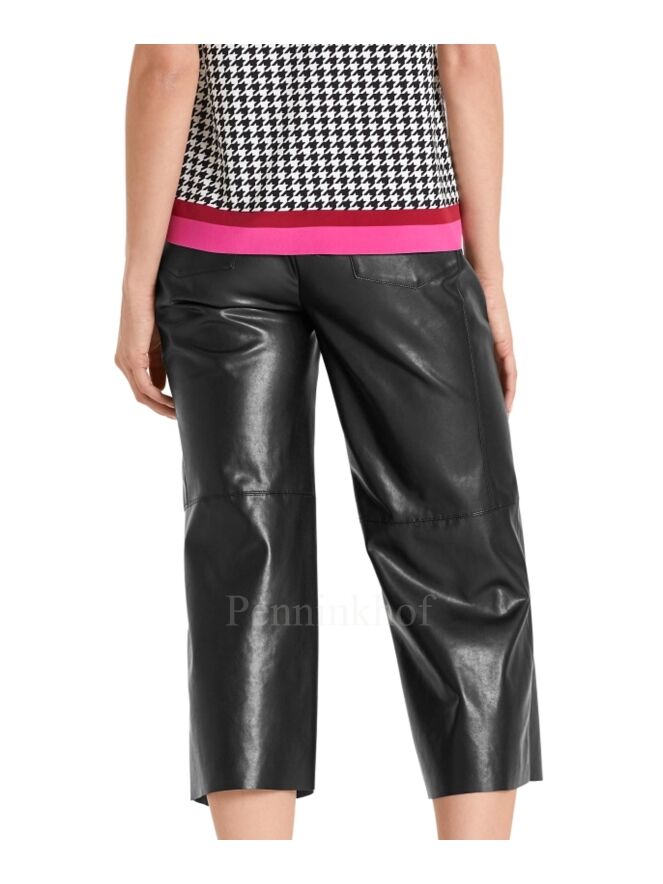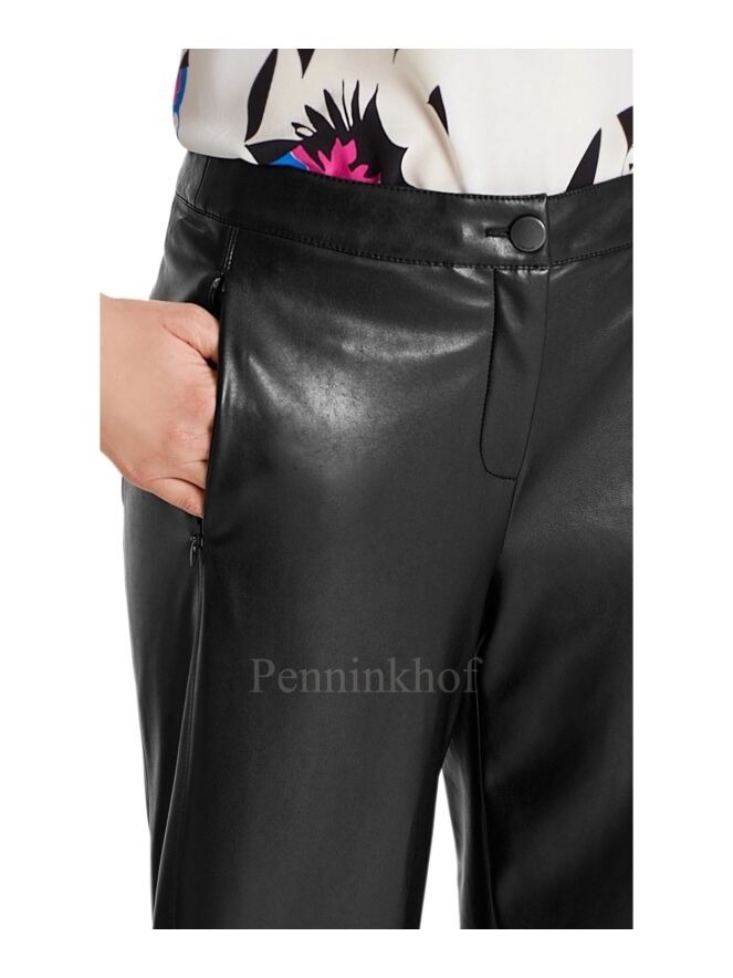 Imitation leather pants from Marc Cain in the color black. The pipes are cut straight. The side pockets have a zipper. There is a horizontal stitching seam at the knee. these pants can be washed at 30 degrees.
